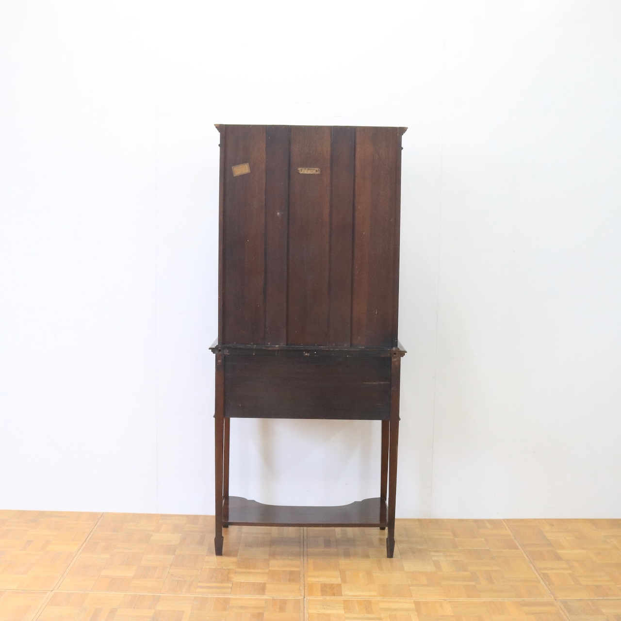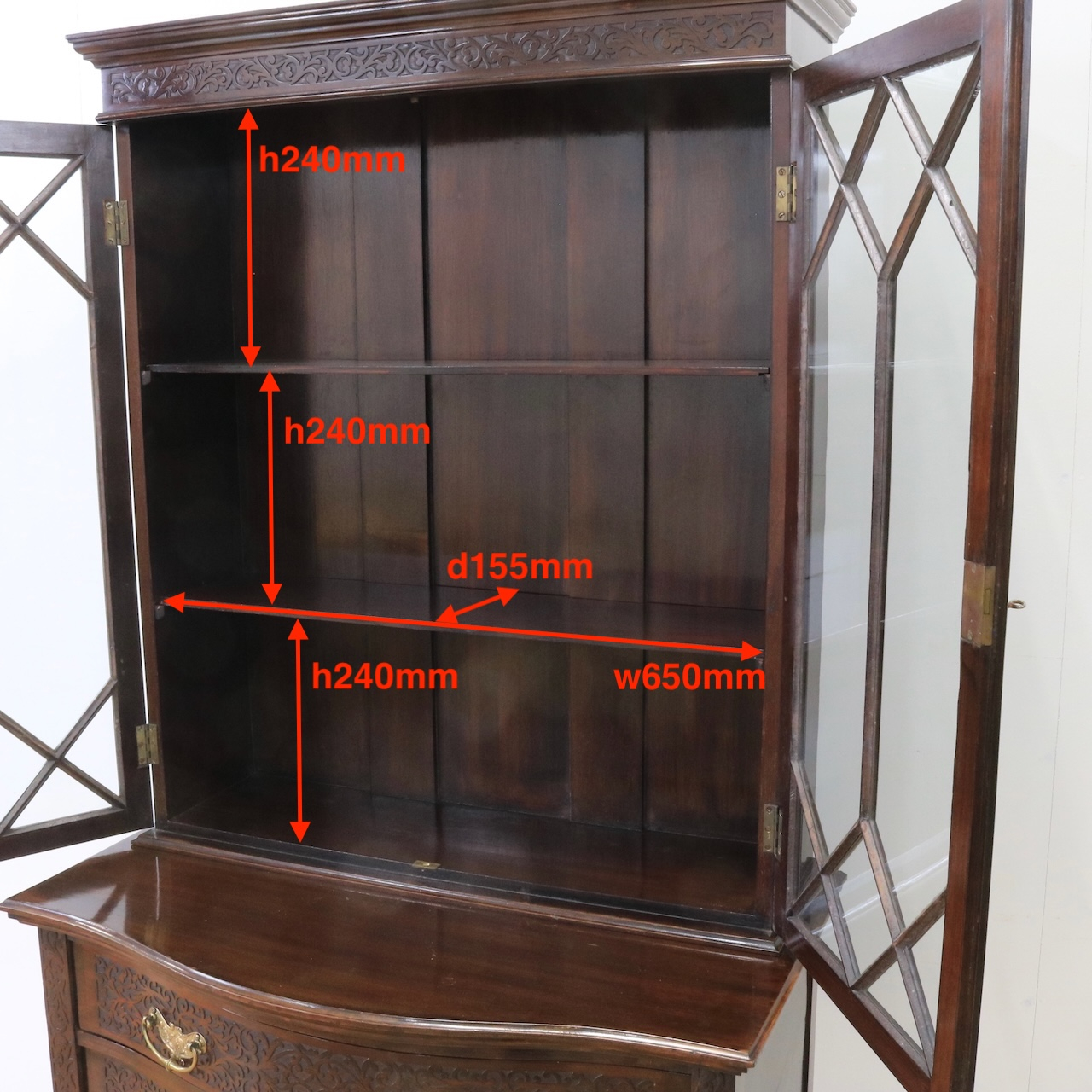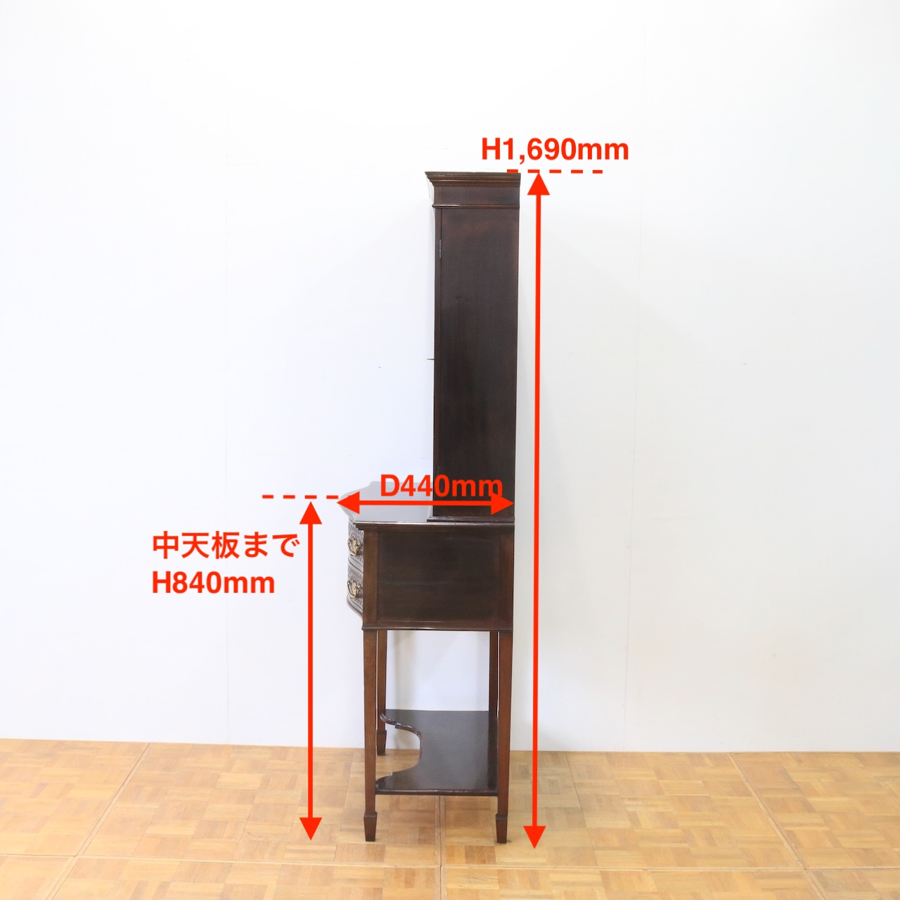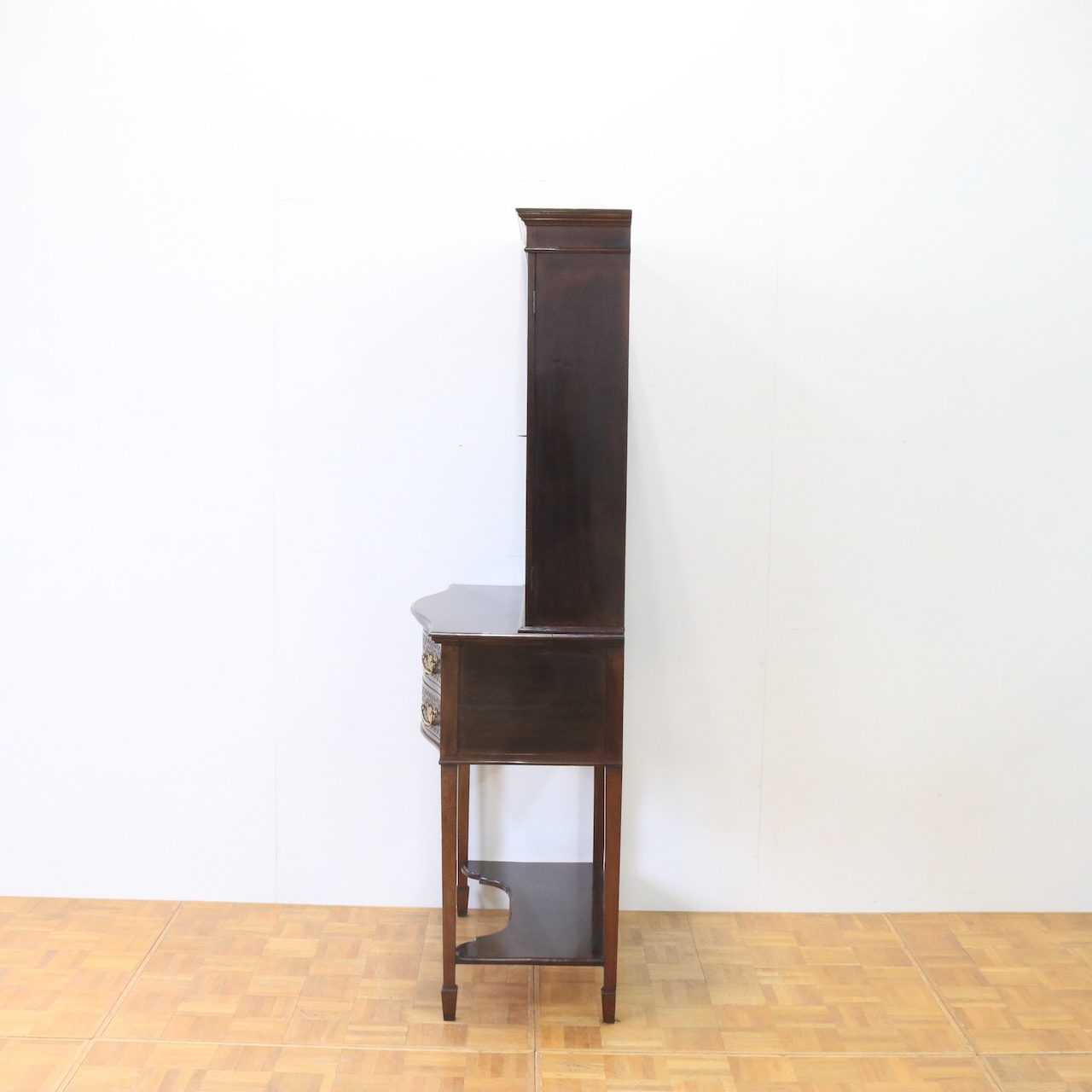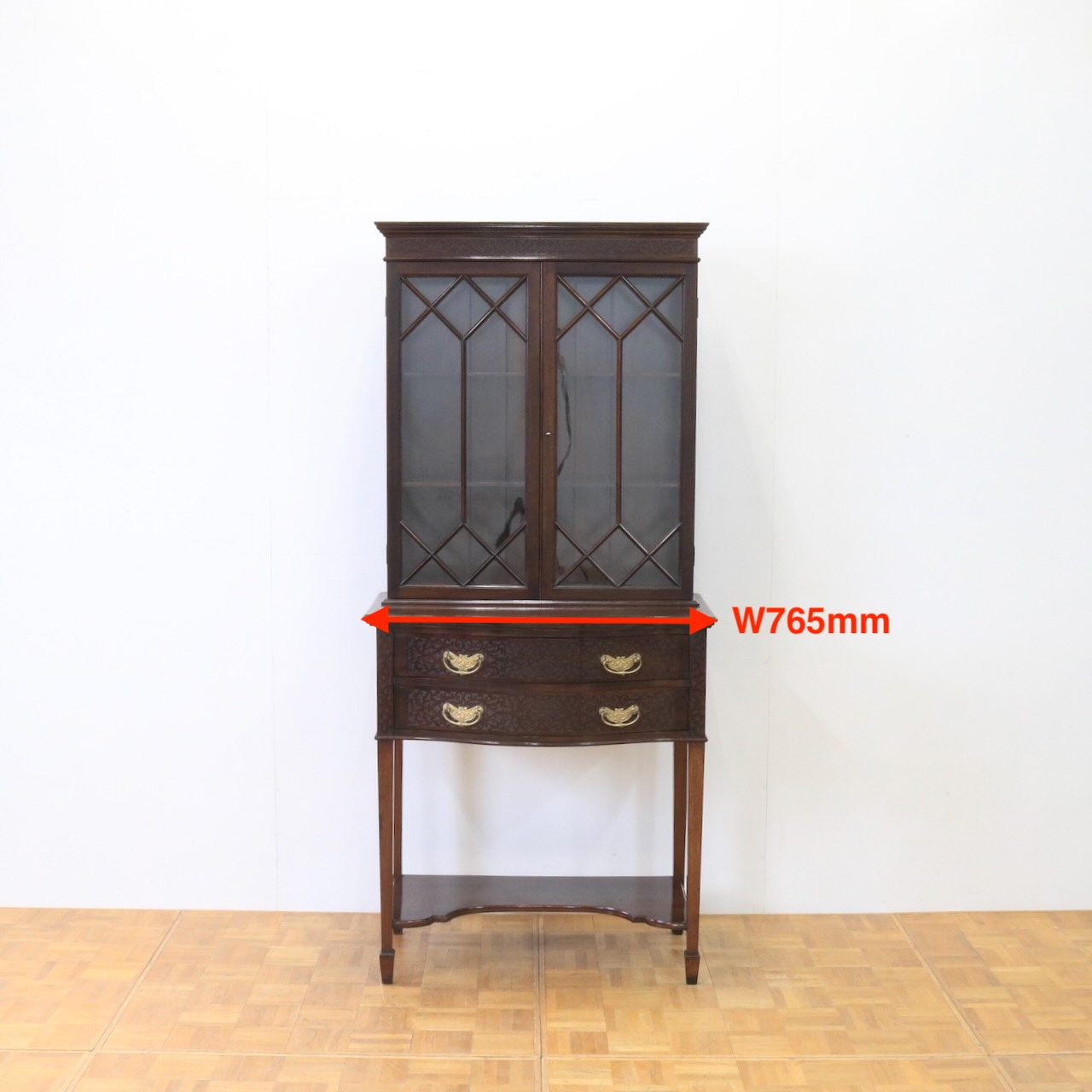 上部や引き出し周りに施されたフレットワークによる装飾が圧巻のクオリティです。美しさは勿論、下段にも収納があり実用面にも優れたアンティークキャビネットです。