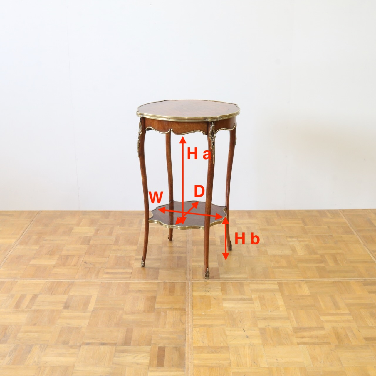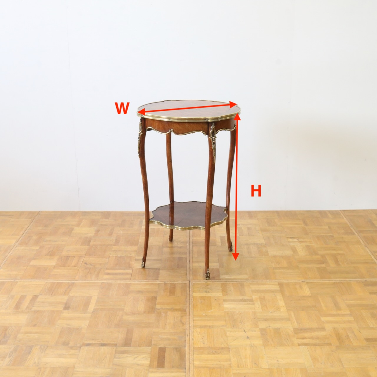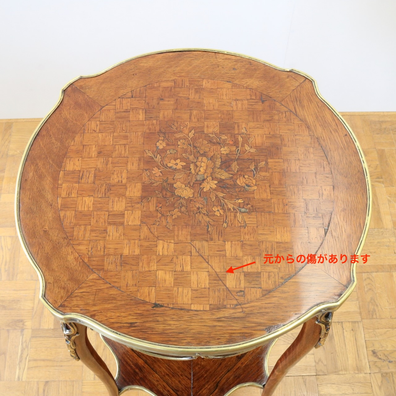 配送料の目安 ▶︎1910年代、キングウッドのオケージョナルテーブル。繊細なフラワーモチーフのインレイがブーケのように美しい天板。縁周りも真鍮が施された華やかなデザインです。