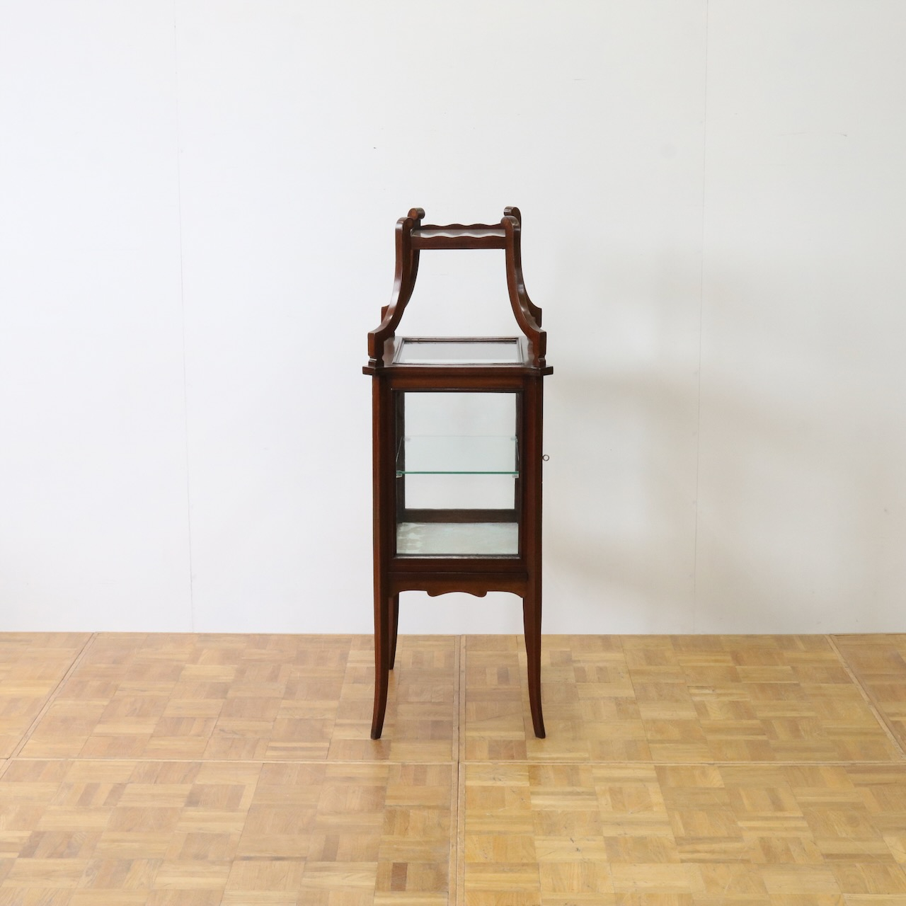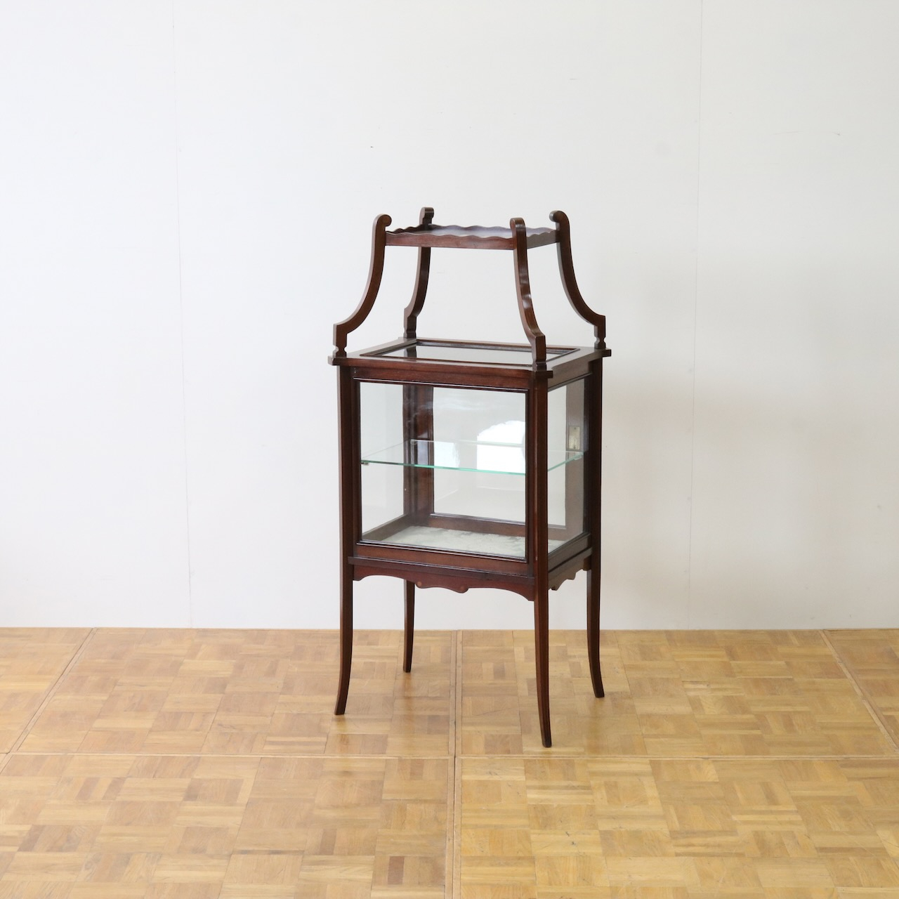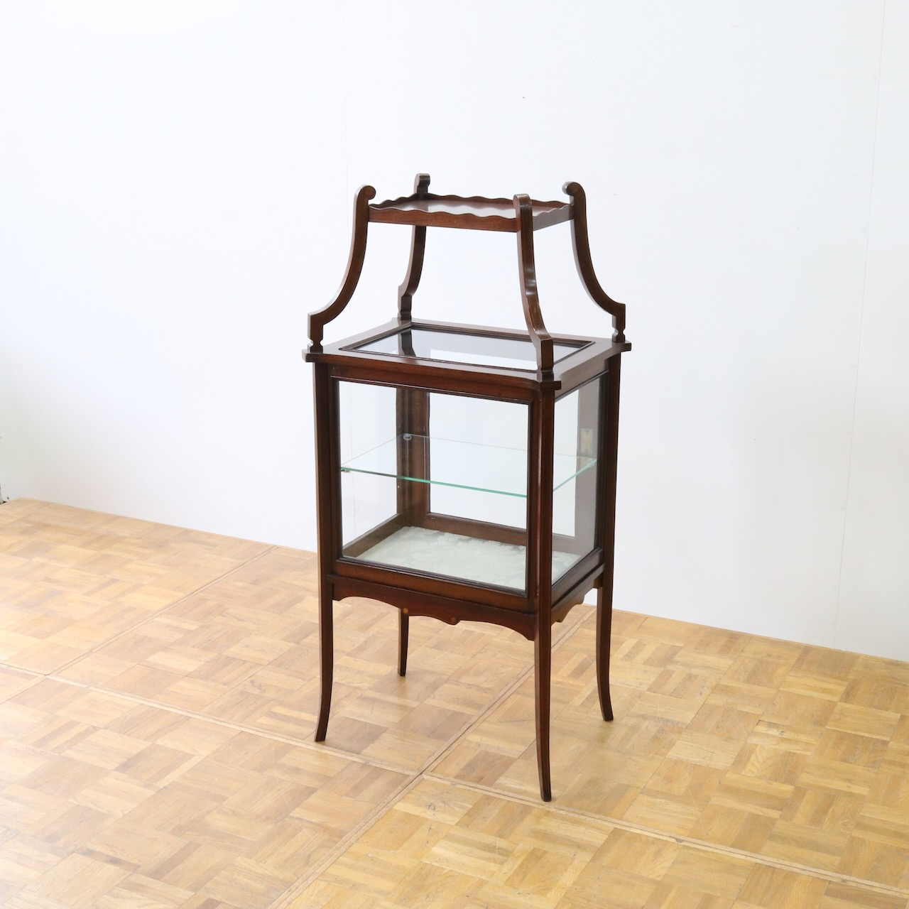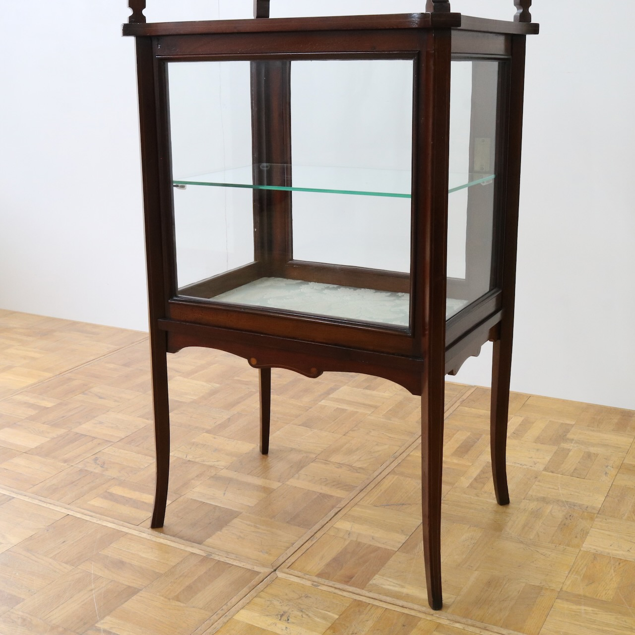 1920年代、ウォールナットのジュエリーケース。4面ガラスでどの方向からも中のコレクションが美しく見えます。スクロールの柱で支えられたトップの天板がついた珍しい造りです。