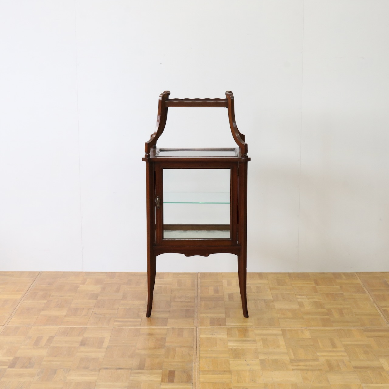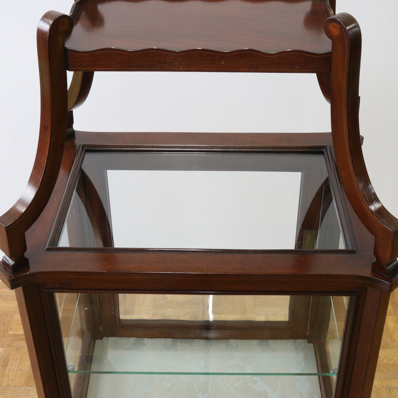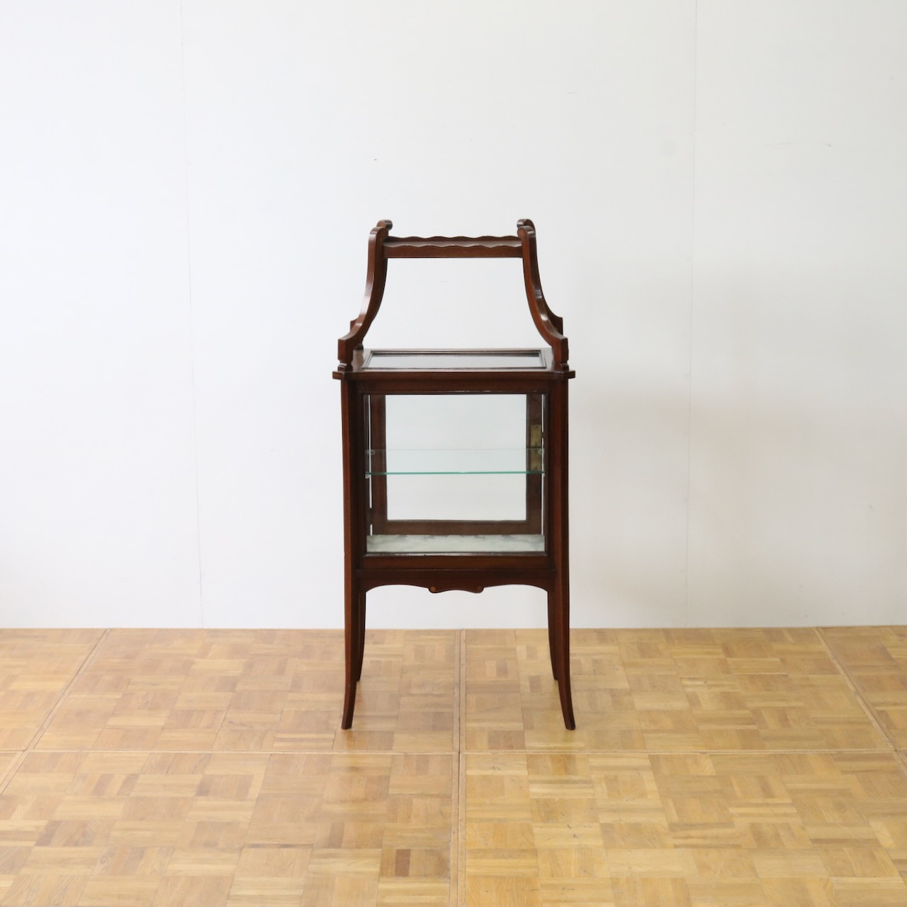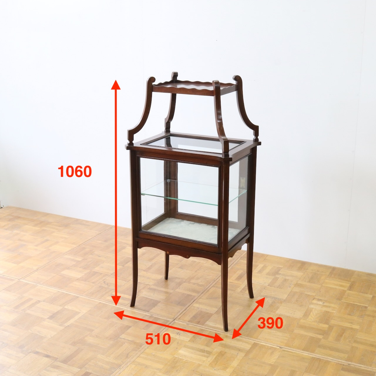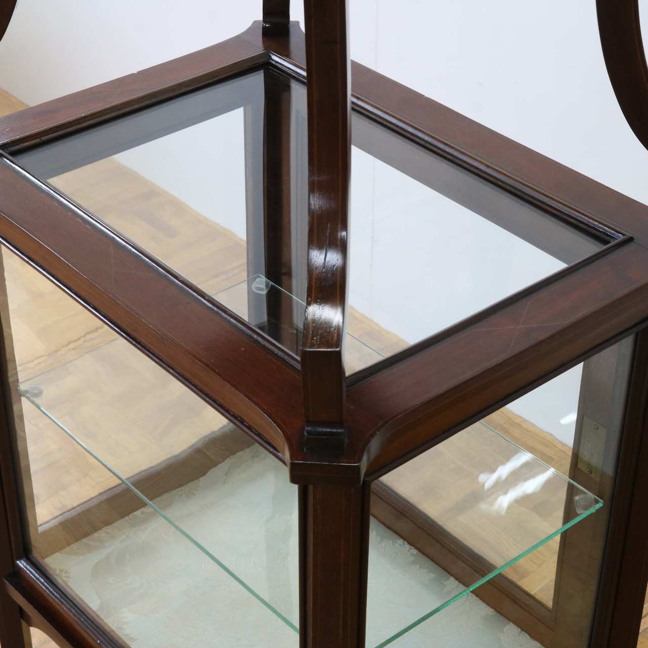 1920年代、ウォールナットのジュエリーケース。4面ガラスでどの方向からも中のコレクションが美しく見えます。スクロールの柱で支えられたトップの天板がついた珍しい造りです。