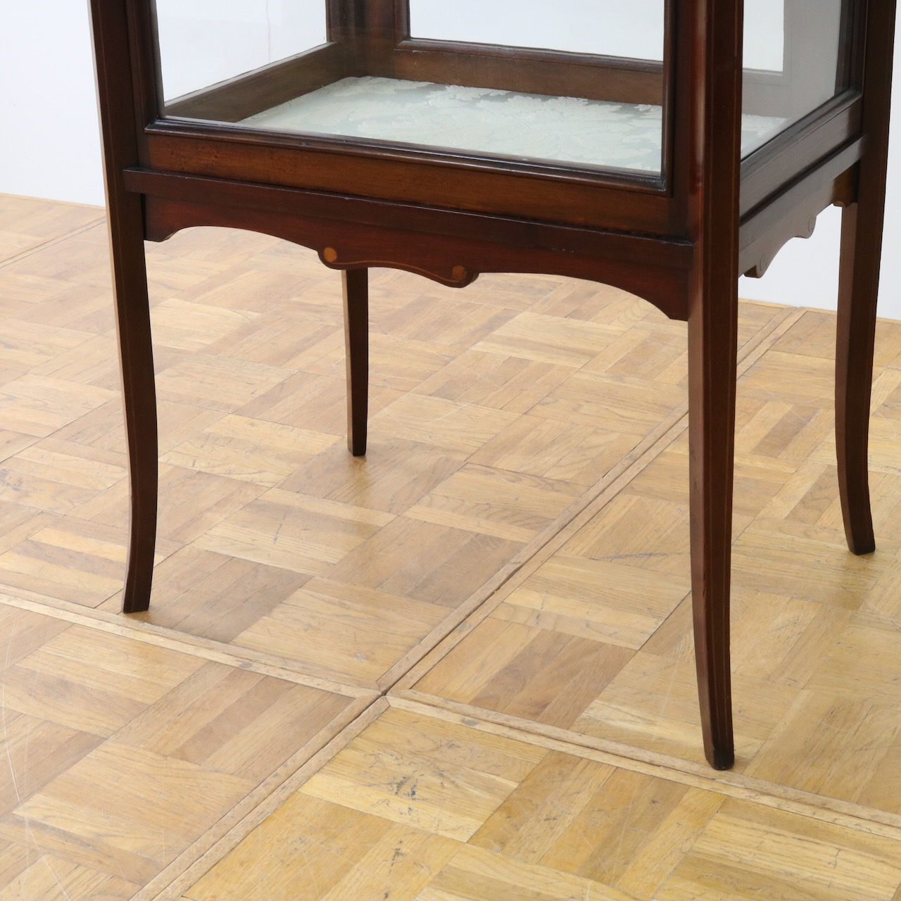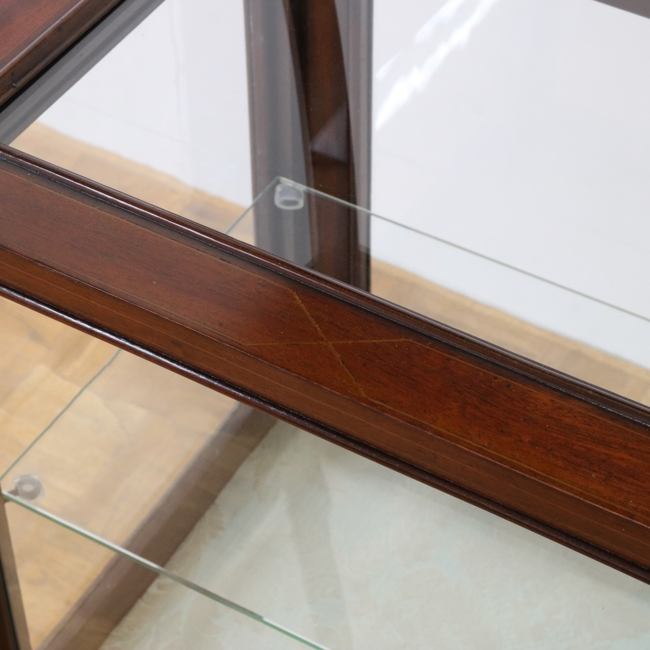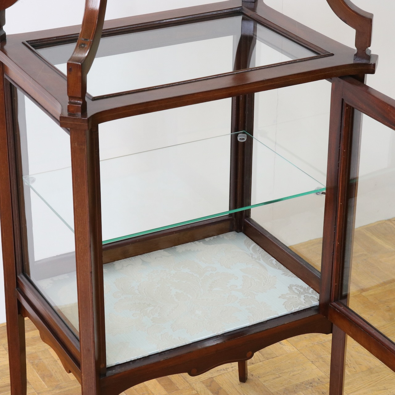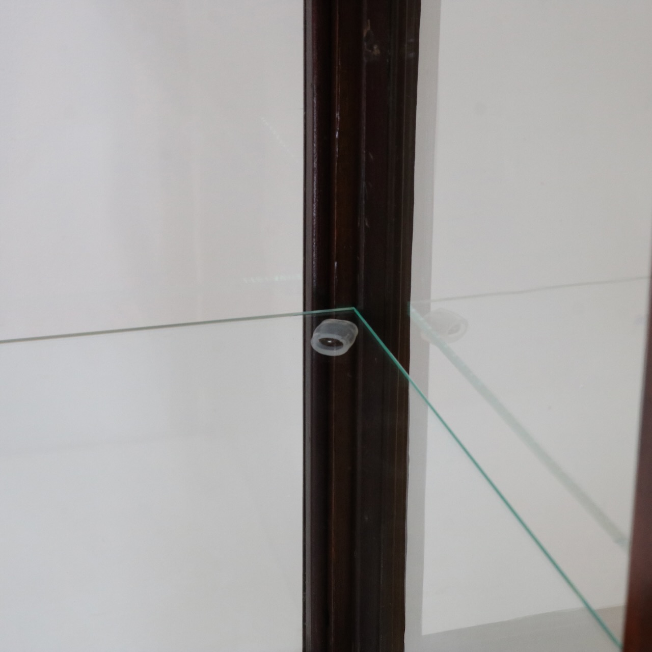 1920年代、ウォールナットのジュエリーケース。4面ガラスでどの方向からも中のコレクションが美しく見えます。スクロールの柱で支えられたトップの天板がついた珍しい造りです。