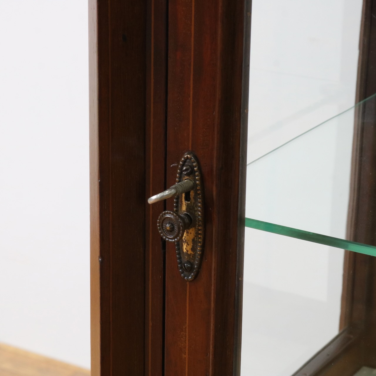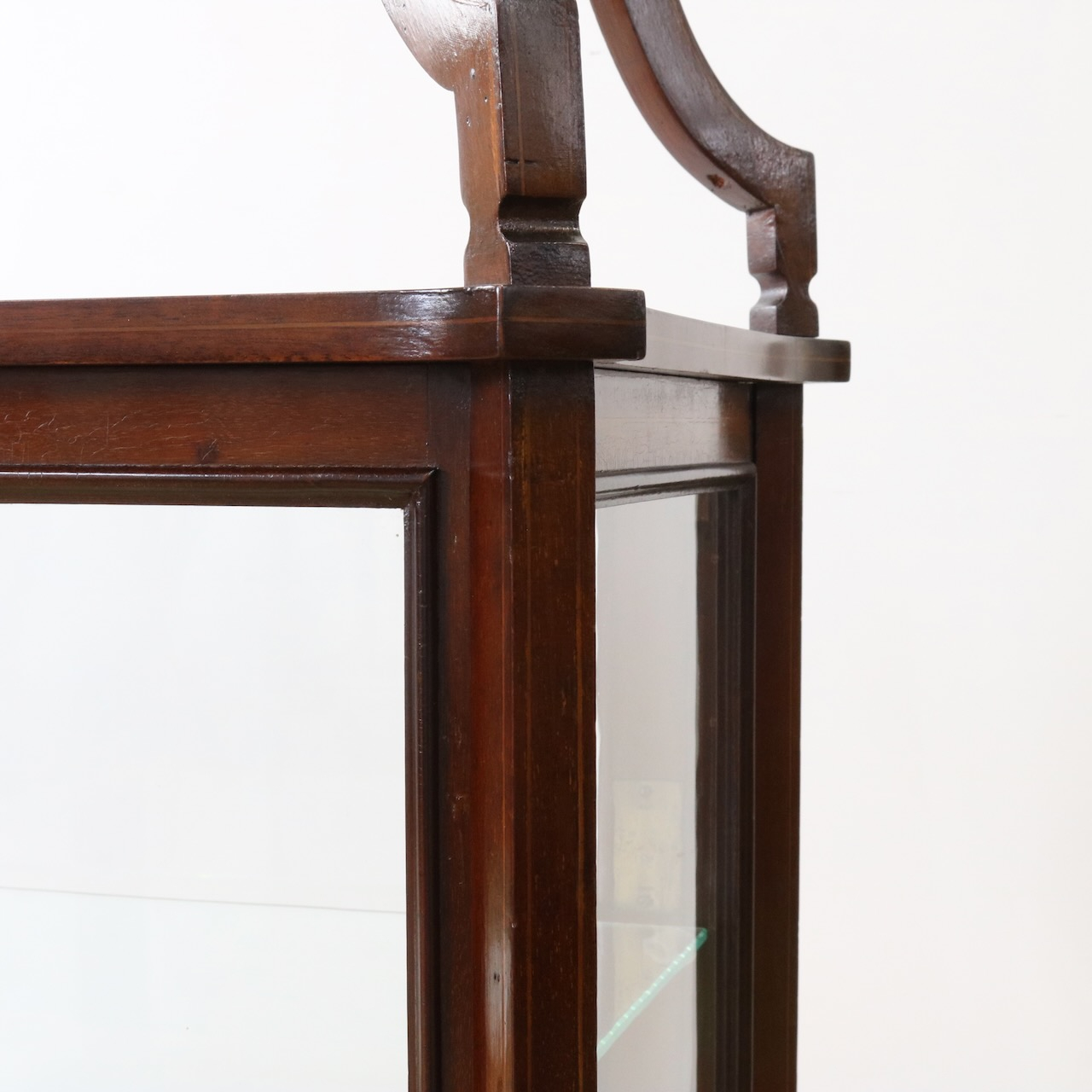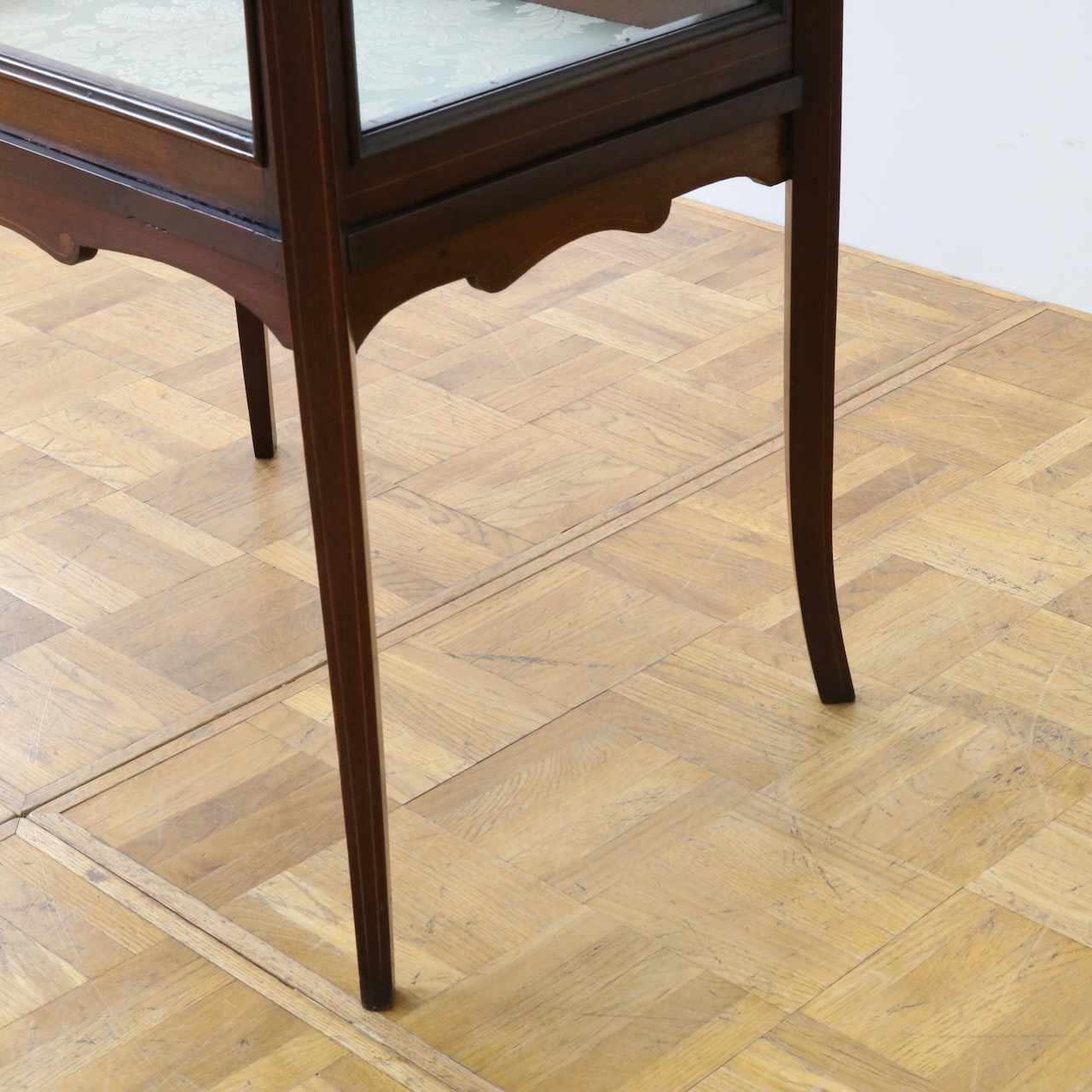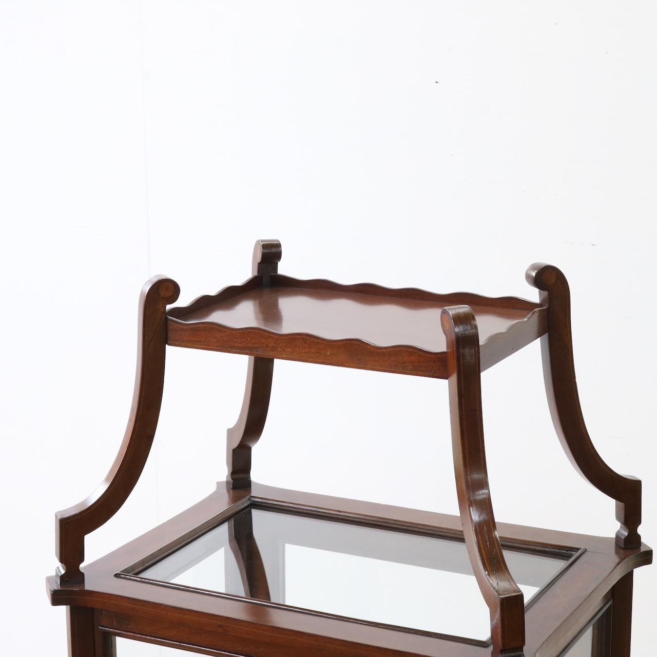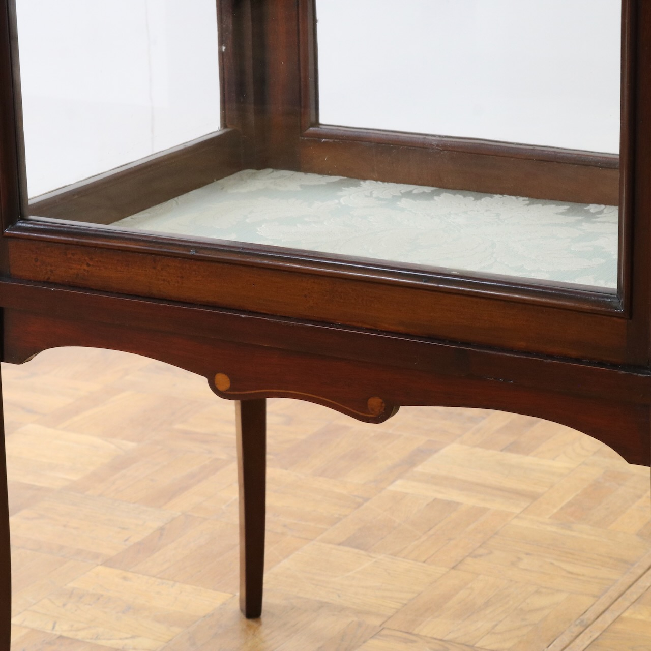 1920年代、ウォールナットのジュエリーケース。4面ガラスでどの方向からも中のコレクションが美しく見えます。スクロールの柱で支えられたトップの天板がついた珍しい造りです。
