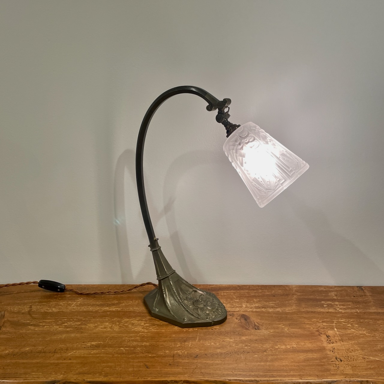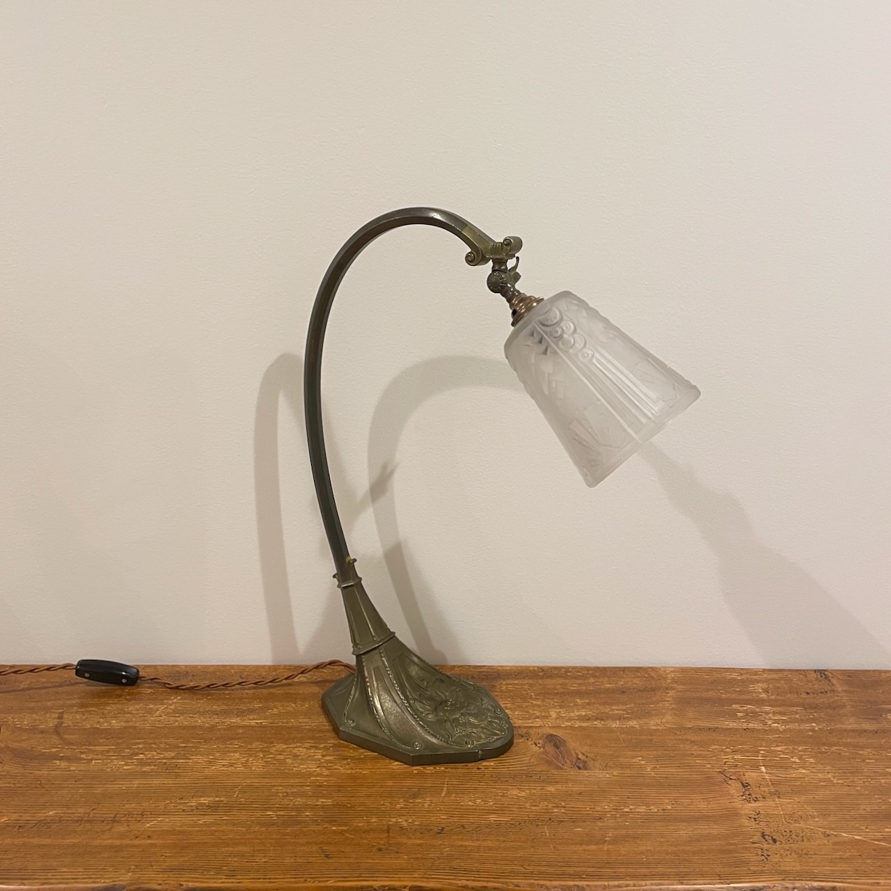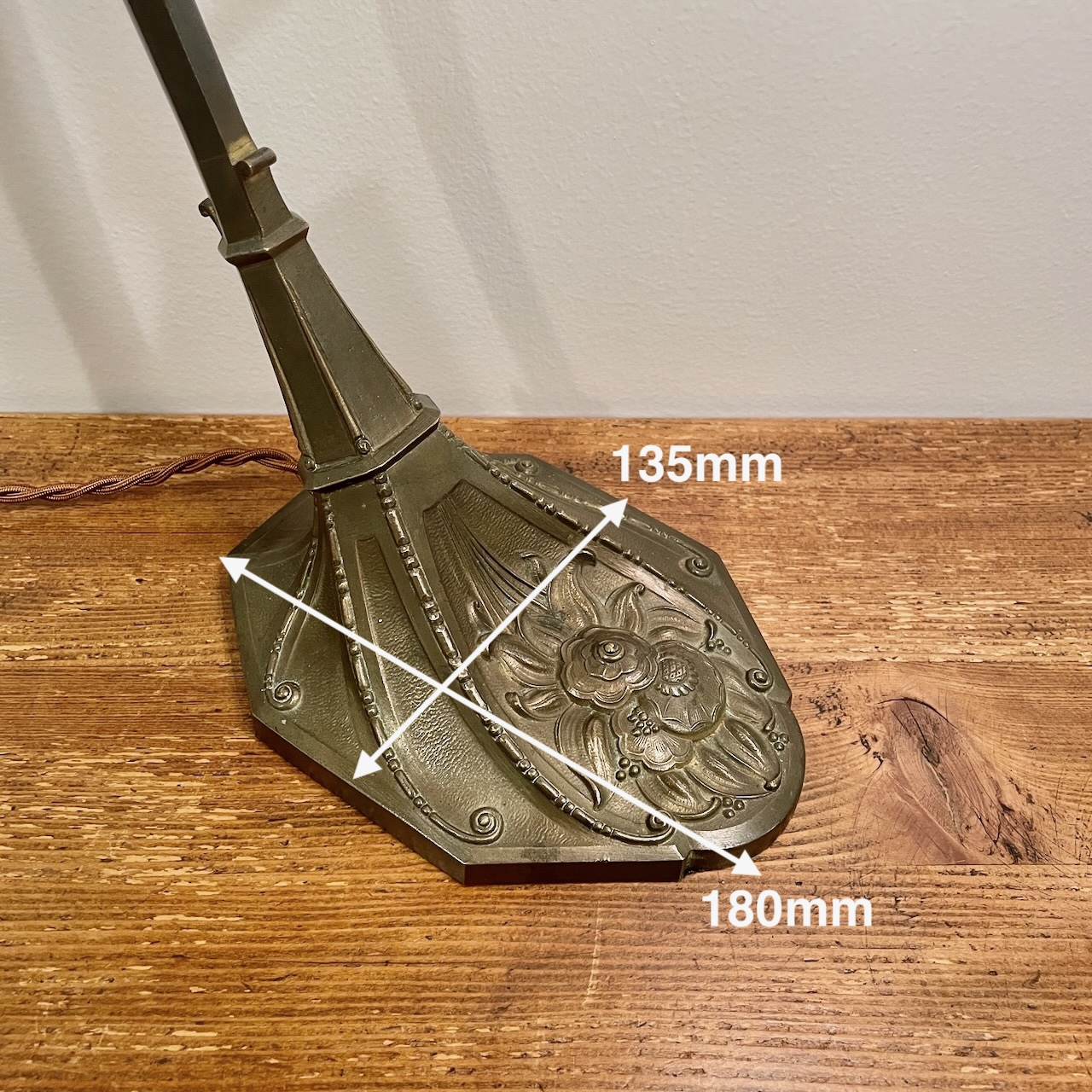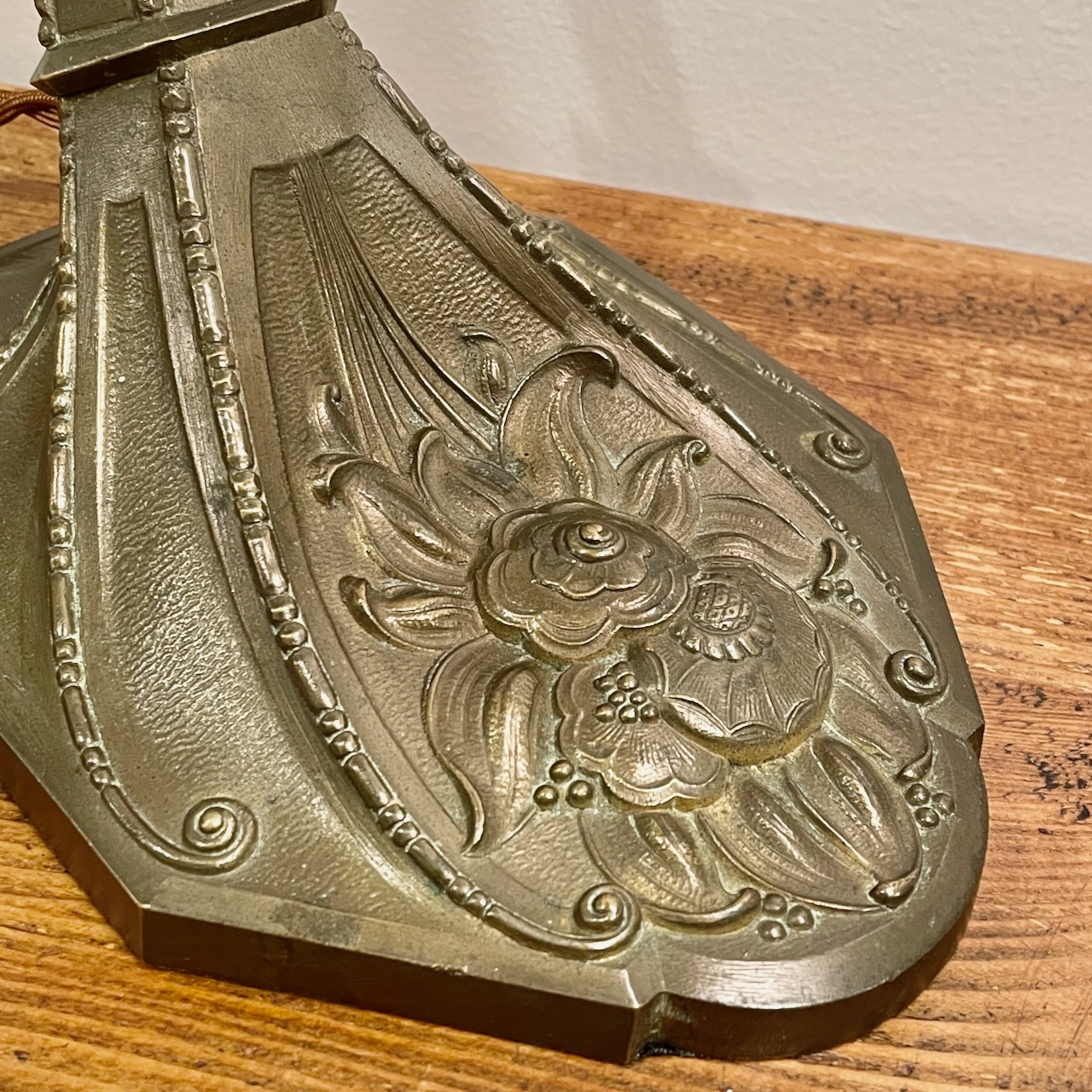 1920年代、アール・デコスタイルのデスクランプ。ガラスシェードはまさにアール・デコ、幾何学的な定番デザインです。真鍮製のベースには大きくお花があしらわれ、エレガントさもプラスしています。