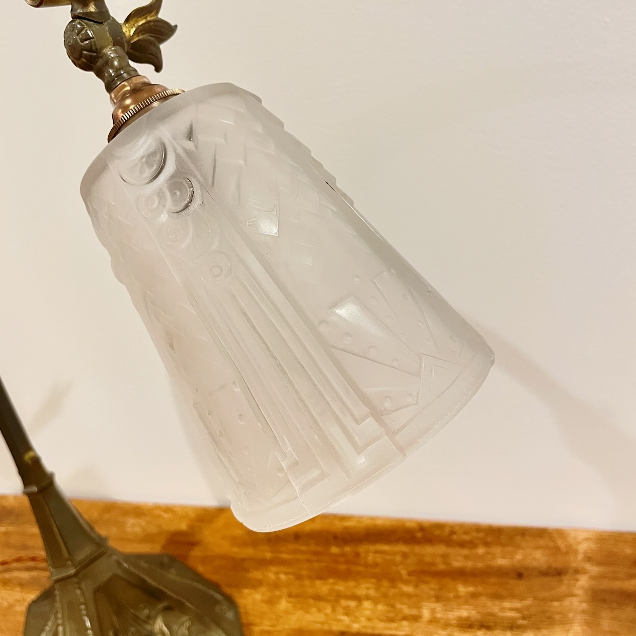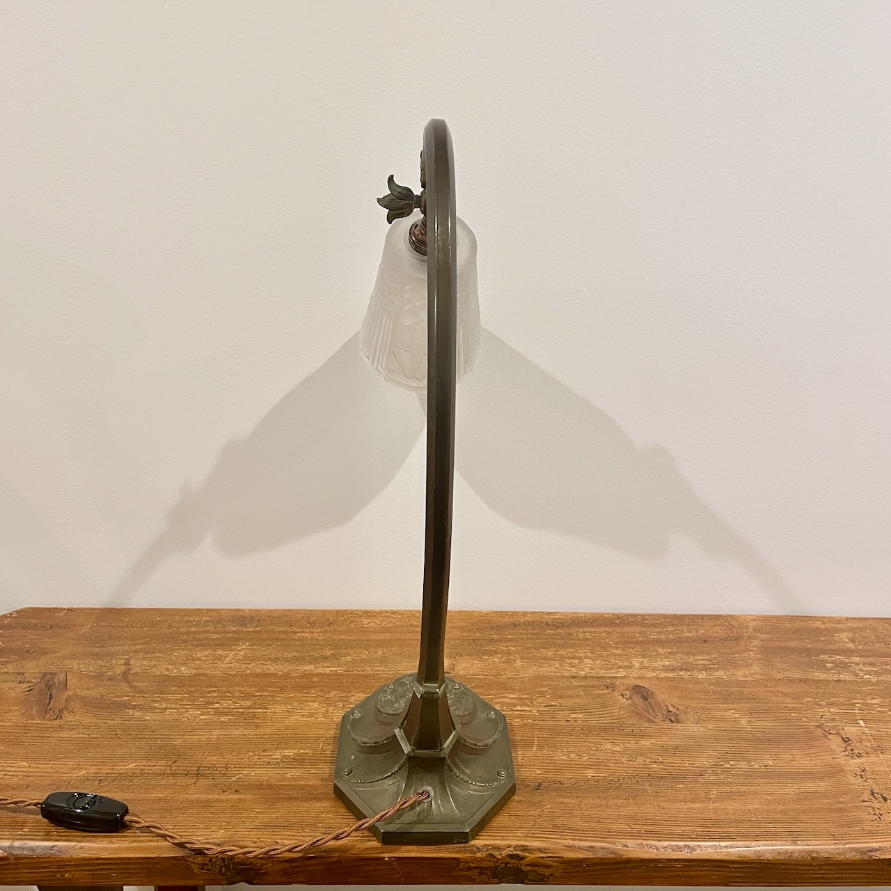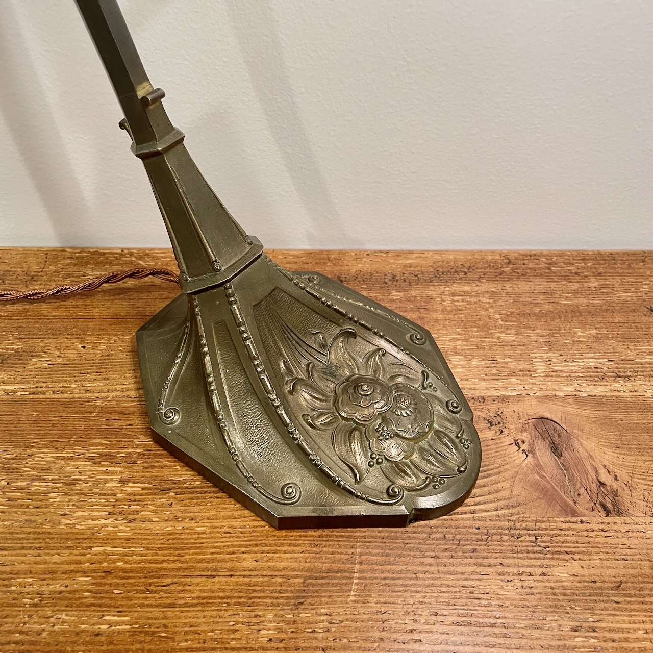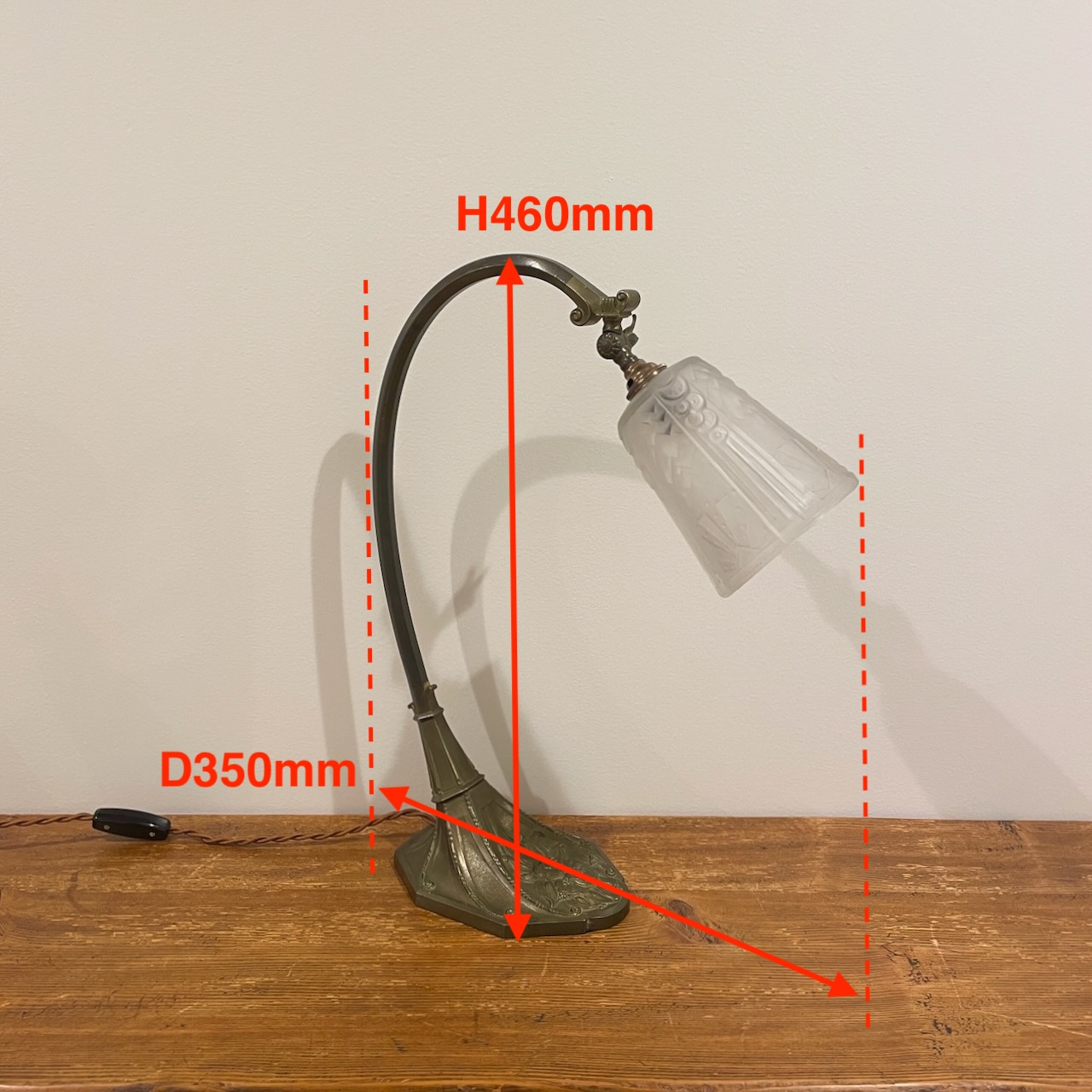 1920年代、アール・デコスタイルのデスクランプ。ガラスシェードはまさにアール・デコ、幾何学的な定番デザインです。真鍮製のベースには大きくお花があしらわれ、エレガントさもプラスしています。