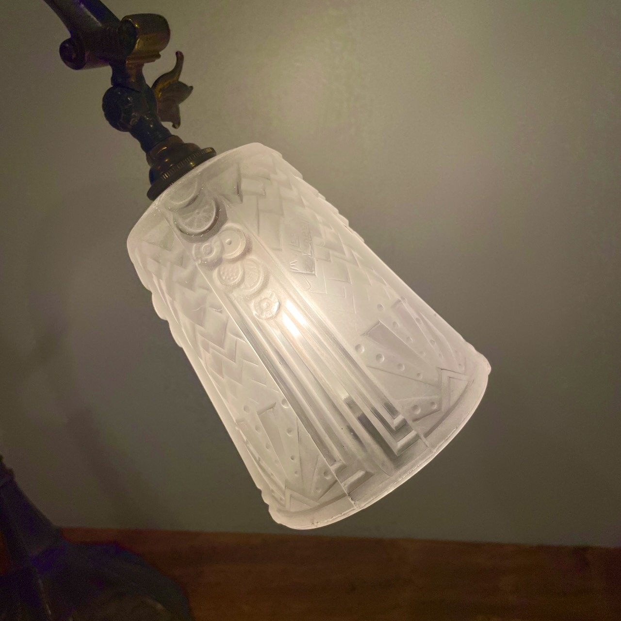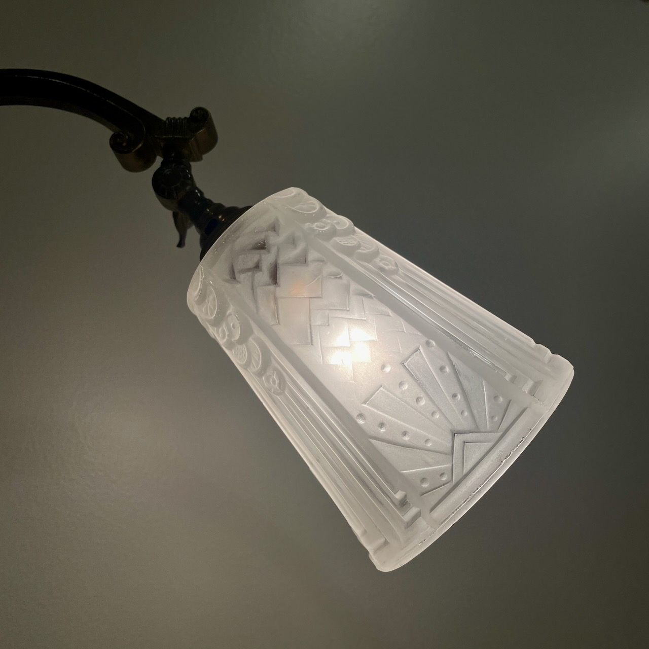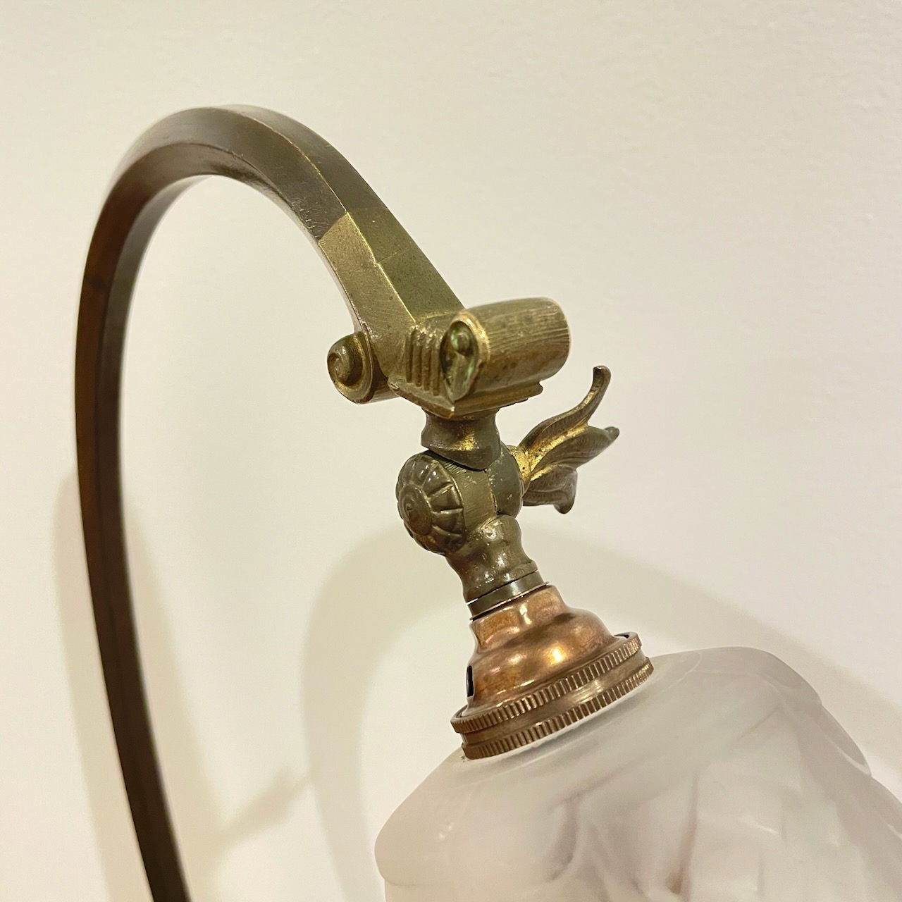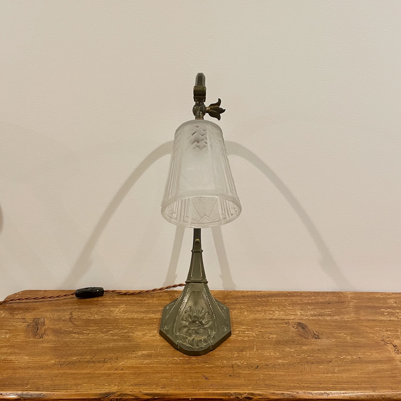 1920年代、アール・デコスタイルのデスクランプ。ガラスシェードはまさにアール・デコ、幾何学的な定番デザインです。真鍮製のベースには大きくお花があしらわれ、エレガントさもプラスしています。