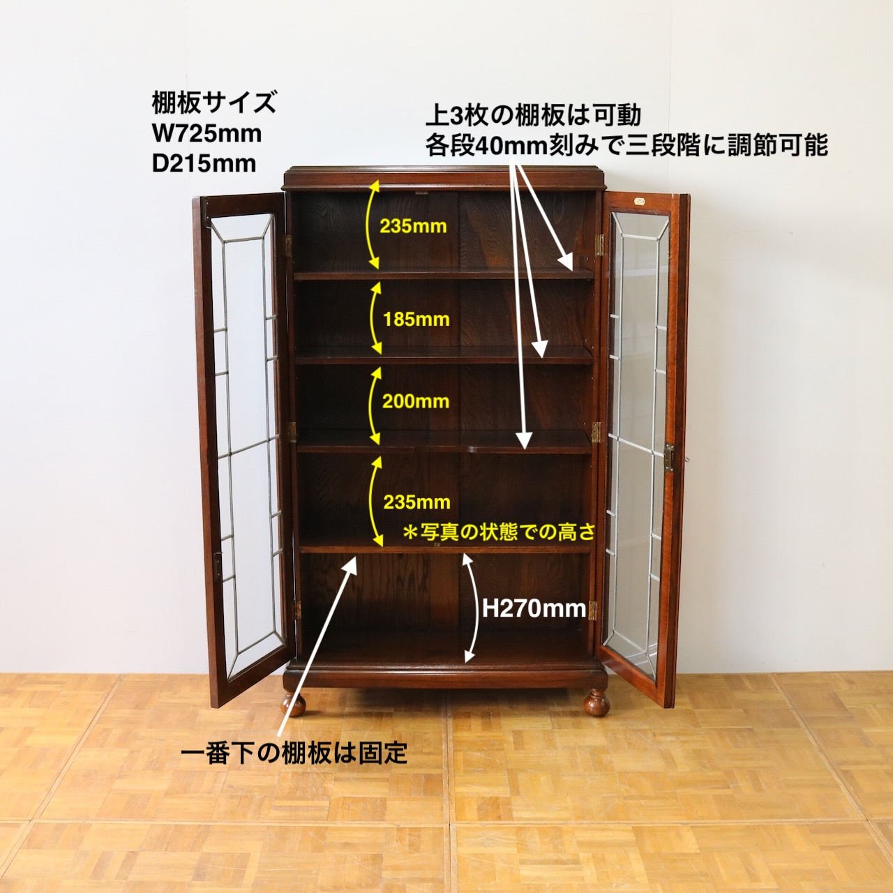 棚板は4枚。上3枚は取り外しが可能で、高さの調節もできます。