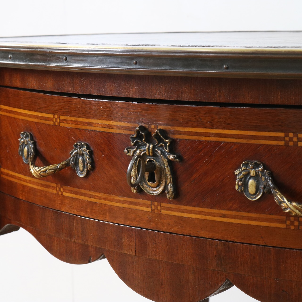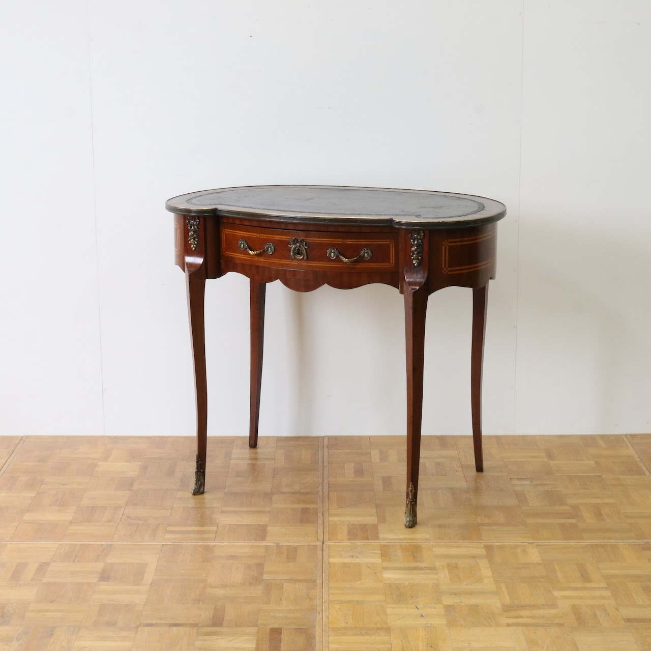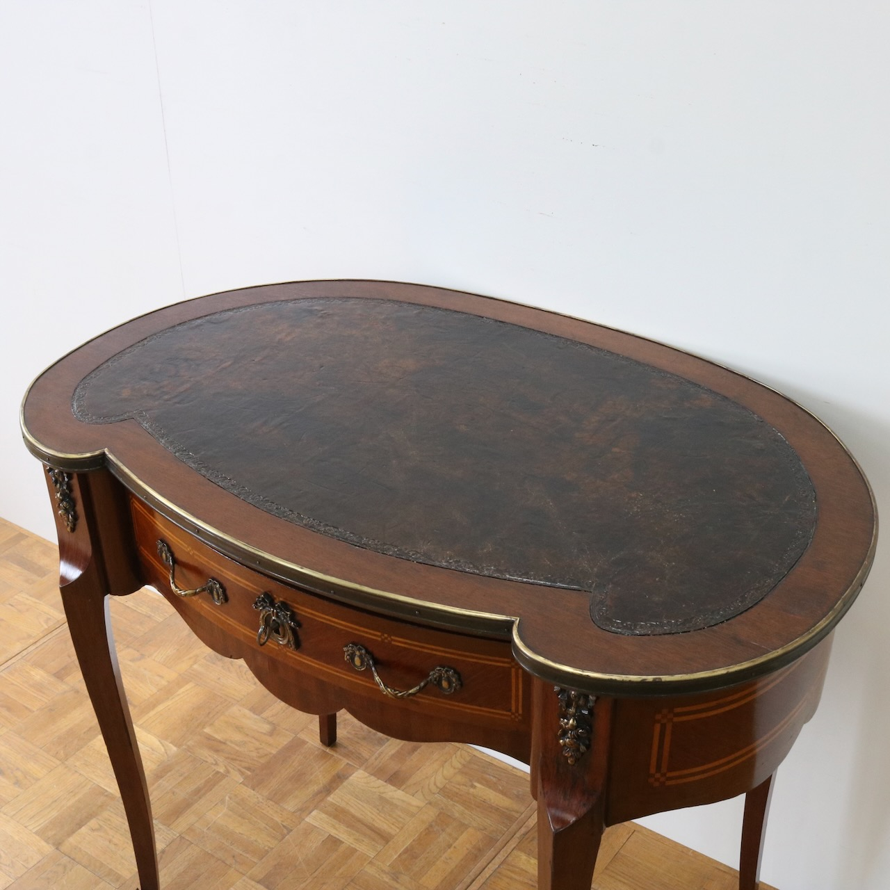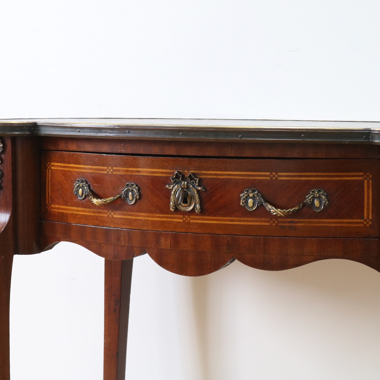 配送料の目安 ▶︎レザートップのマホガニー・ライティングデスク。幅90cmはパソコン作業等にも丁度良くお使い頂けるサイズになっています。キドニー型のフォルムと引き出し部分についたエレガントな金具飾りが特徴的なライティングデスクです。