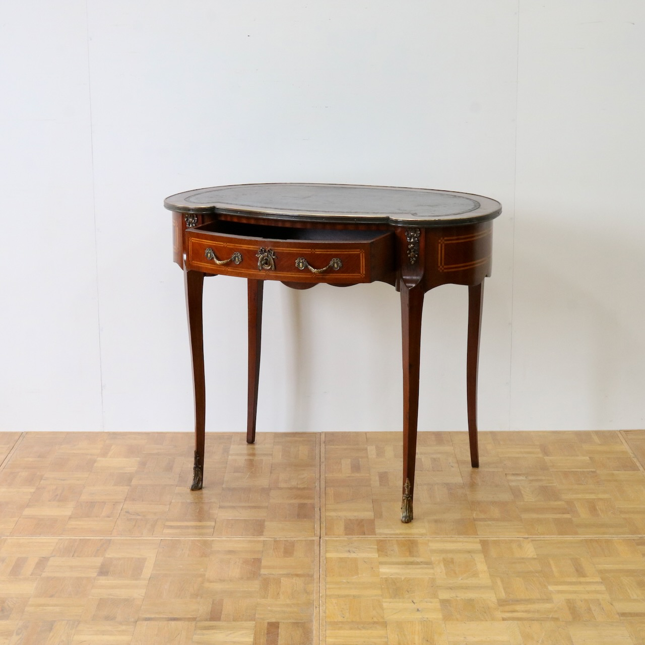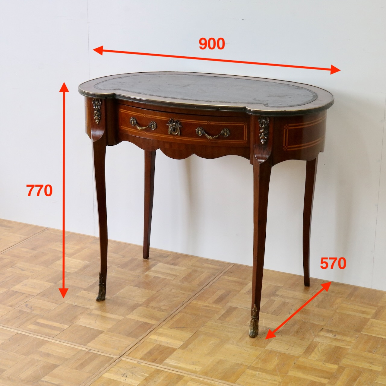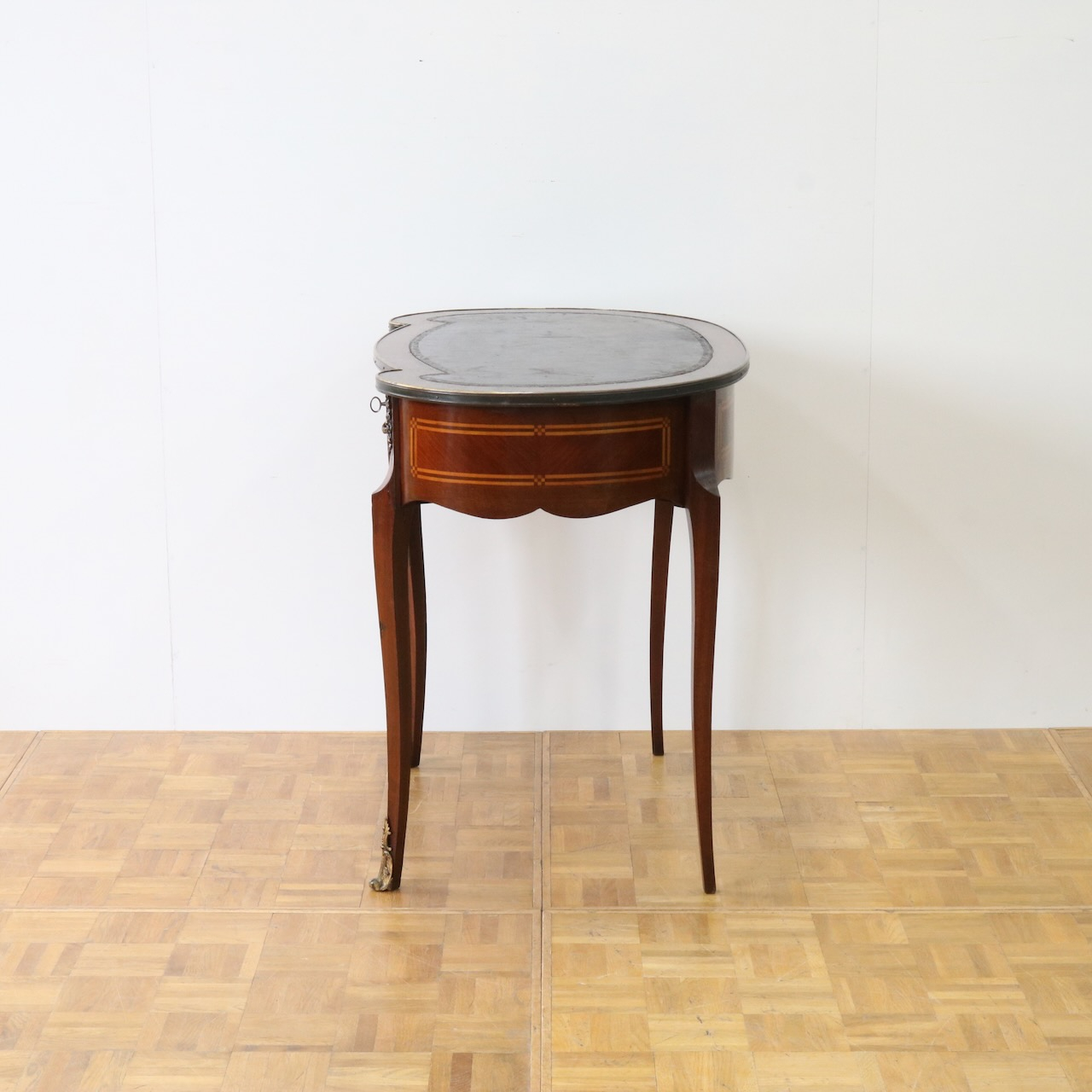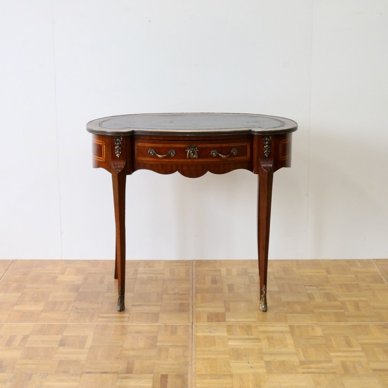 配送料の目安 ▶︎レザートップのマホガニー・ライティングデスク。幅90cmはパソコン作業等にも丁度良くお使い頂けるサイズになっています。キドニー型のフォルムと引き出し部分についたエレガントな金具飾りが特徴的なライティングデスクです。