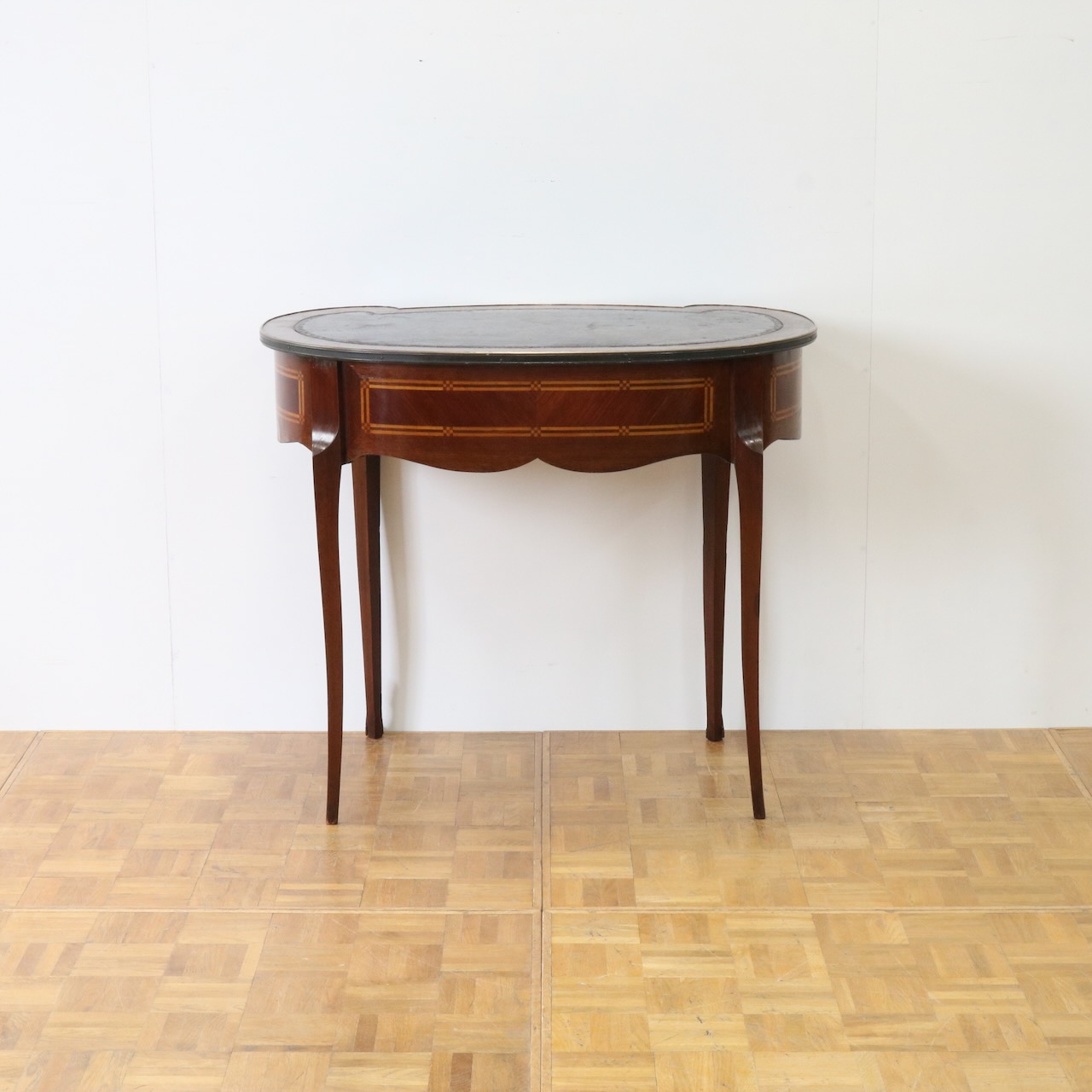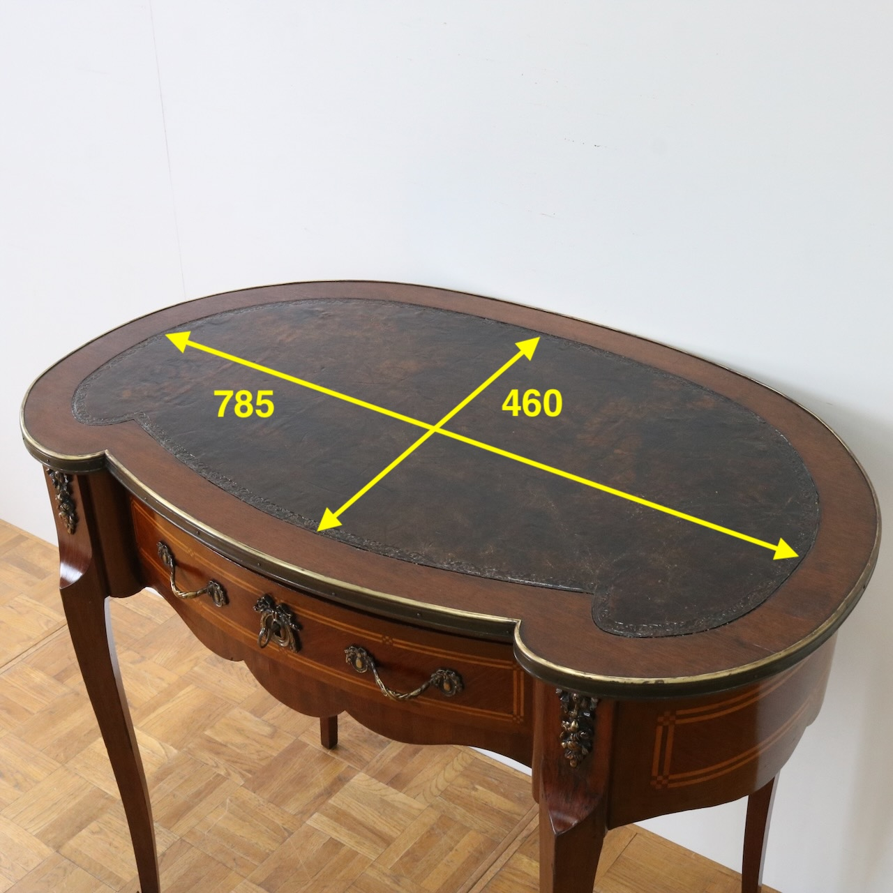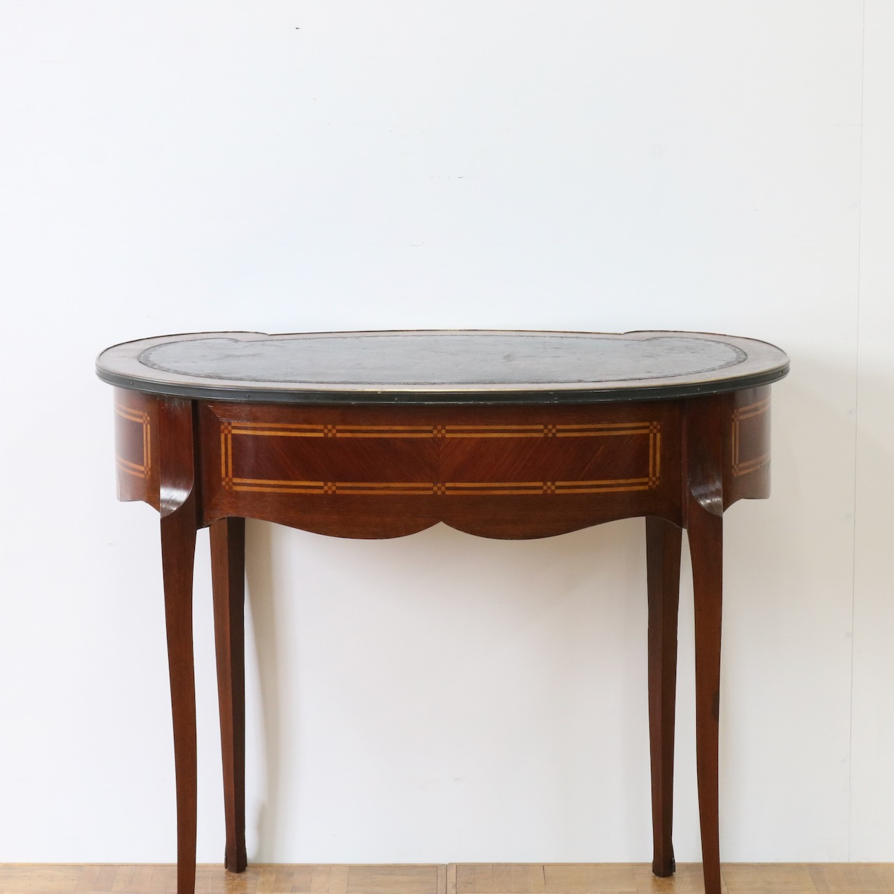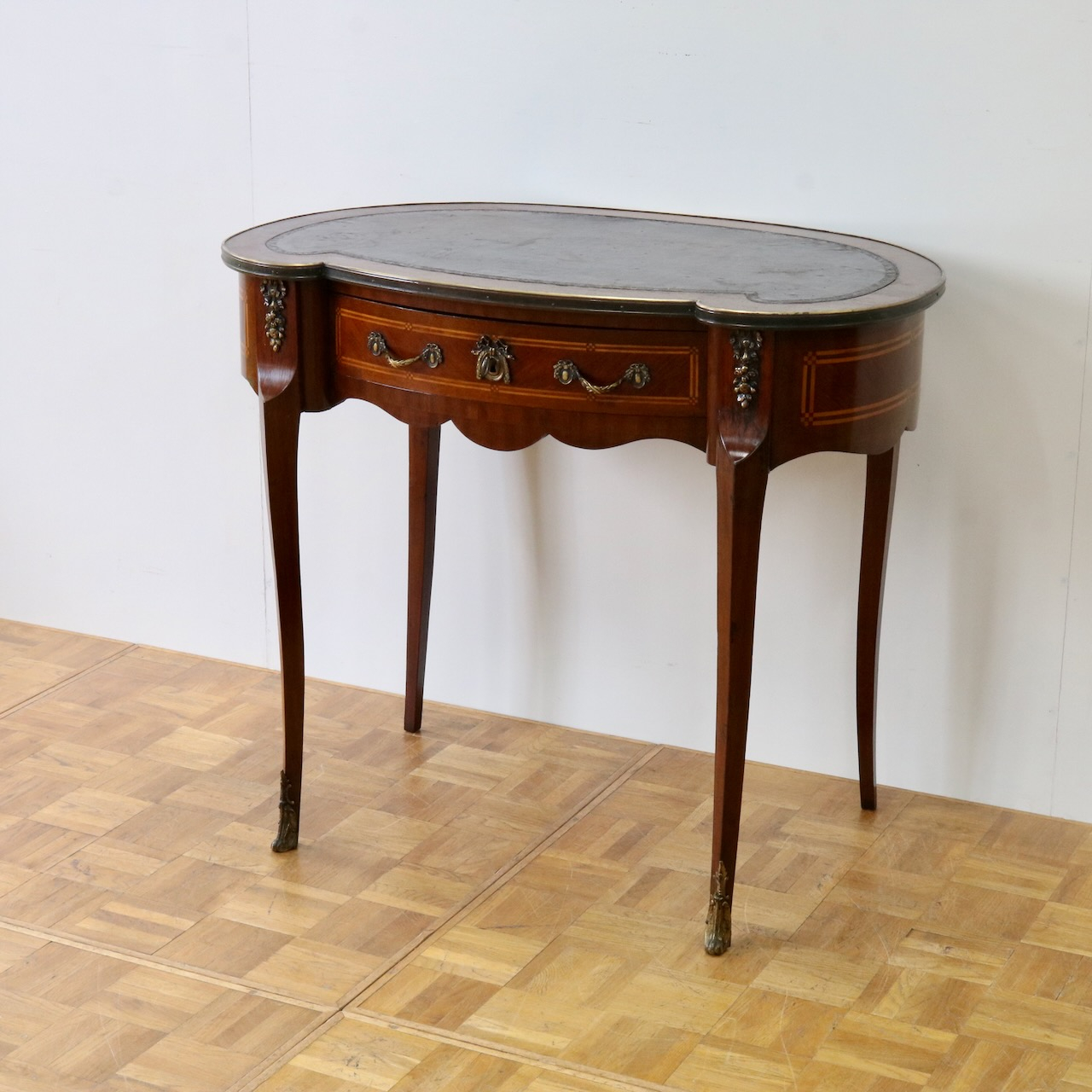 配送料の目安 ▶︎レザートップのマホガニー・ライティングデスク。幅90cmはパソコン作業等にも丁度良くお使い頂けるサイズになっています。キドニー型のフォルムと引き出し部分についたエレガントな金具飾りが特徴的なライティングデスクです。