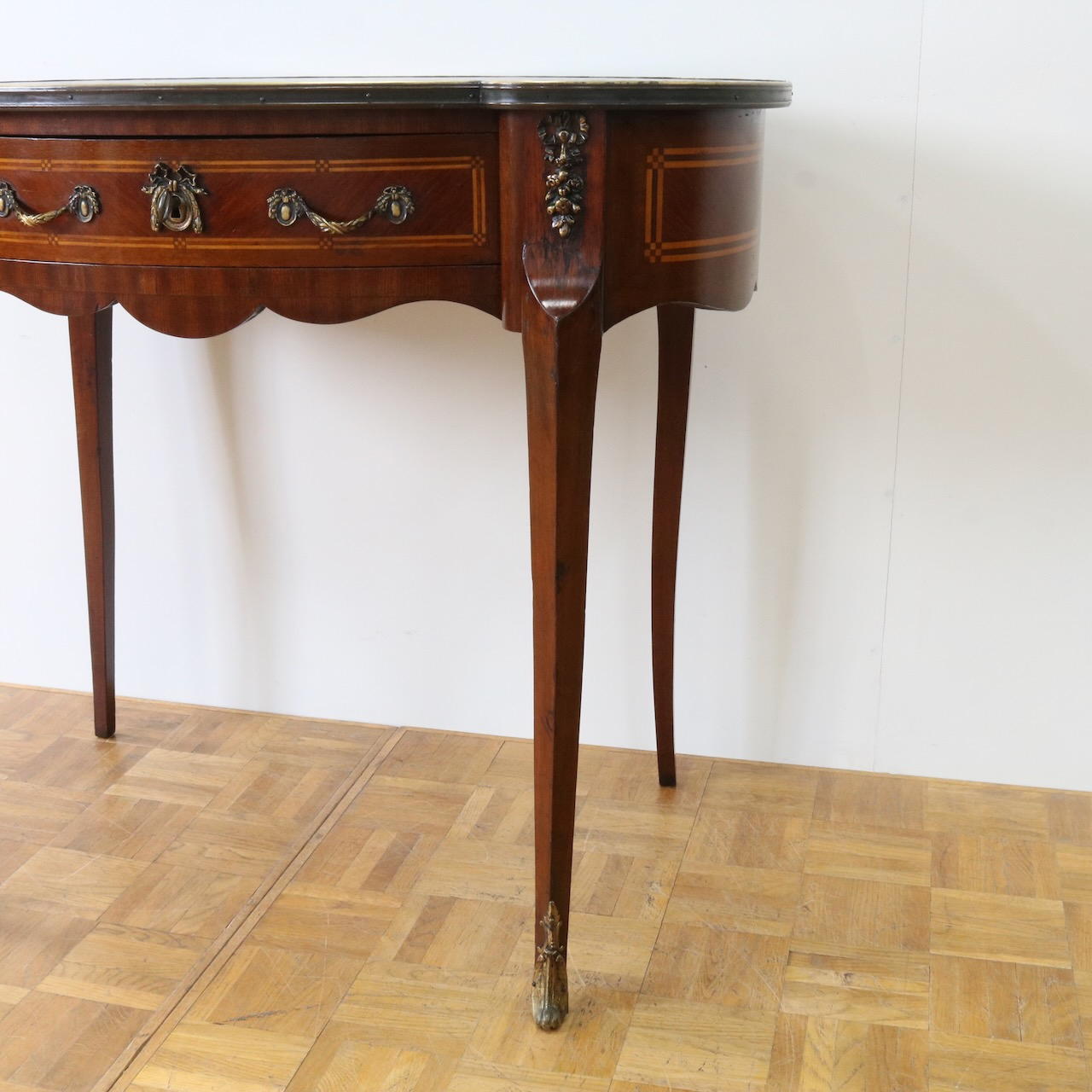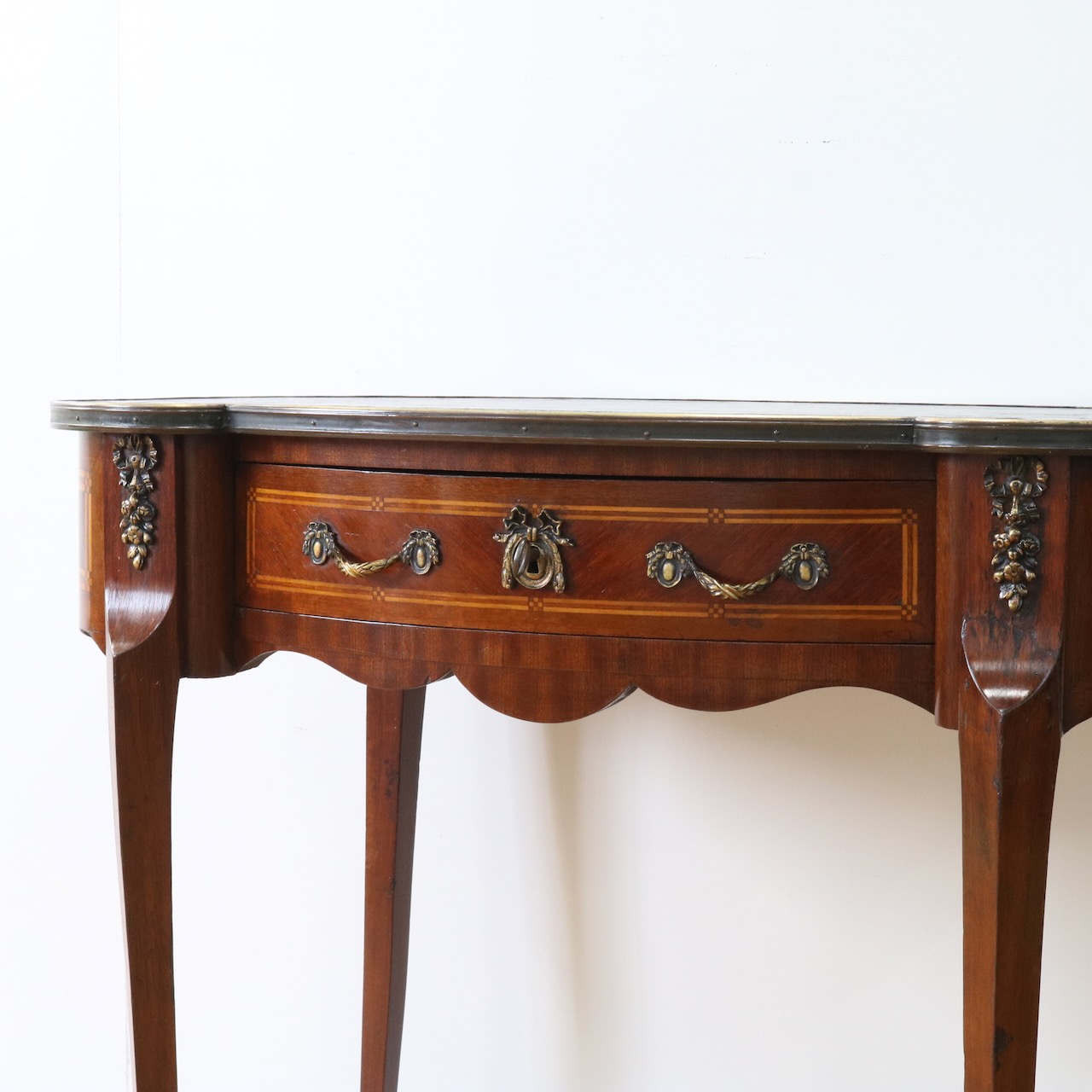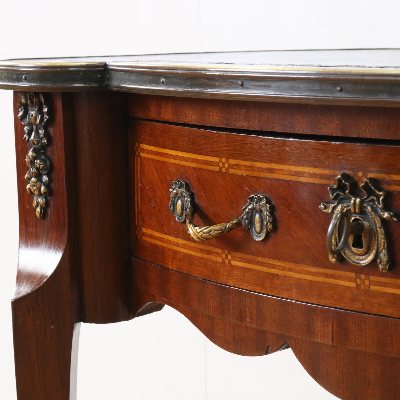 エレガントな曲面や美しい造形の金物飾りがクラシックな佇まいのデスクです。