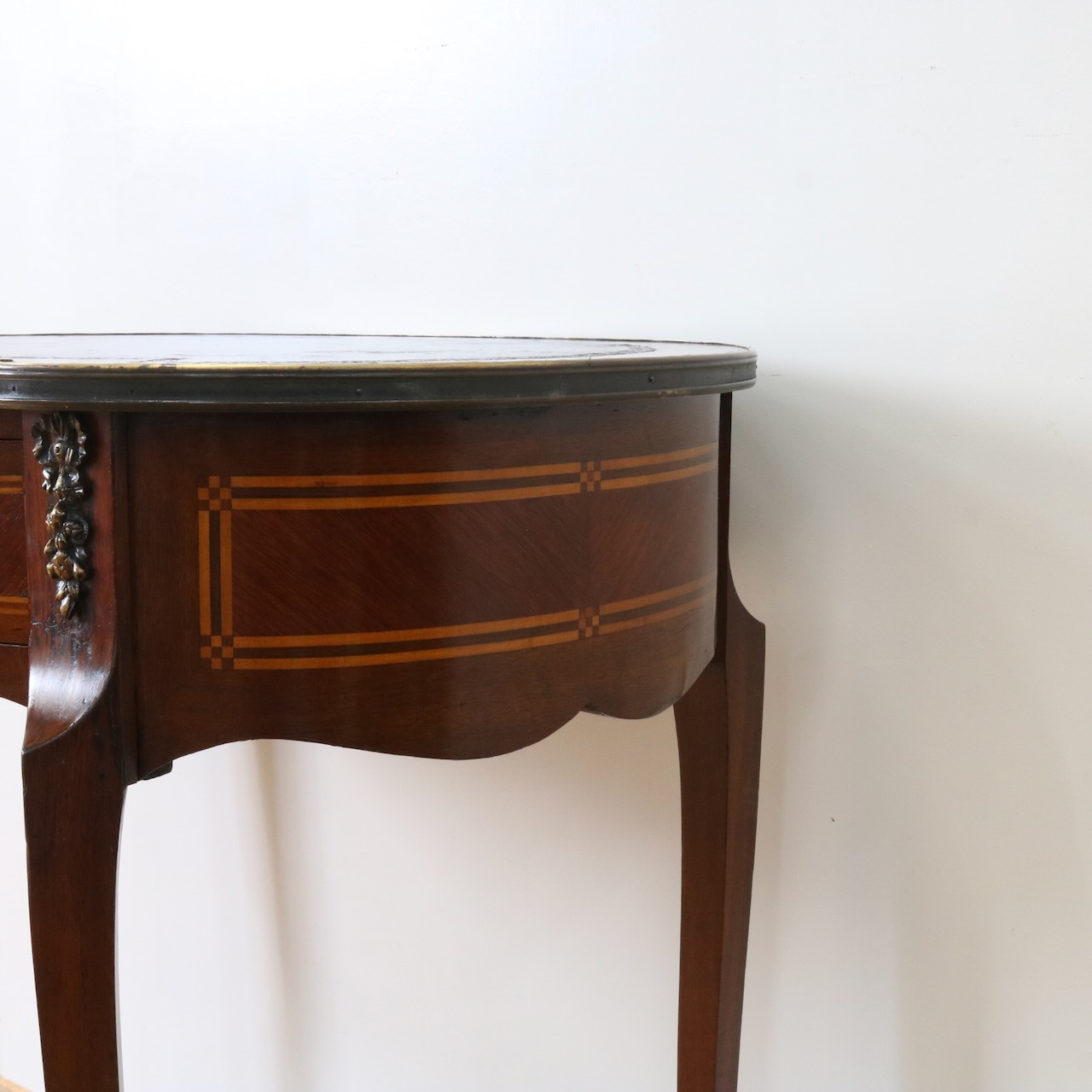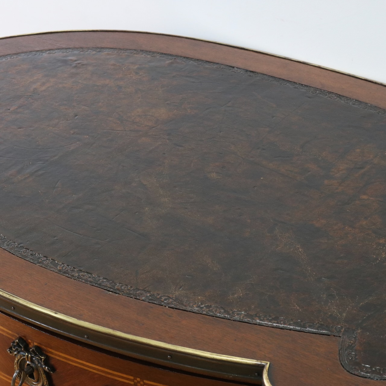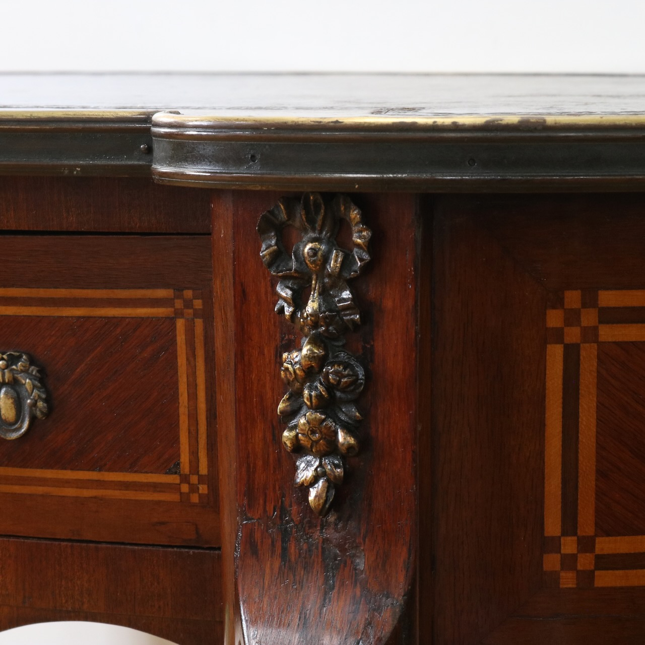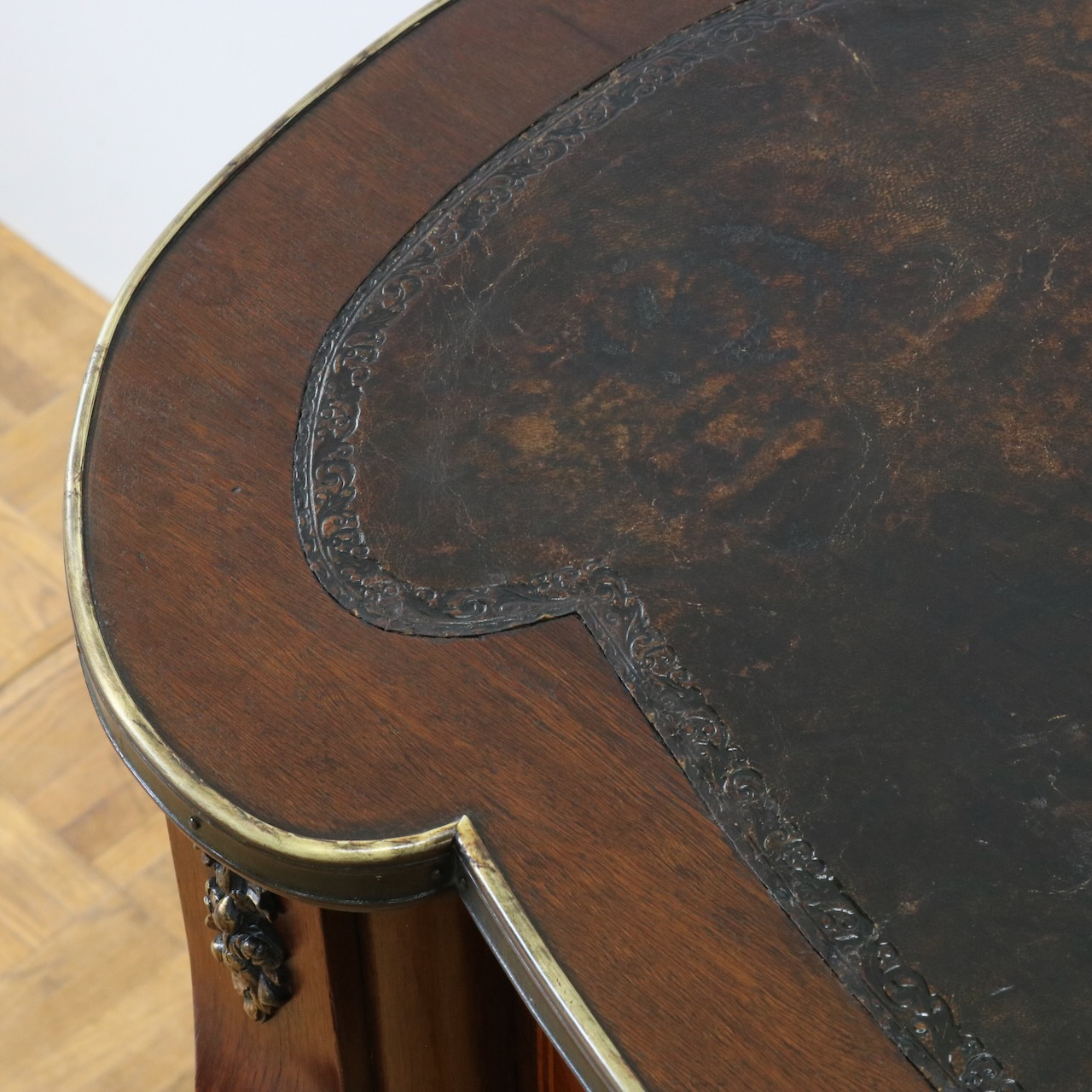 エレガントな曲面や美しい造形の金物飾りがクラシックな佇まいのデスクです。