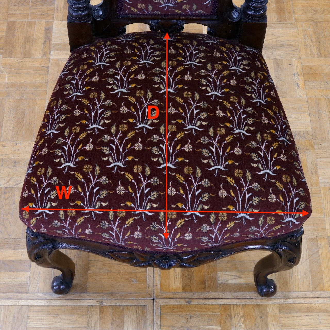 座面と背はスペインから取り寄せた生地で張り替えました。ボルドーに黄色い小花が映えるデザイン。ベルベット調のクラシックな風合いの生地です。