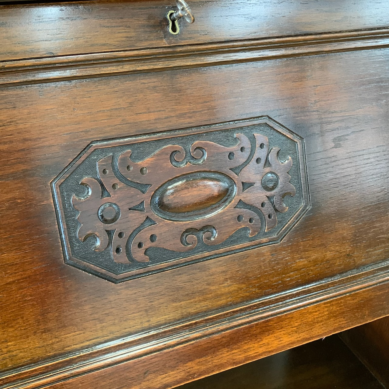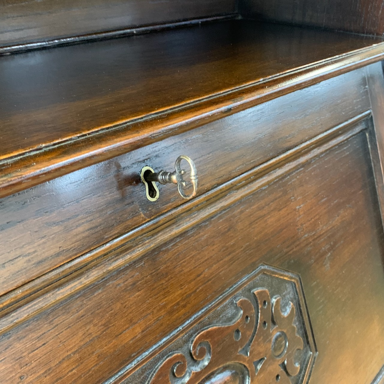トップのフレットワーク、コンパクトな扉収納やフラップのデザインなど、アンティークらしいユニークなポイントが満載の家具です。