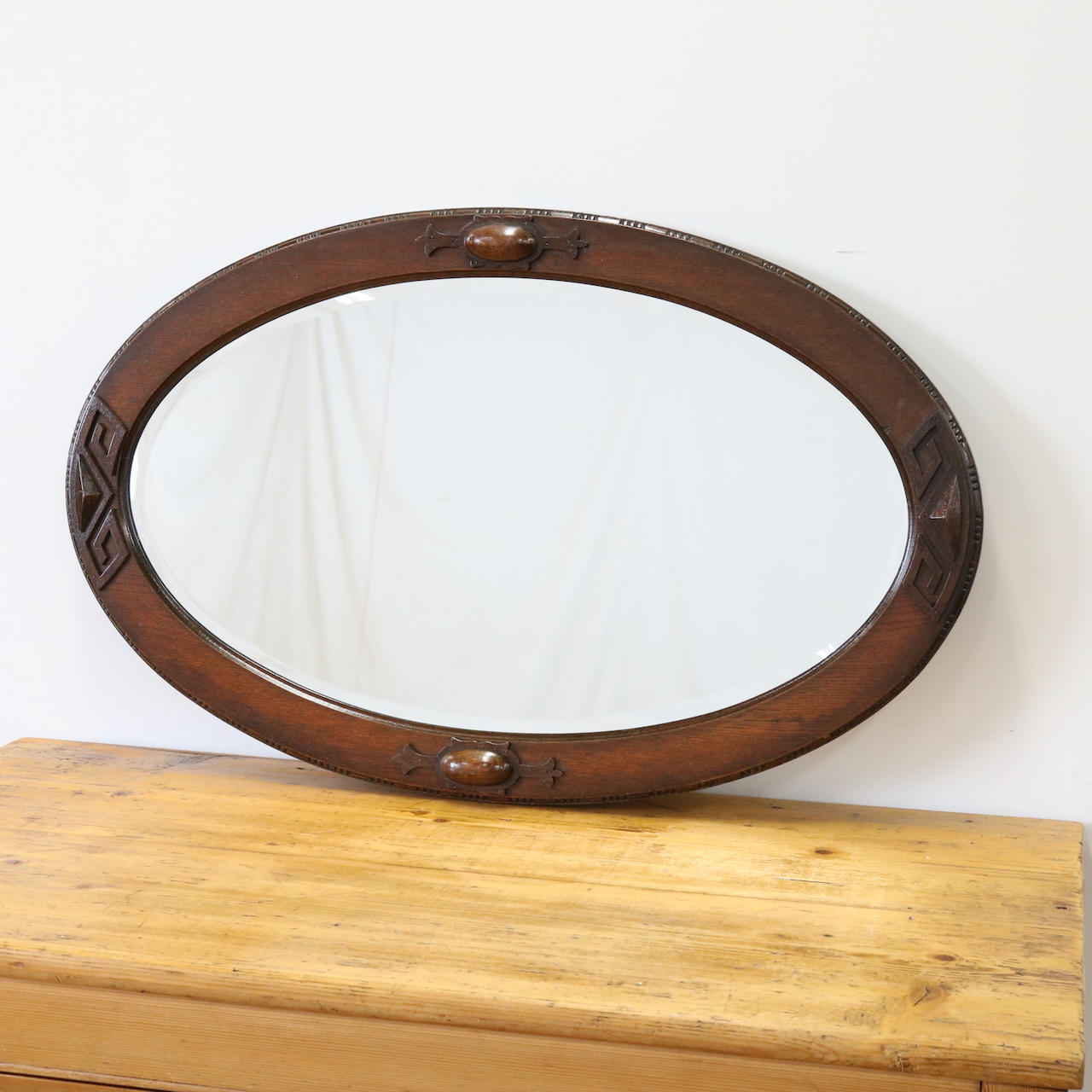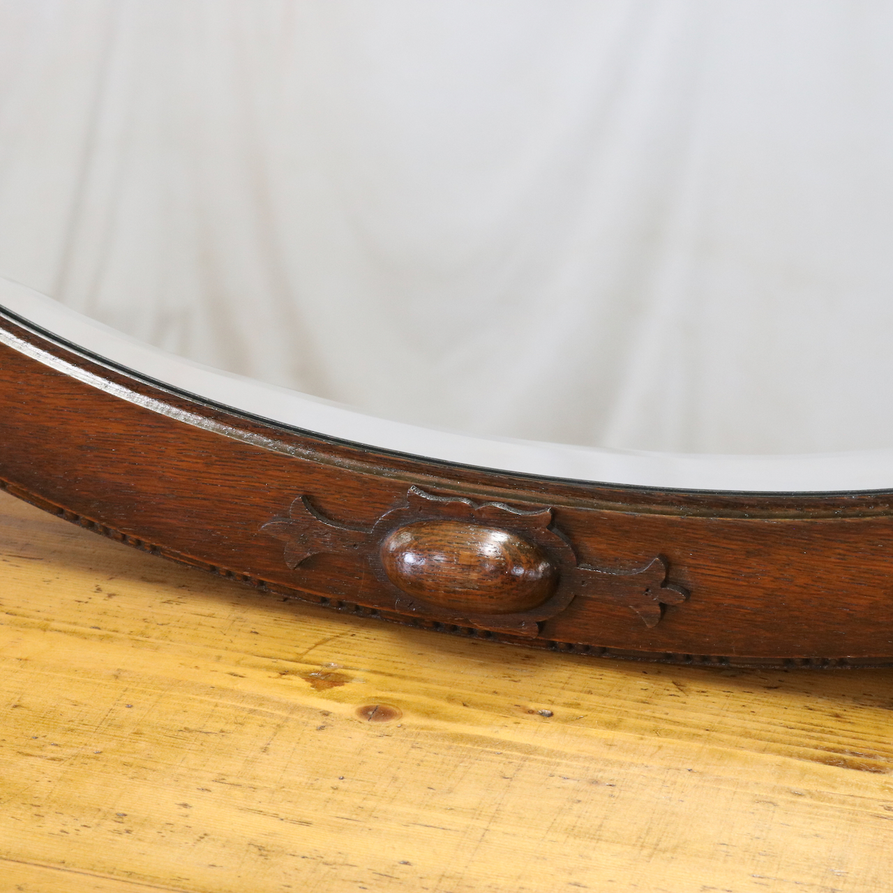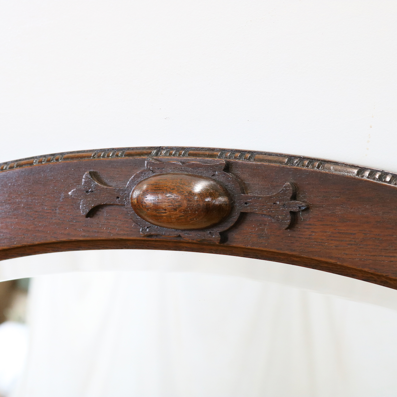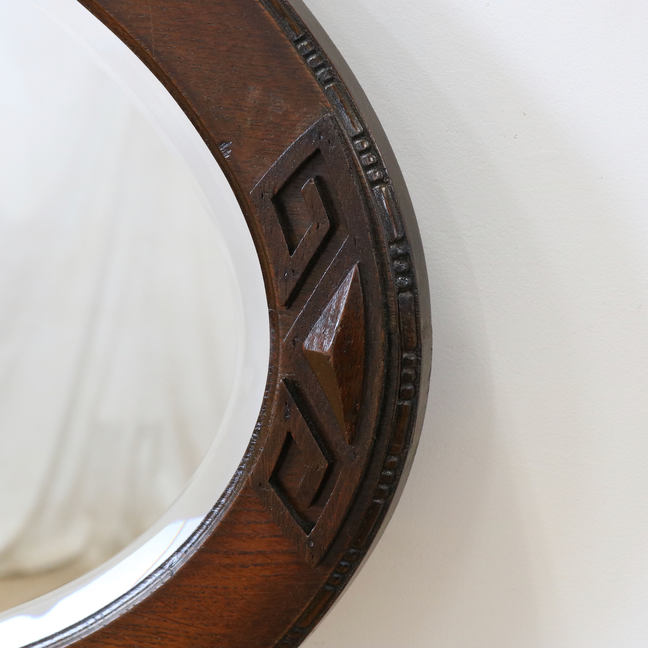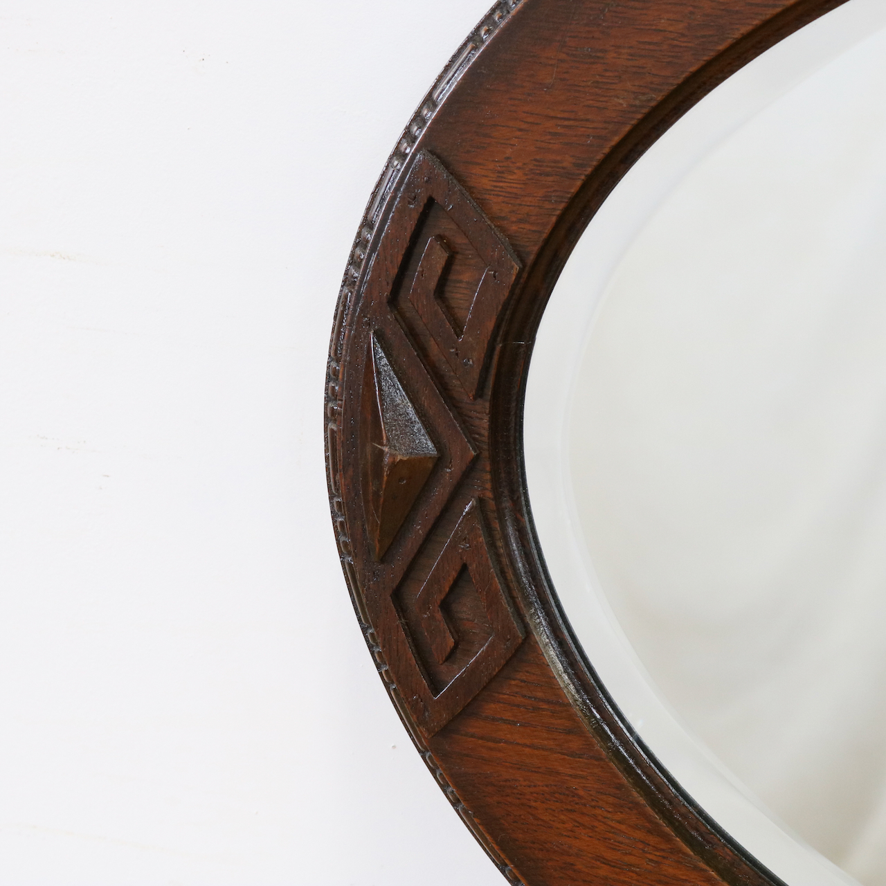 1930年代、オーク材のウッドフレームミラー。オーク材家具でよく見られる卵形の装飾と、幾何学的な紋様が組み合わされてユニークなアイテムに仕上がっています。