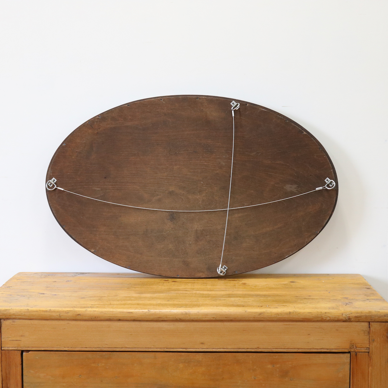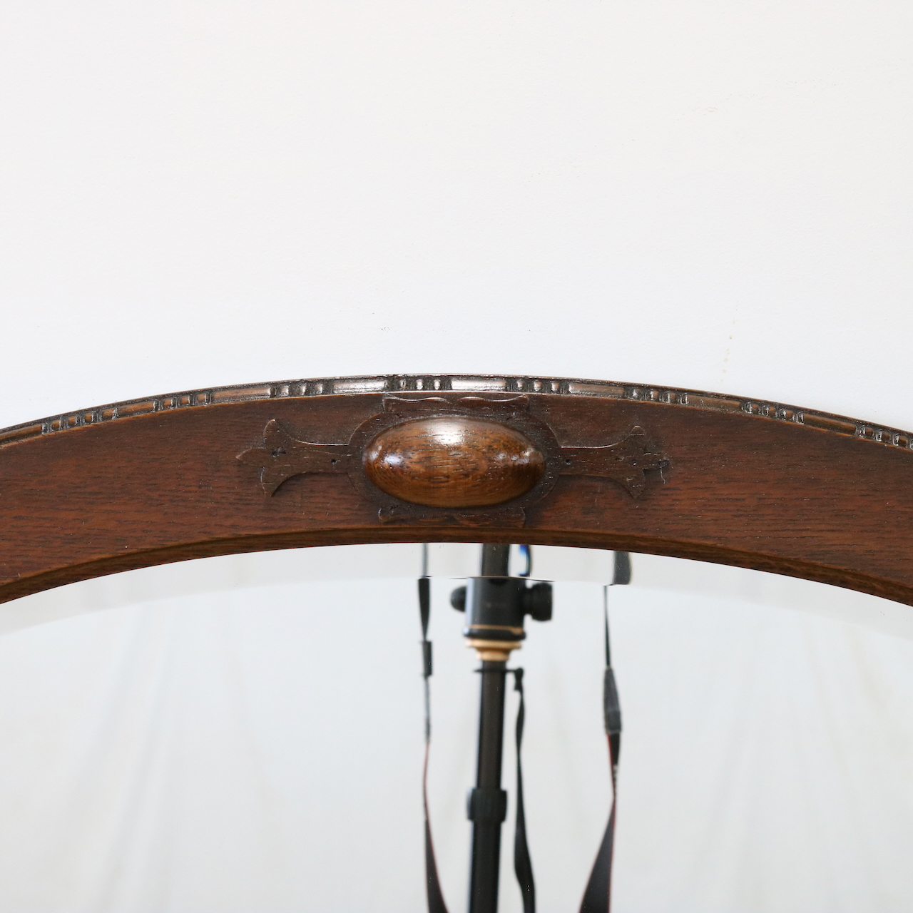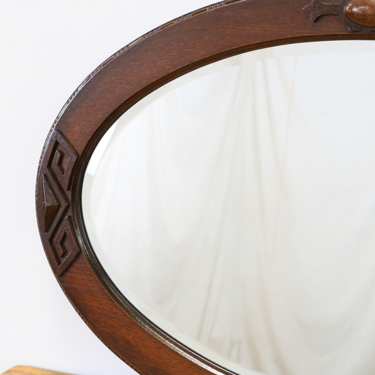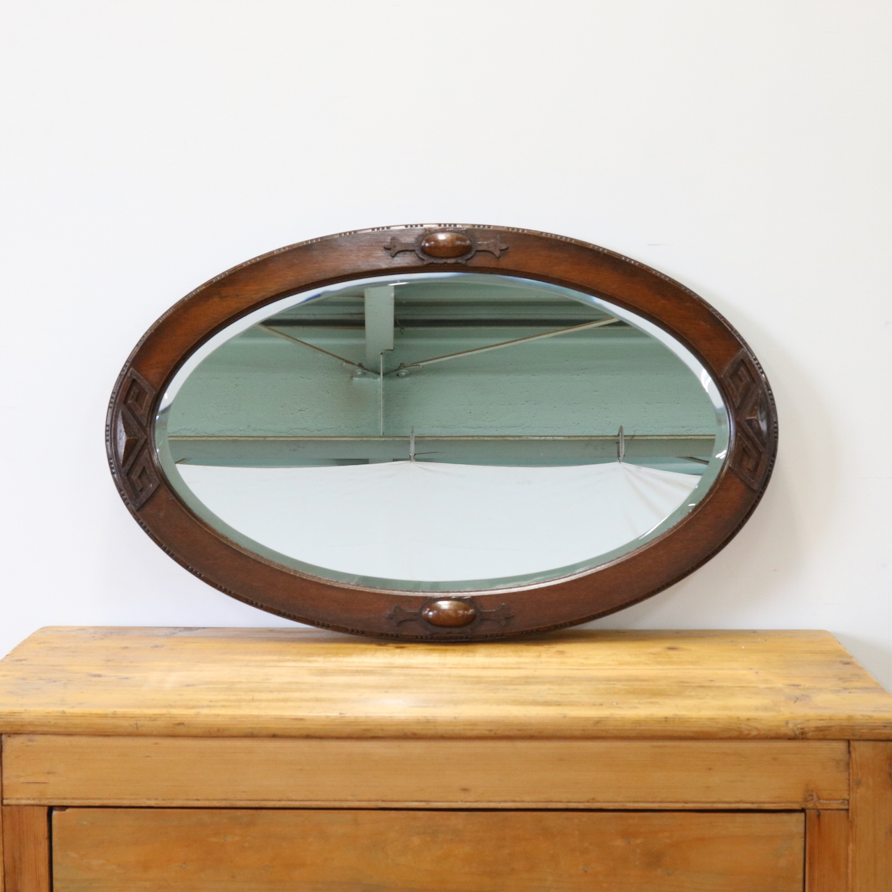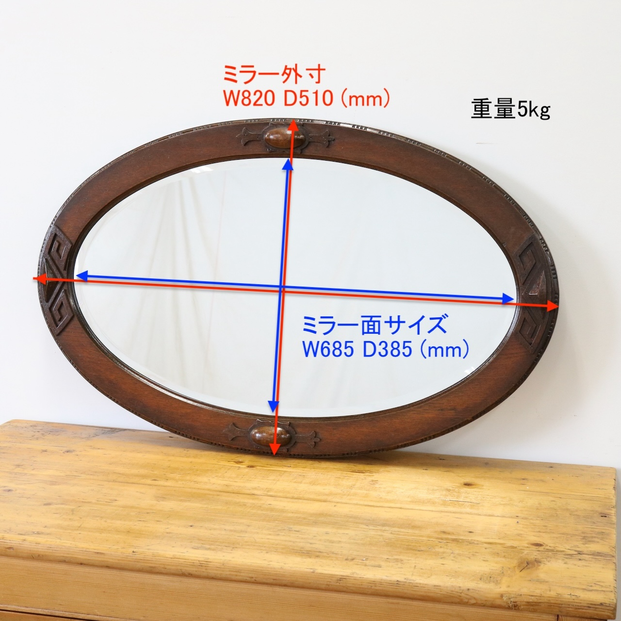 1930年代、オーク材のウッドフレームミラー。オーク材家具でよく見られる卵形の装飾と、幾何学的な紋様が組み合わされてユニークなアイテムに仕上がっています。