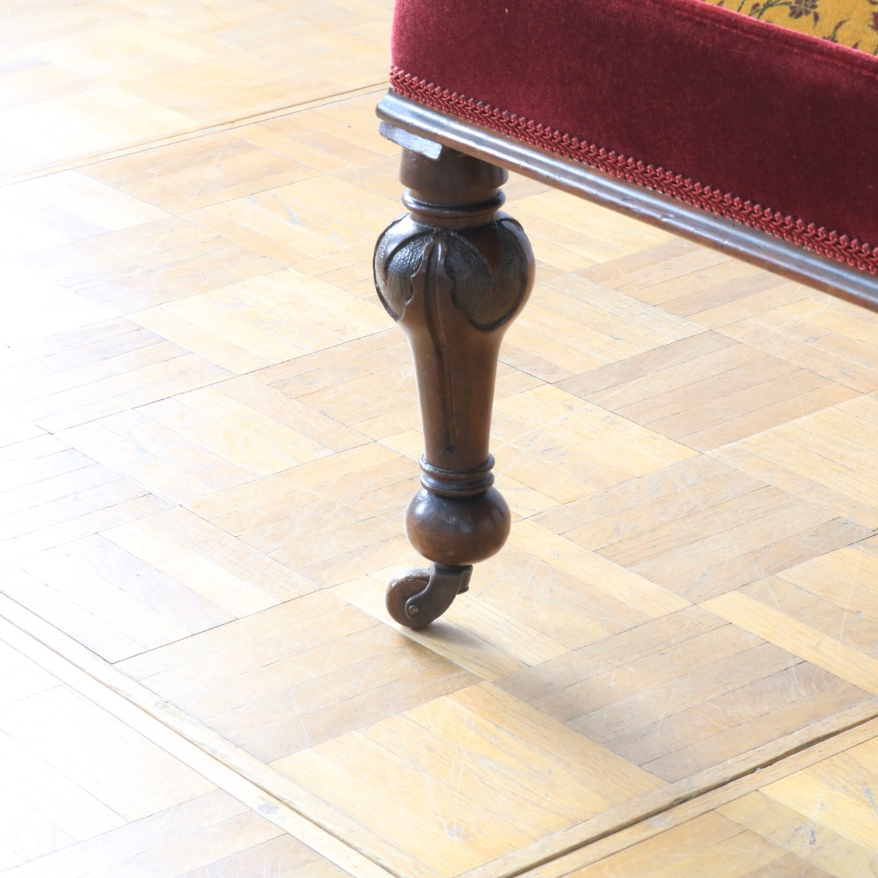 座面は側面が花と同色のベルベット生地で切り返しています。縁はパイピングで仕上げ、座り心地良く仕上げました。