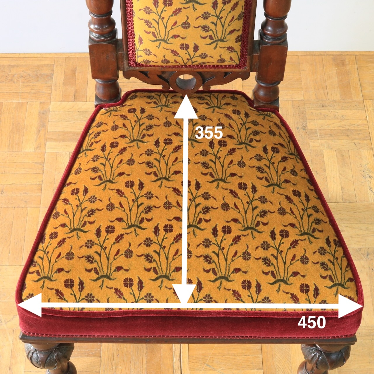 通常通りにお座りいただくことは勿論、お祈りの際には座面に膝立ち、背もたれの上で腕を組んでお祈りをしていました。現代ではお部屋や玄関のアクセントとして、華のあるファブリックで優美に仕上げました。