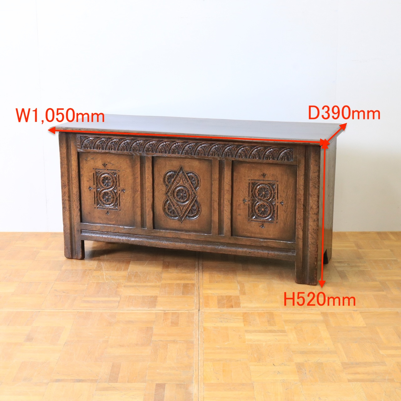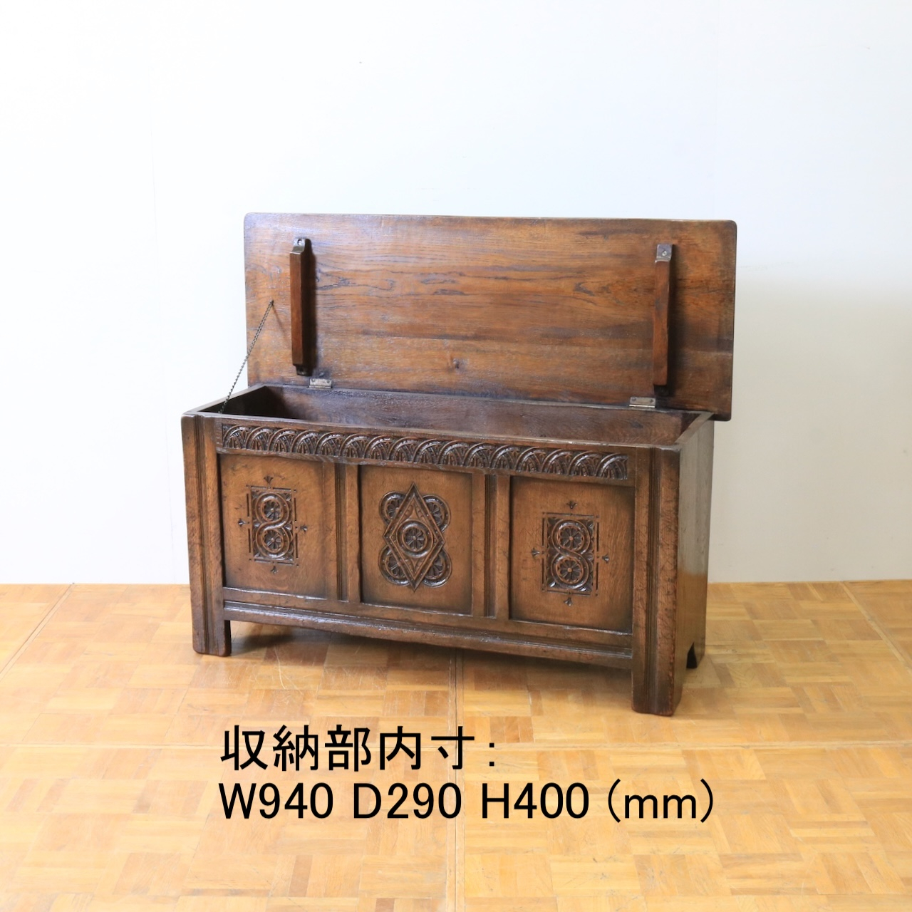配送料の目安 ▶︎オーク材のブランケットチェスト。オーク材の深い風合いが魅力で、教会建築に見られるような緻密な彫刻装飾も個性ある雰囲気を生み出しています。