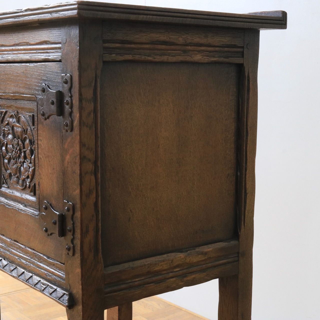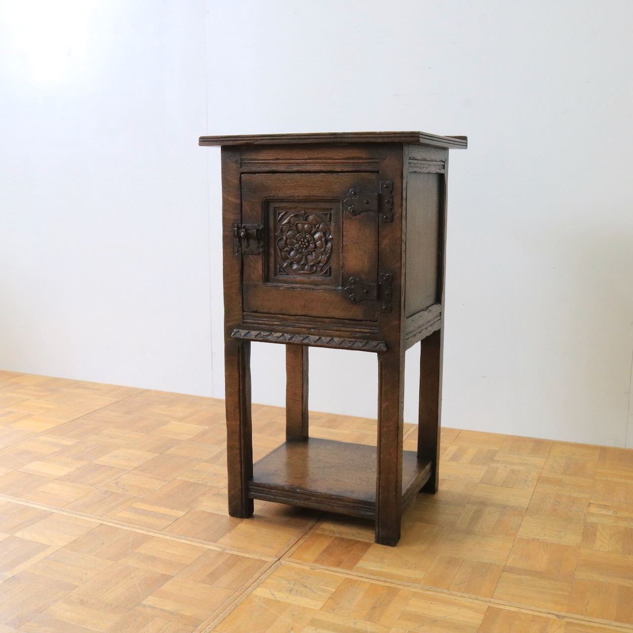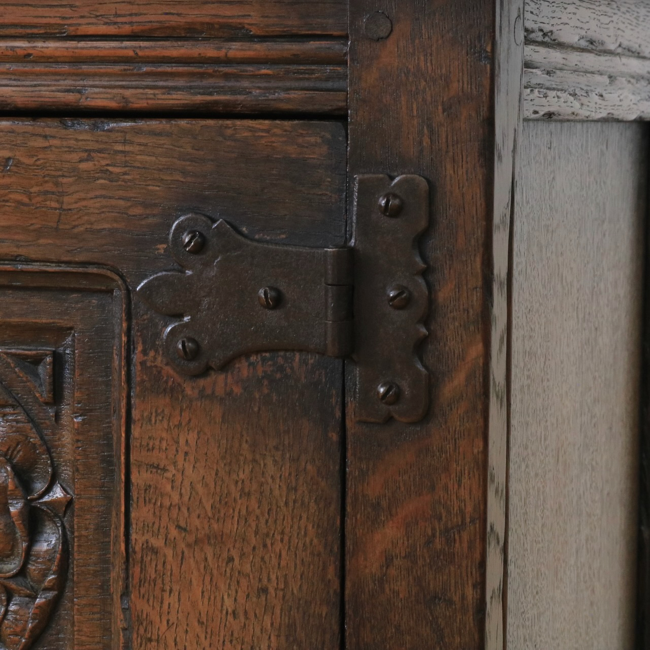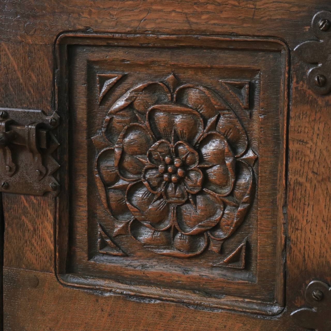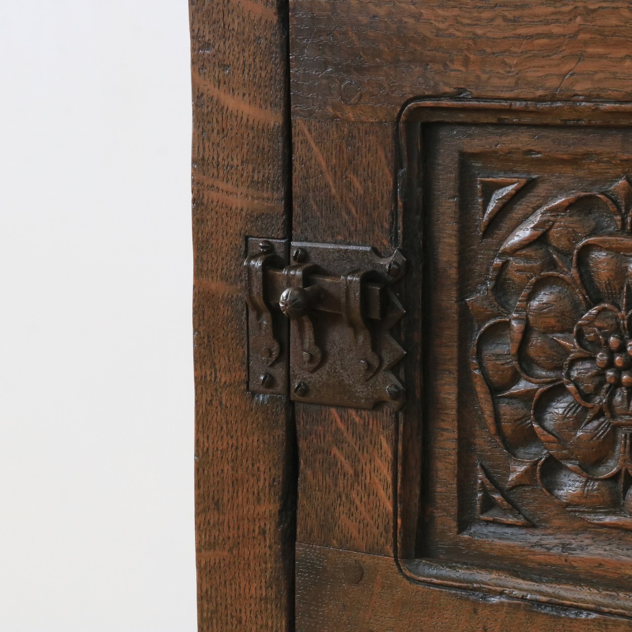 正面の扉は重厚感のある大ぶりな金物とチューダーローズの彫刻が目を惹きます。