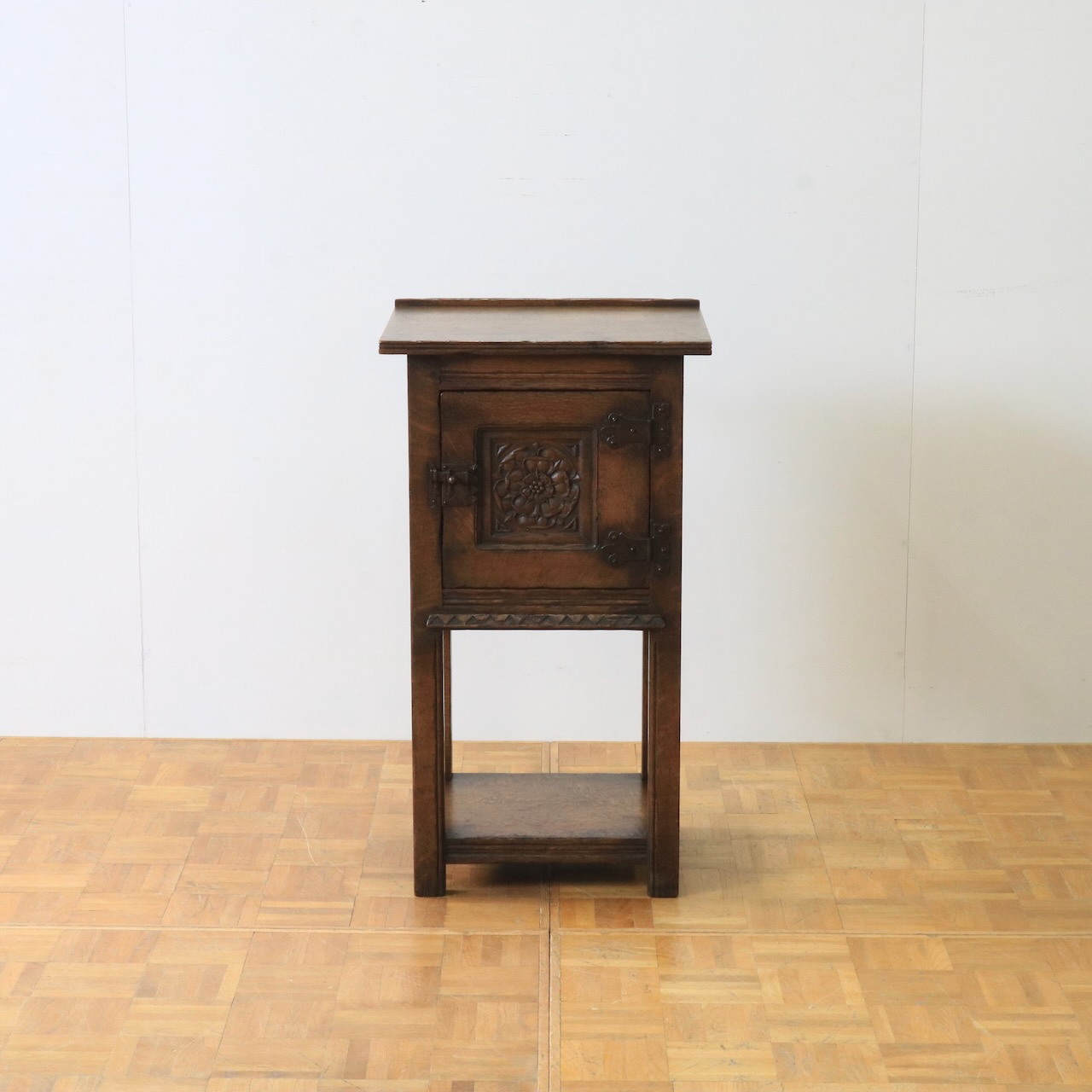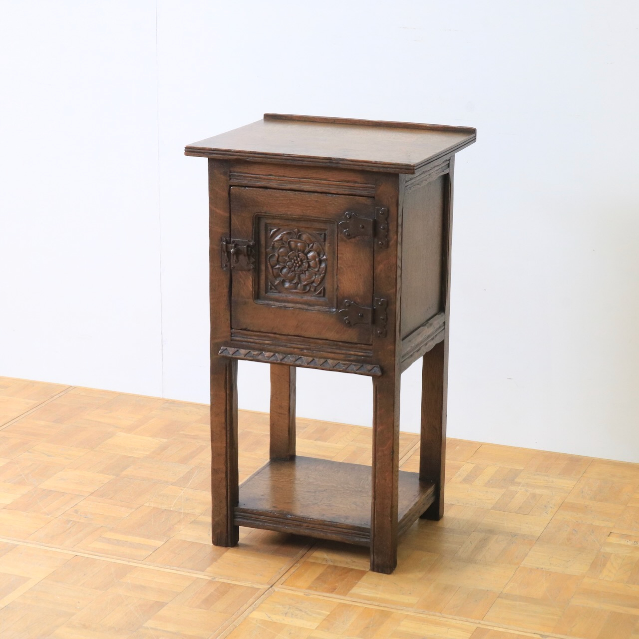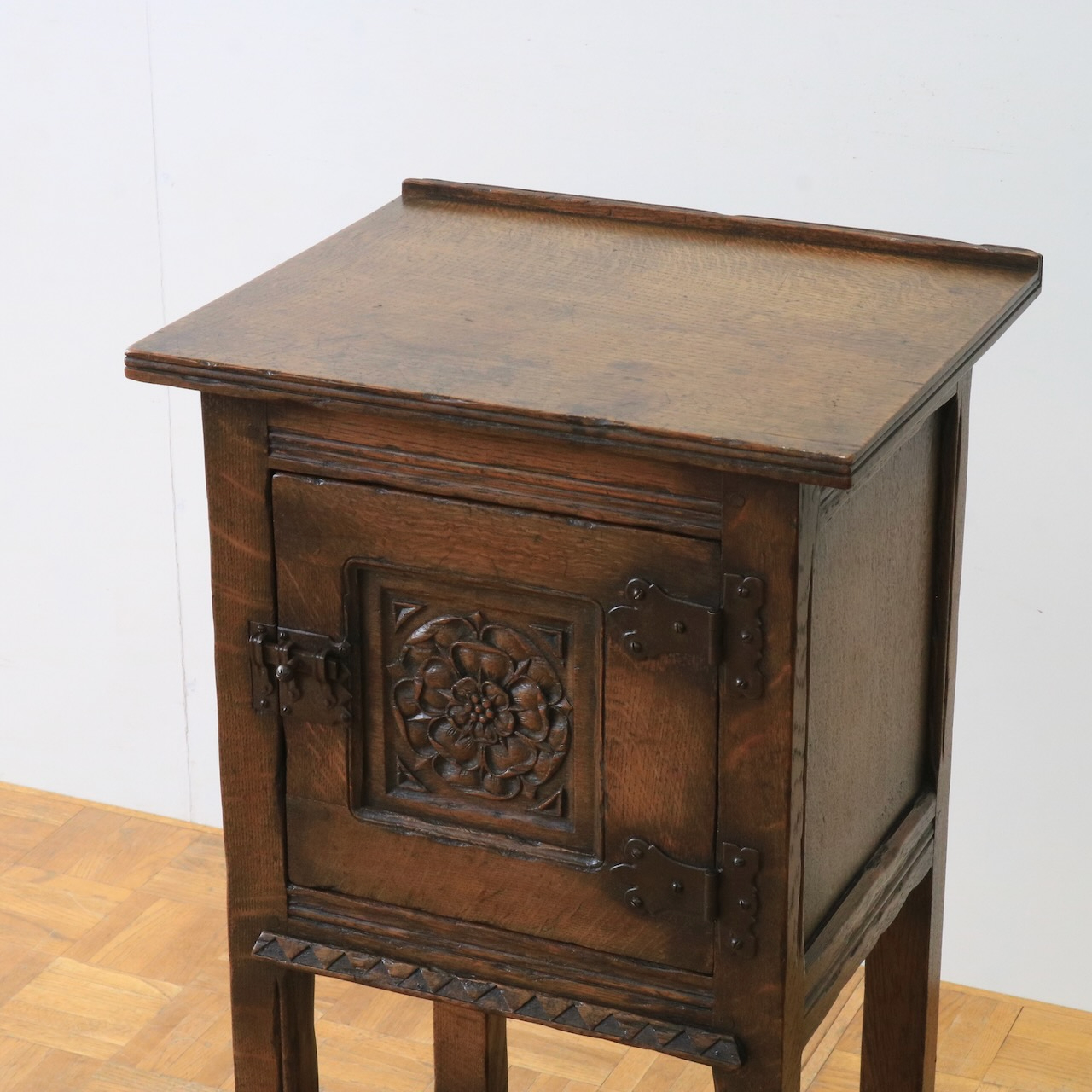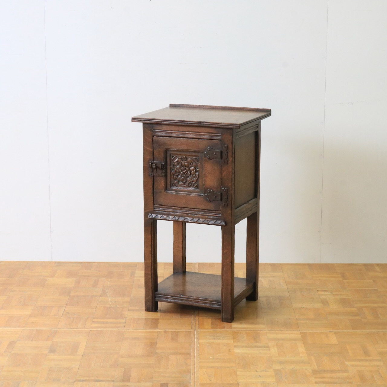 正面の扉は重厚感のある大ぶりな金物とチューダーローズの彫刻が目を惹きます。