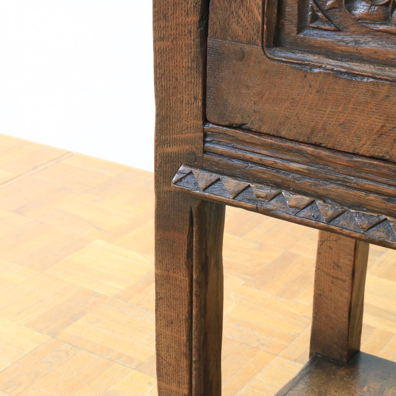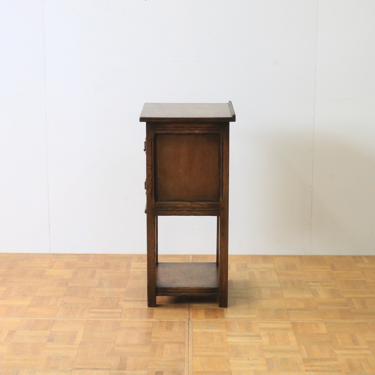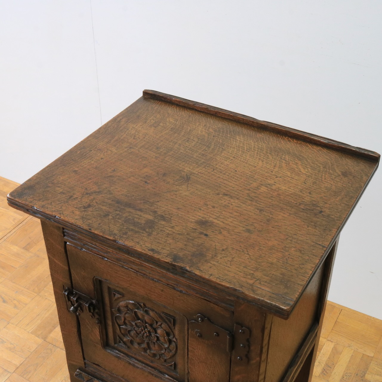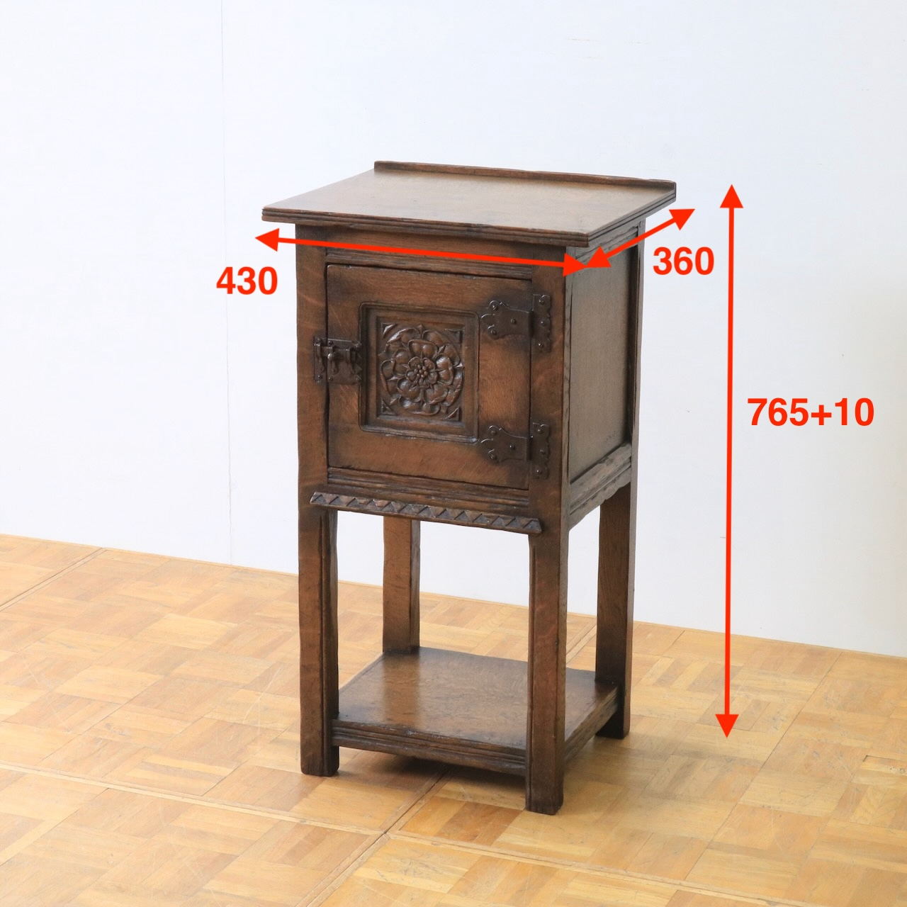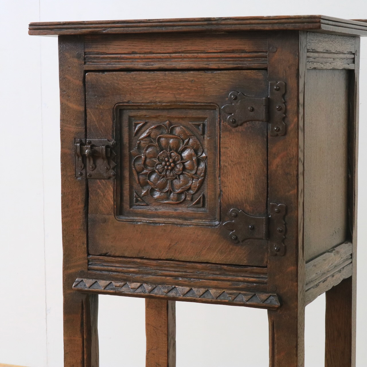 正面の扉は重厚感のある大ぶりな金物とチューダーローズの彫刻が目を惹きます。