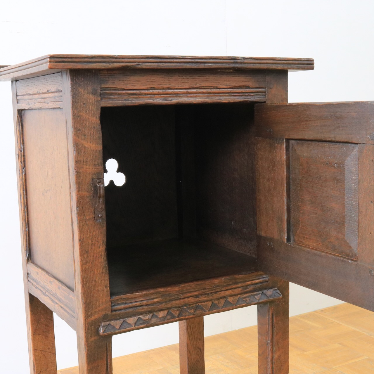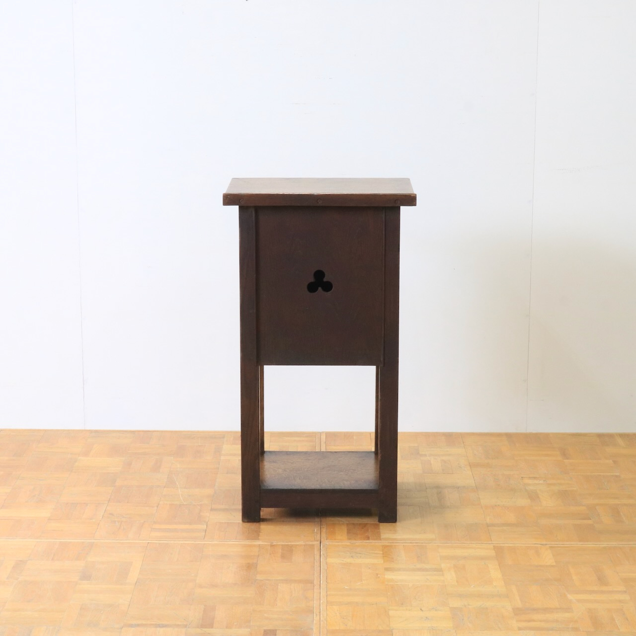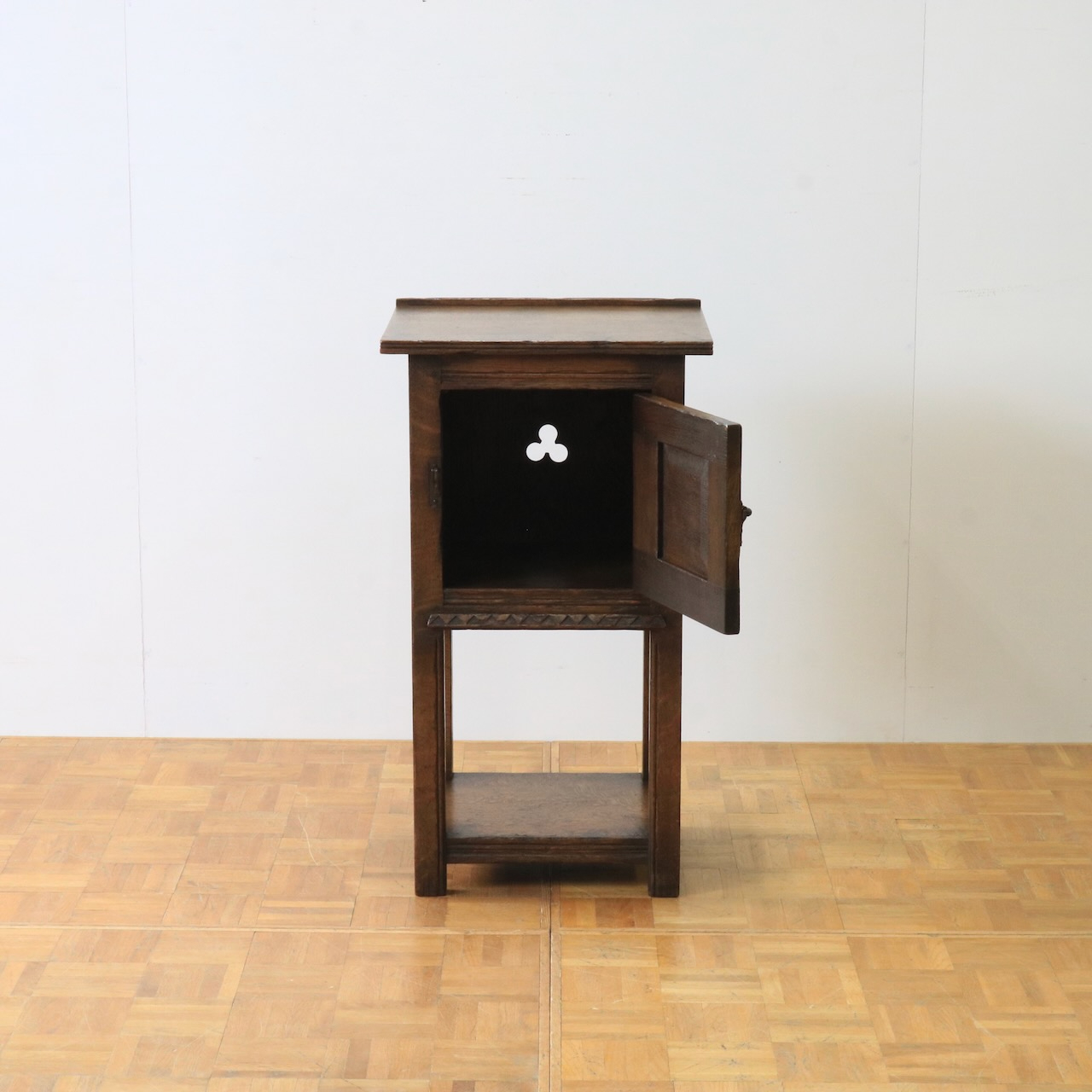 扉を開くとチャームポイントであるクローバー型にくり抜かれた背板があらわれます。光が入るとより透かしが引き立ちますね。