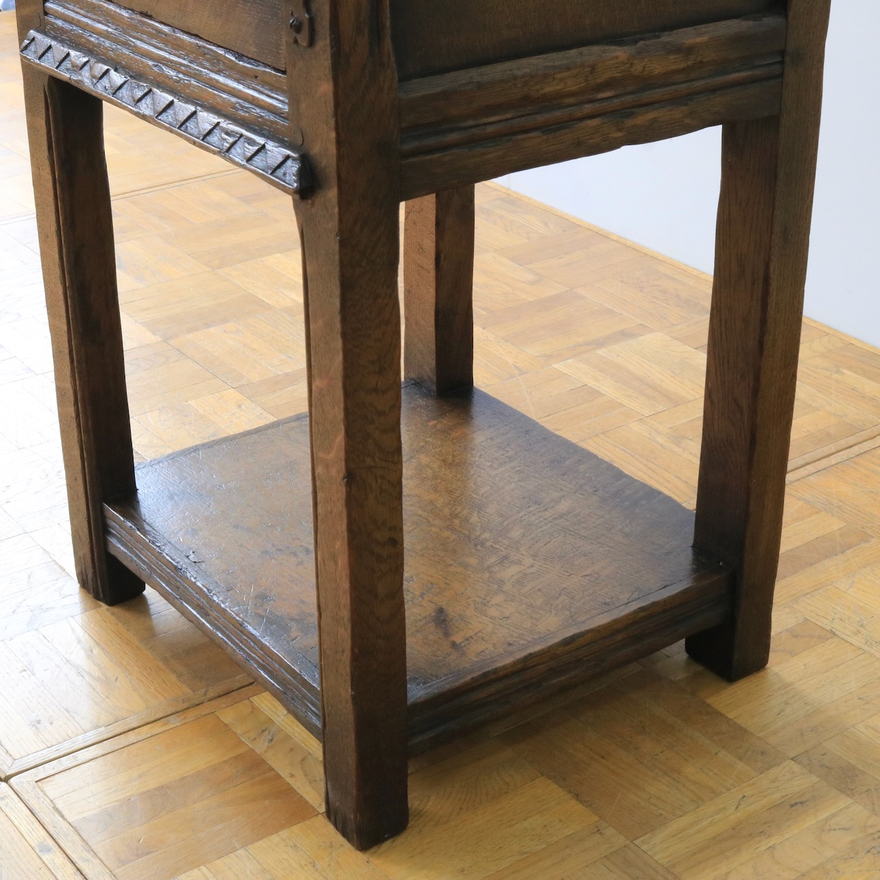 脚先にかけてストレートなデザイン。アクセントにラインが彫られ、収納部分下には下台もついています。