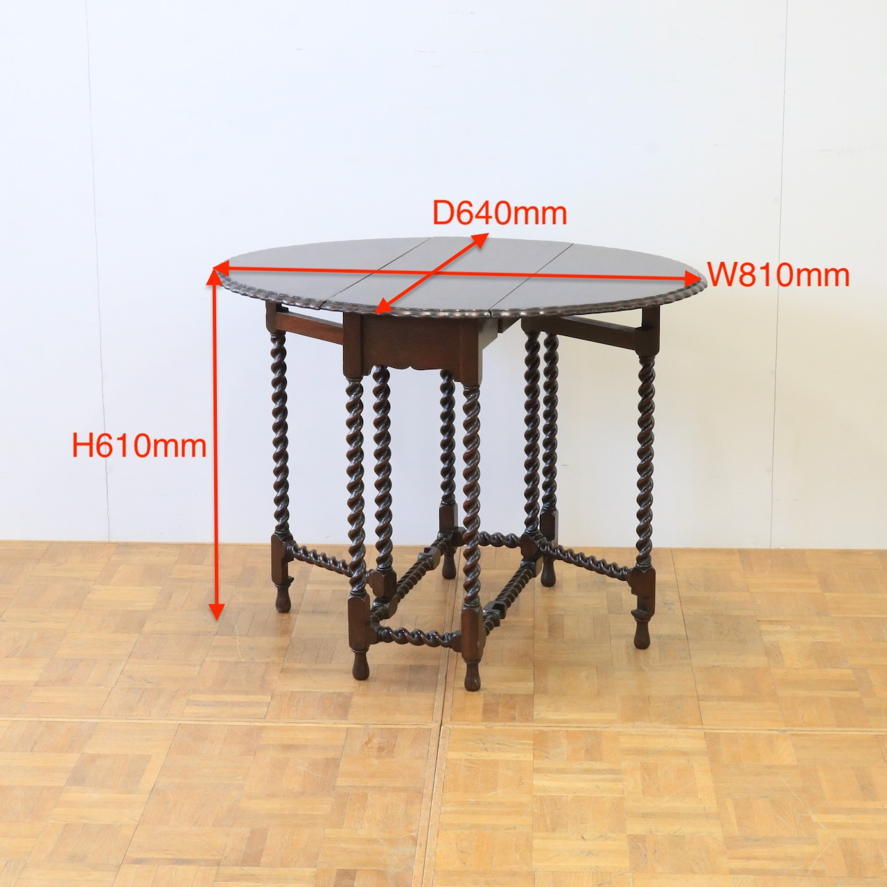 1920年代、マホガニー材のゲートレッグテーブル。使い方により大きさを調節できる便利なテーブルです。細かいピッチのツイストレッグが印象的。