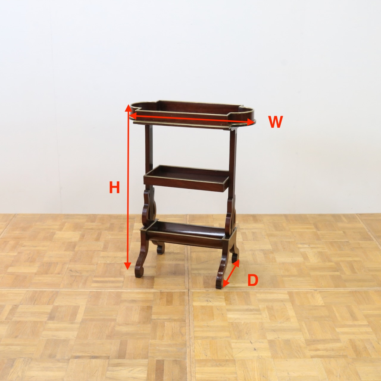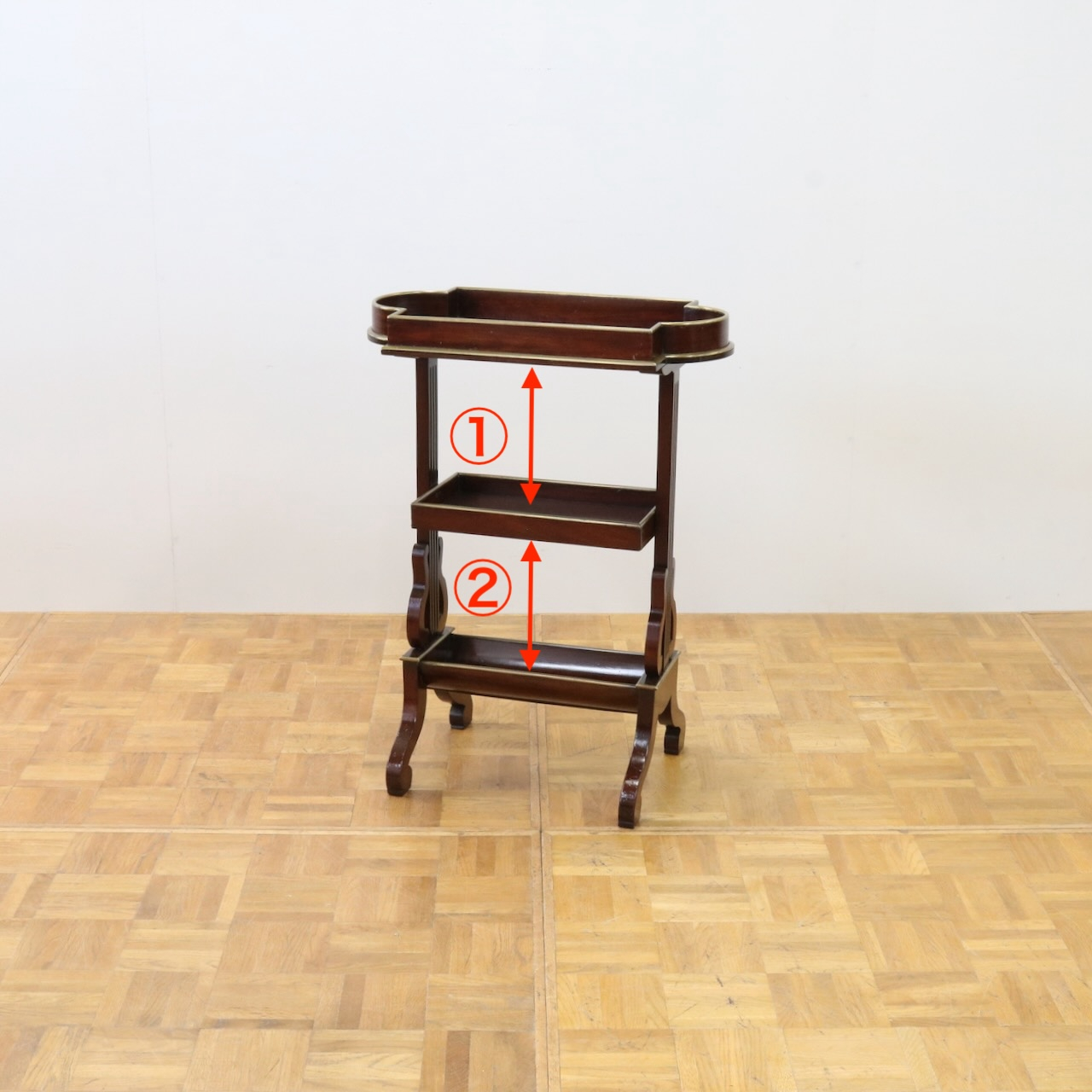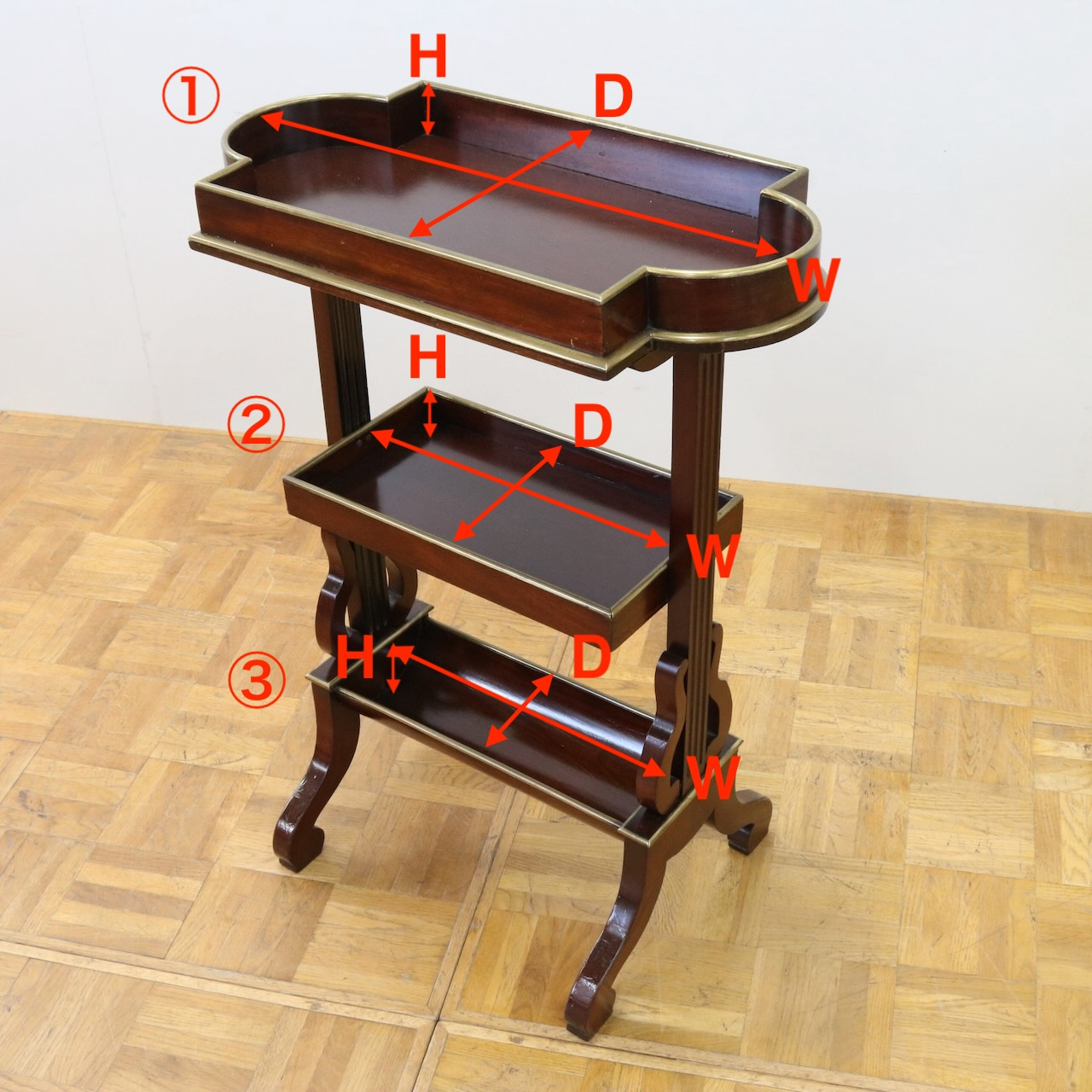 配送料の目安 ▶︎1900年代、マホガニーのサイドテーブル。サイドは竪琴のような優雅なデザインが施されています。3段収納で実用性の高さも魅力的。