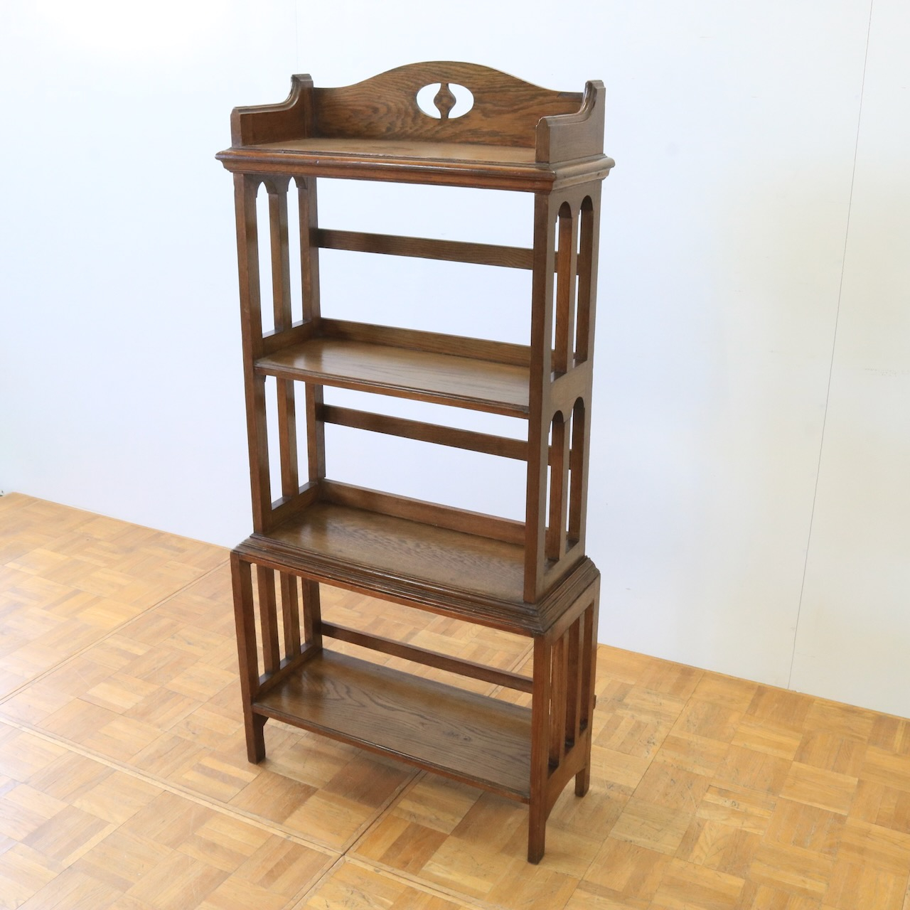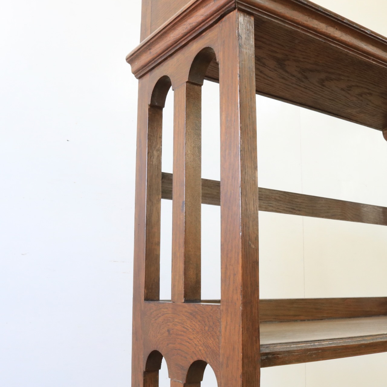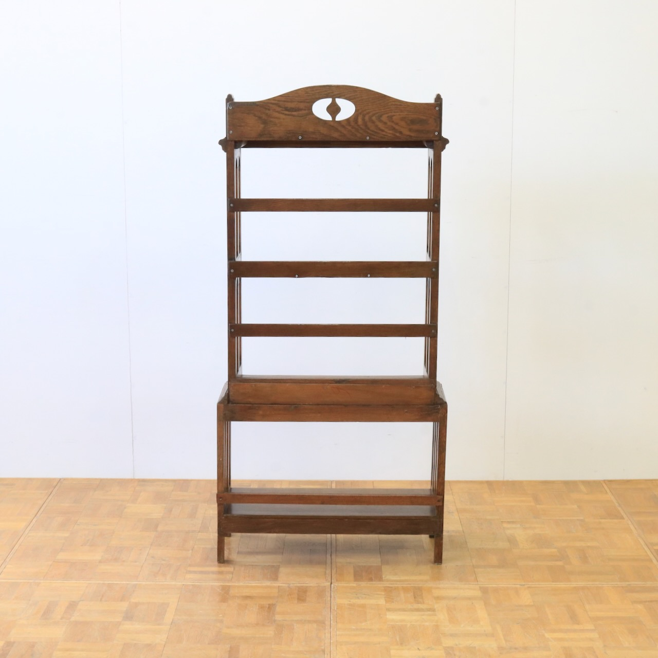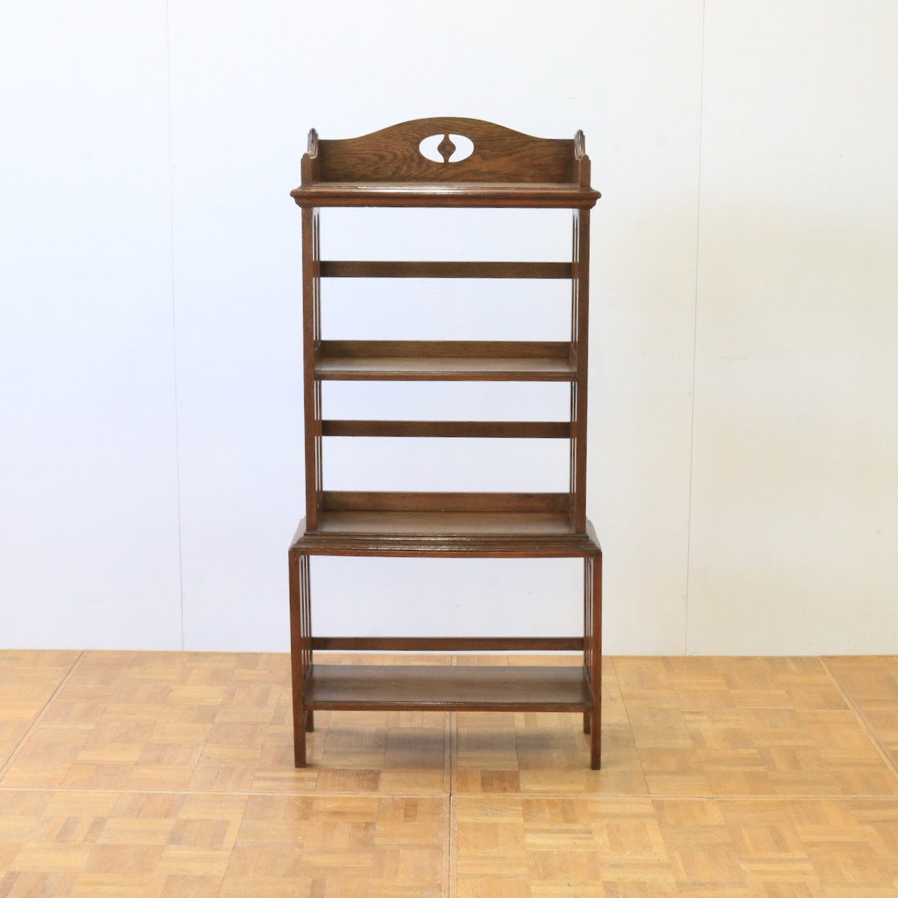 1910年代、オーク材のブックシェルブス。アーツアンドクラフトらしいリズムのある側面の造りや、ポイントに施された有機的なラインが美しいアンティークです。