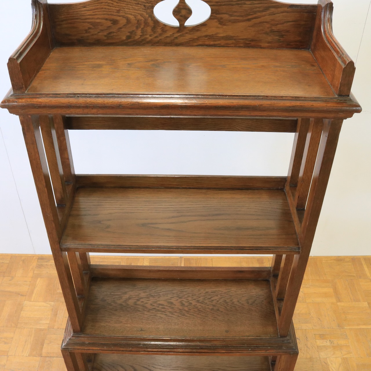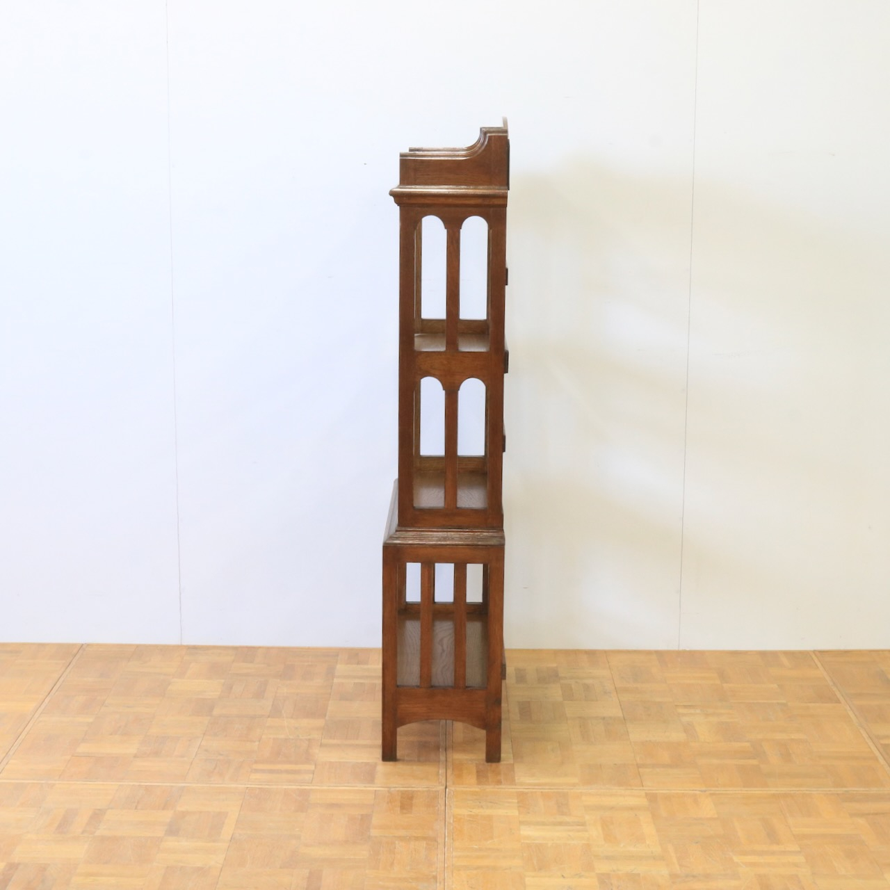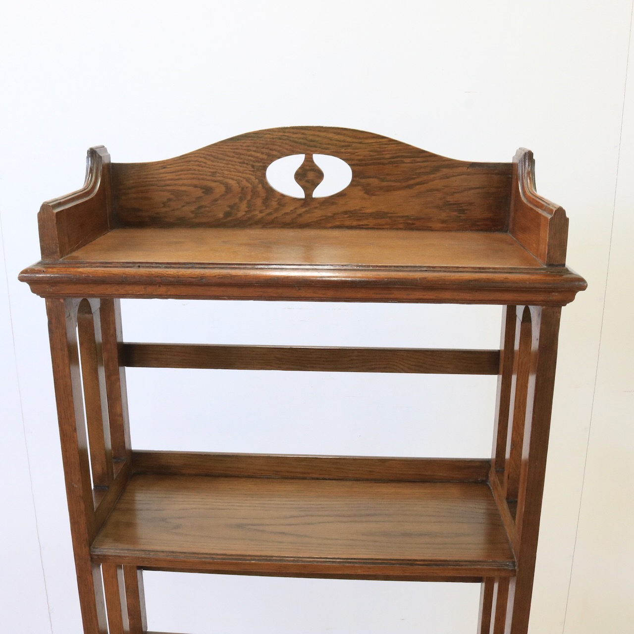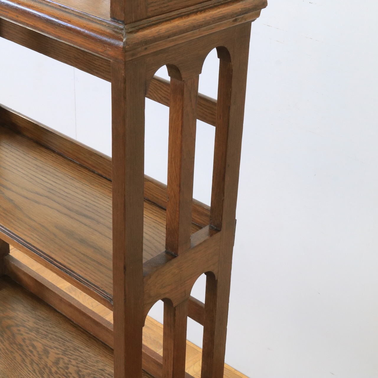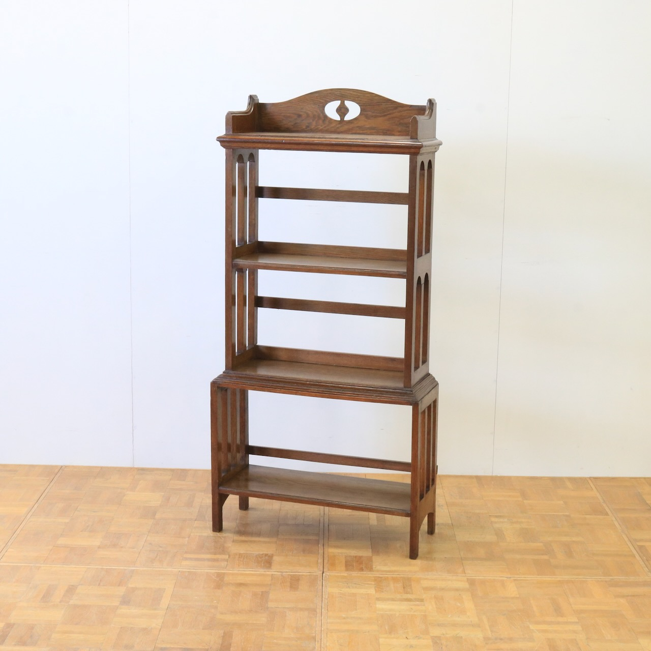 1910年代、オーク材のブックシェルブス。アーツアンドクラフトらしいリズムのある側面の造りや、ポイントに施された有機的なラインが美しいアンティークです。