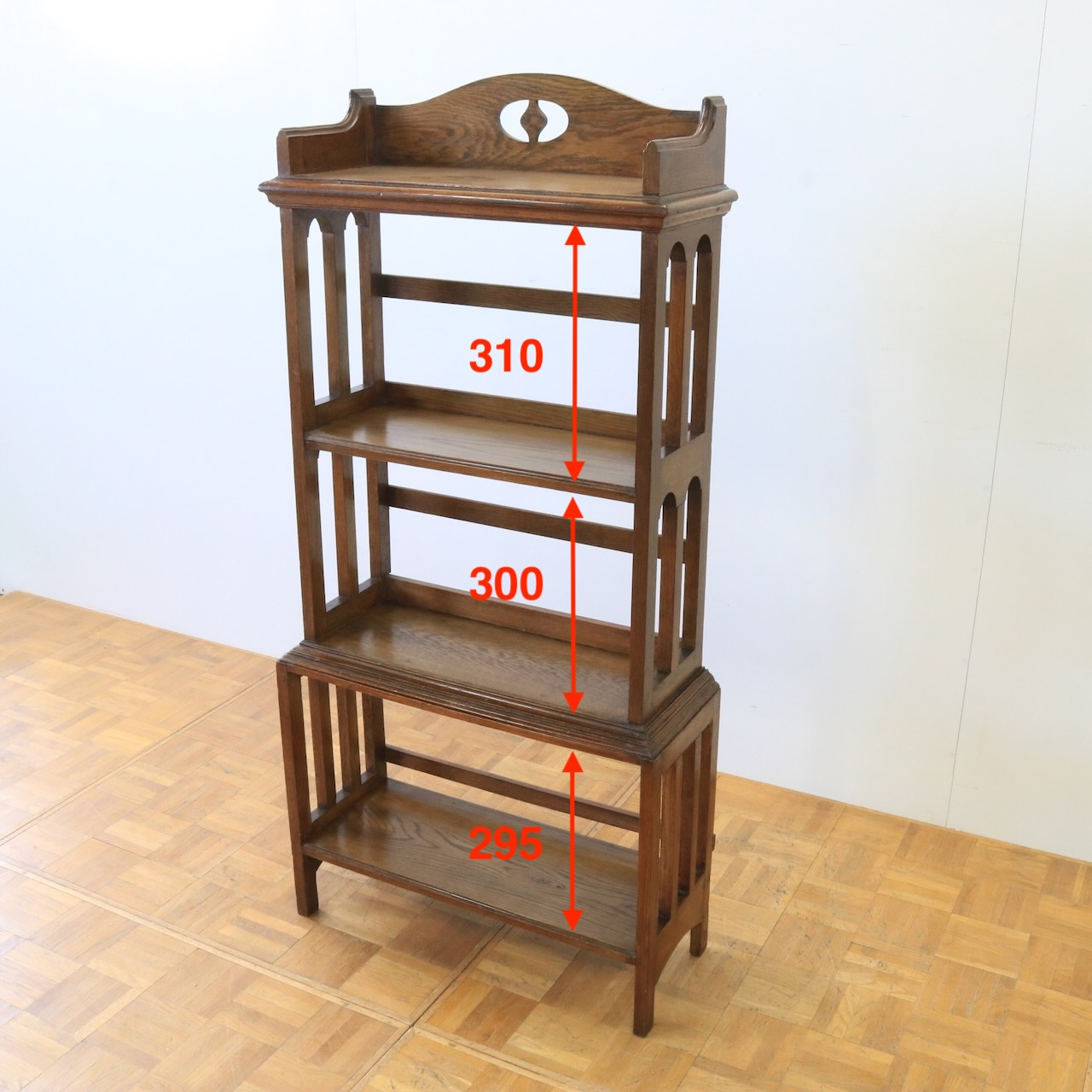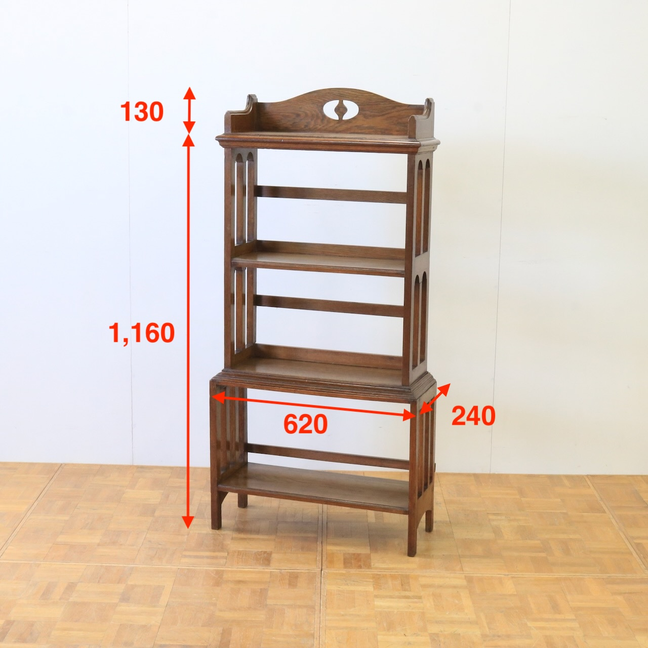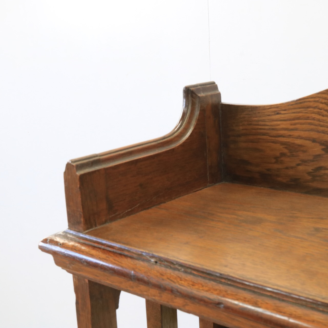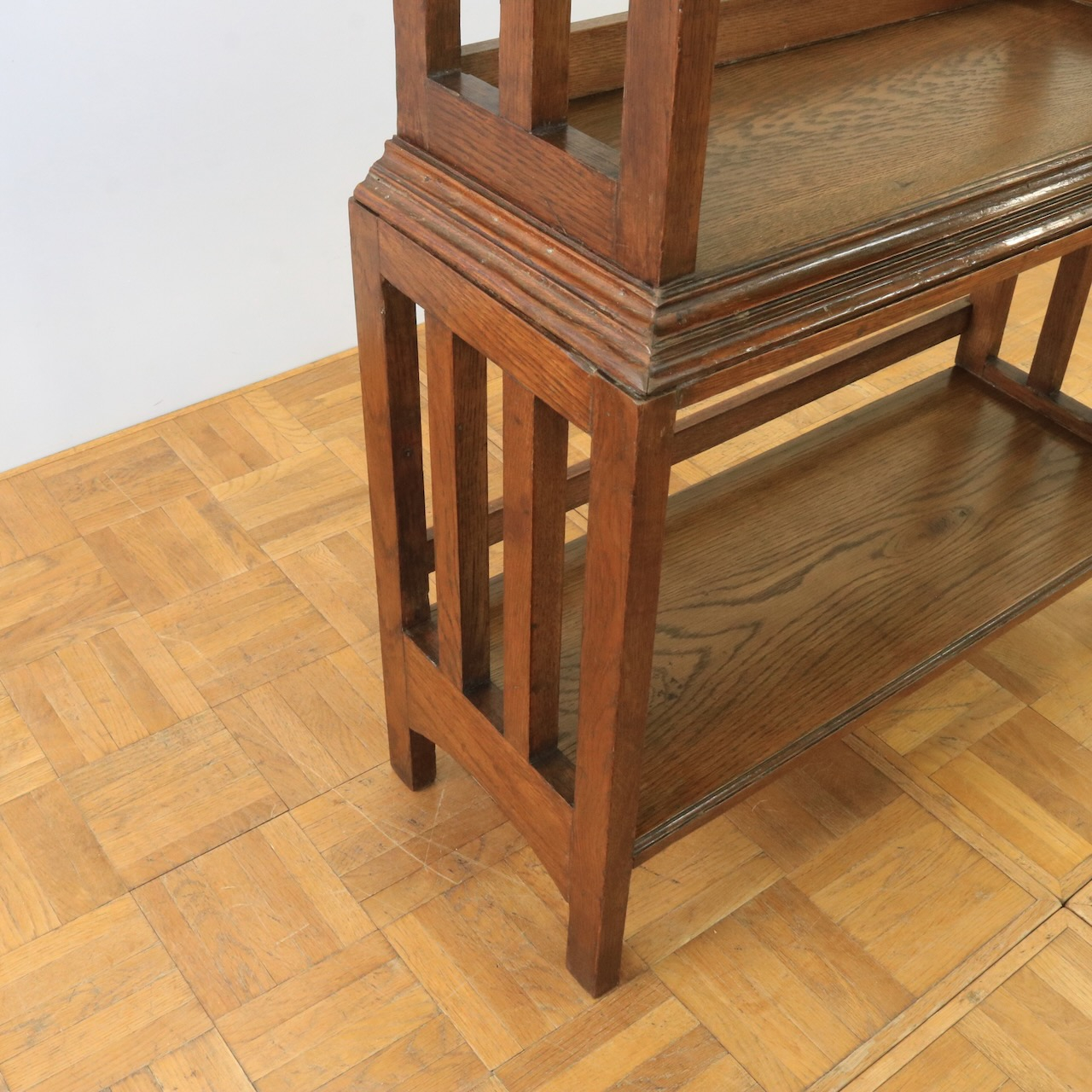 1910年代、オーク材のブックシェルブス。アーツアンドクラフトらしいリズムのある側面の造りや、ポイントに施された有機的なラインが美しいアンティークです。