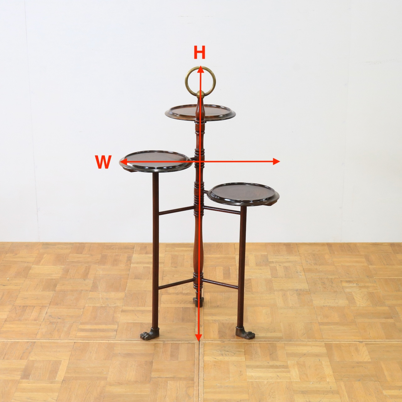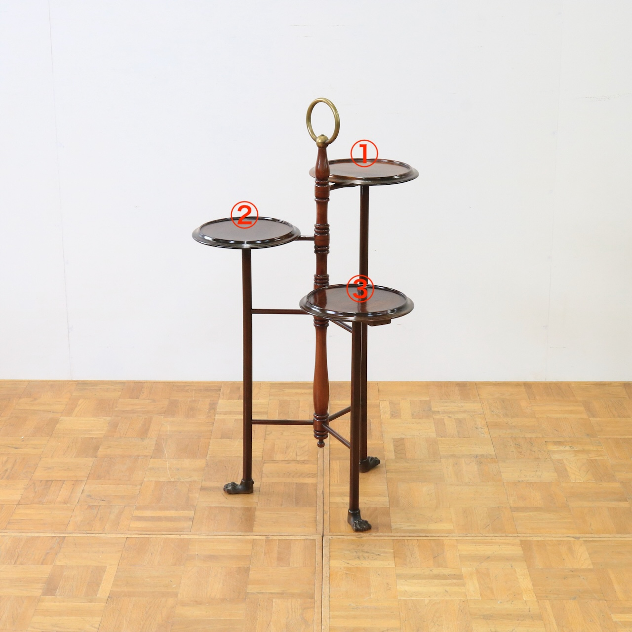 配送料の目安 ▶︎1920年代、イギリス・マホガニーのケーキスタンド。通常のケーキスタンドとは少し違ったデザインです。折りたたみ式ではありません。持ち手が真鍮製で、脚先はパウフィート。スモールファニチャーながらに凝った作りとなっています。
