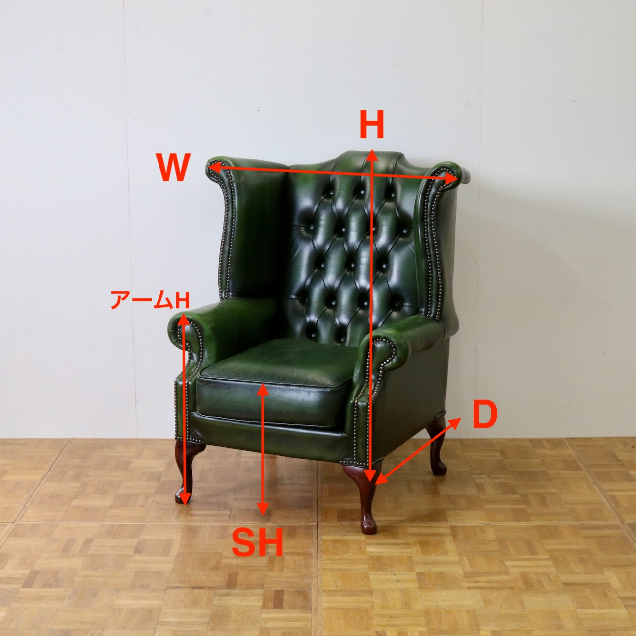 配送料の目安 ▶︎一人用のレザー張りチェスターフィールドソファー。大きく大胆なウィングは存在感があり、クラシックなお部屋の主役になるアイテムです。