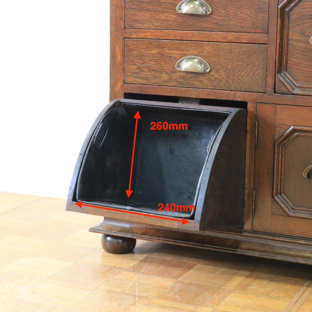 名前の通り歯科医院にて使用されていた収納家具です。当時の医療用家具ならではの機能性と英国アンティークらしい重厚な佇まいを兼ね備えた魅力的な一台です。