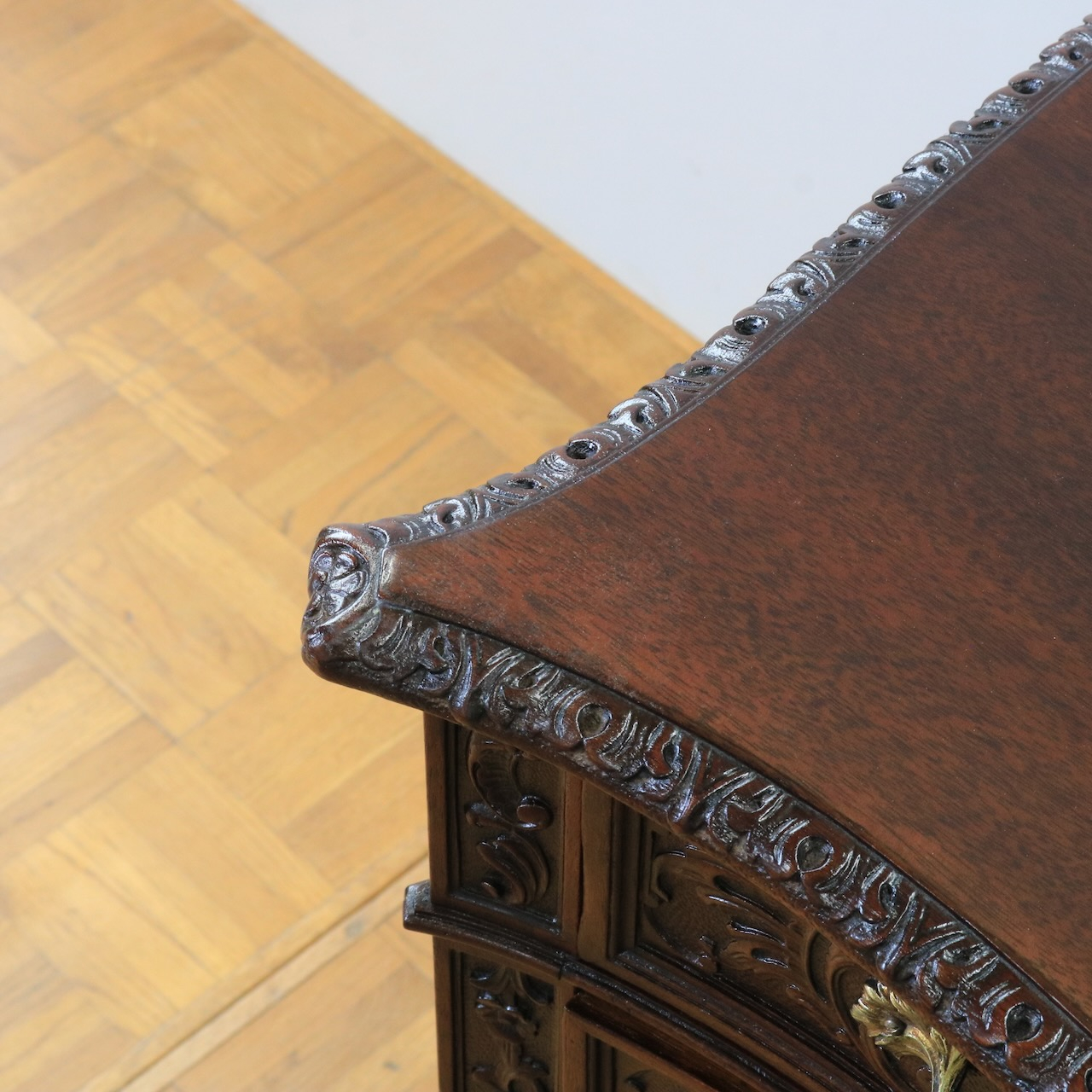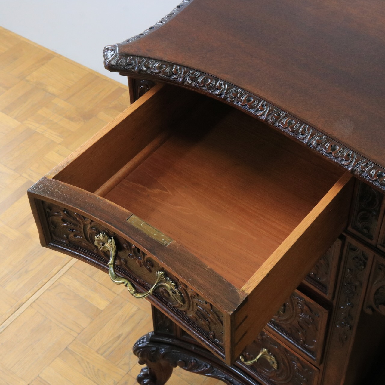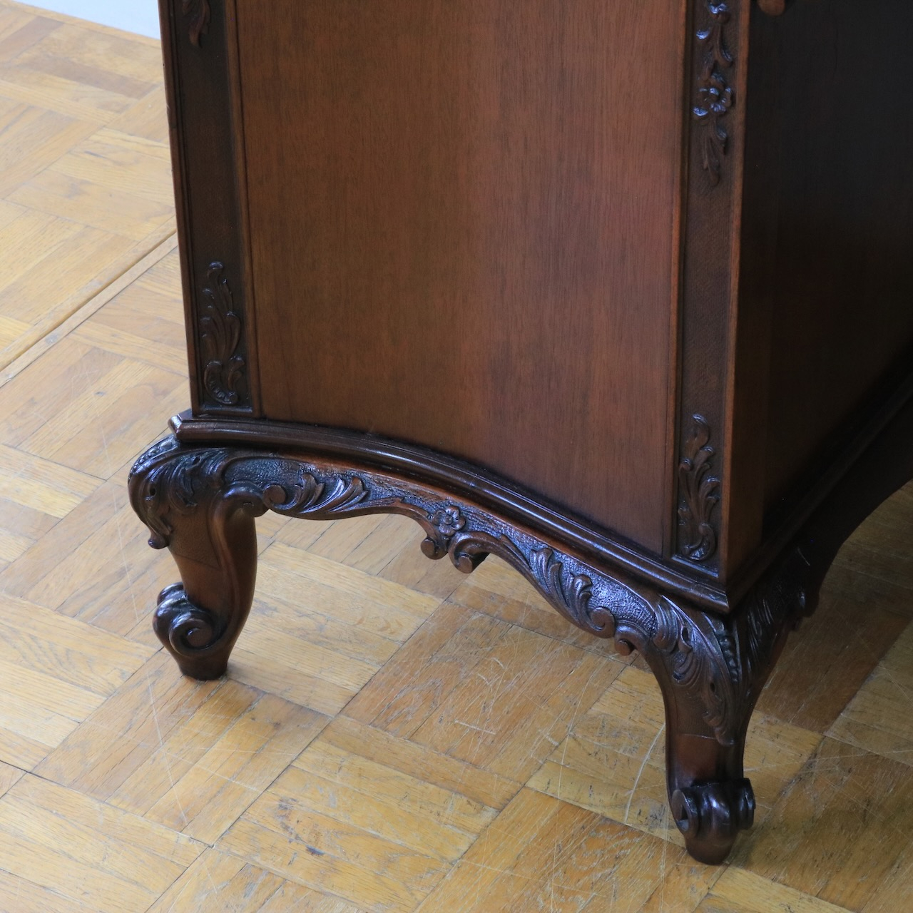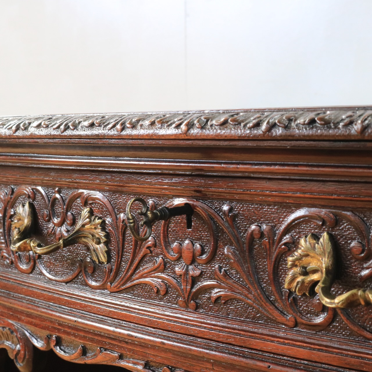 随所に施された彫刻が見事で、職人の技術の高さが伺える意匠です。風格のある佇まいはアンティークらしさを存分に感じられます。是非細部までご覧いただきたい一品です。