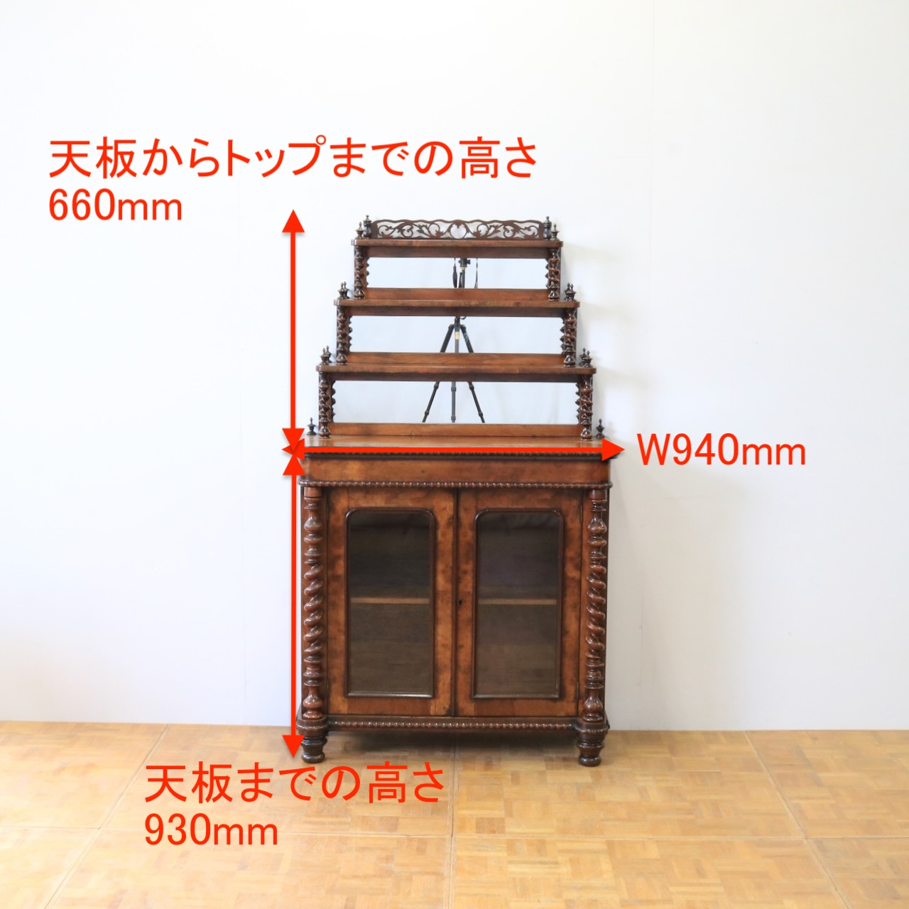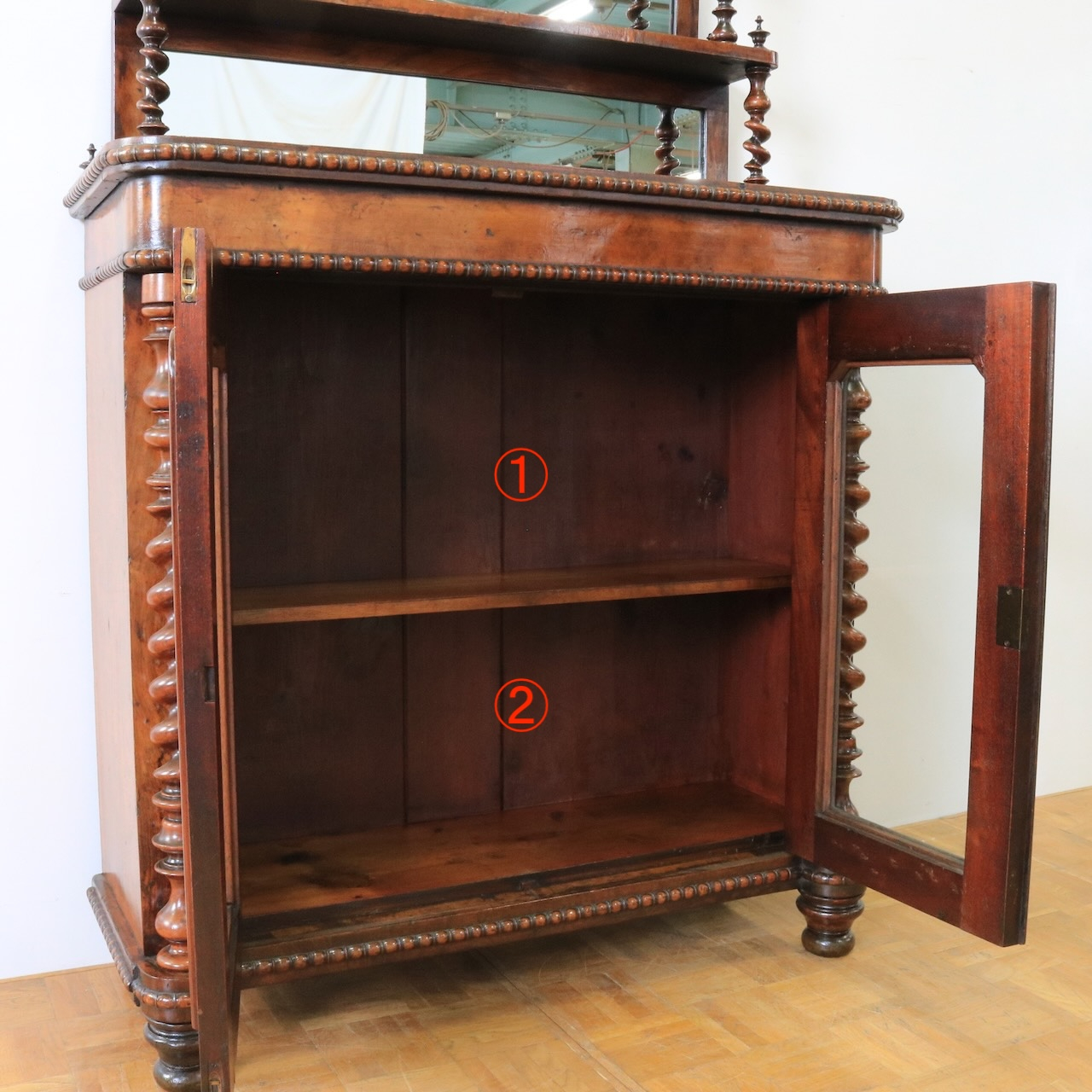 ガラス扉左右にもツイストのコラム、脚周りには玉のモールディングが施され、統一感のある重厚なデザインです。