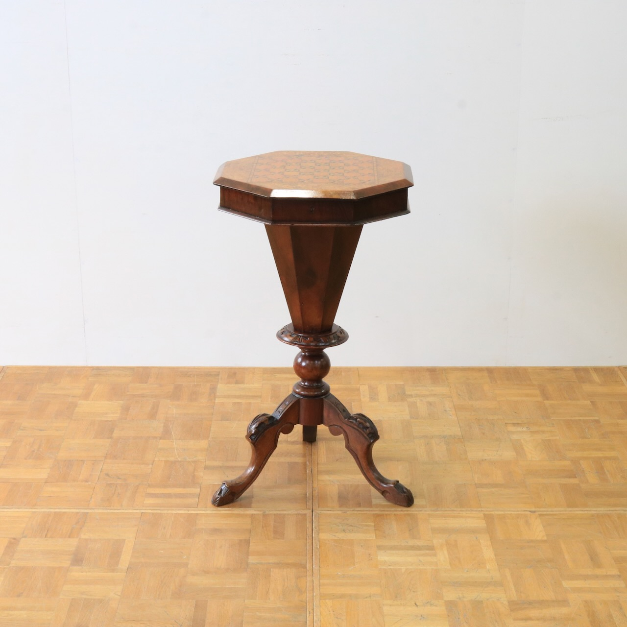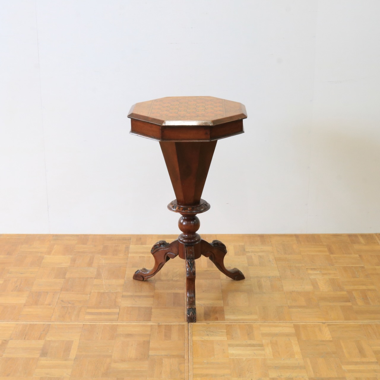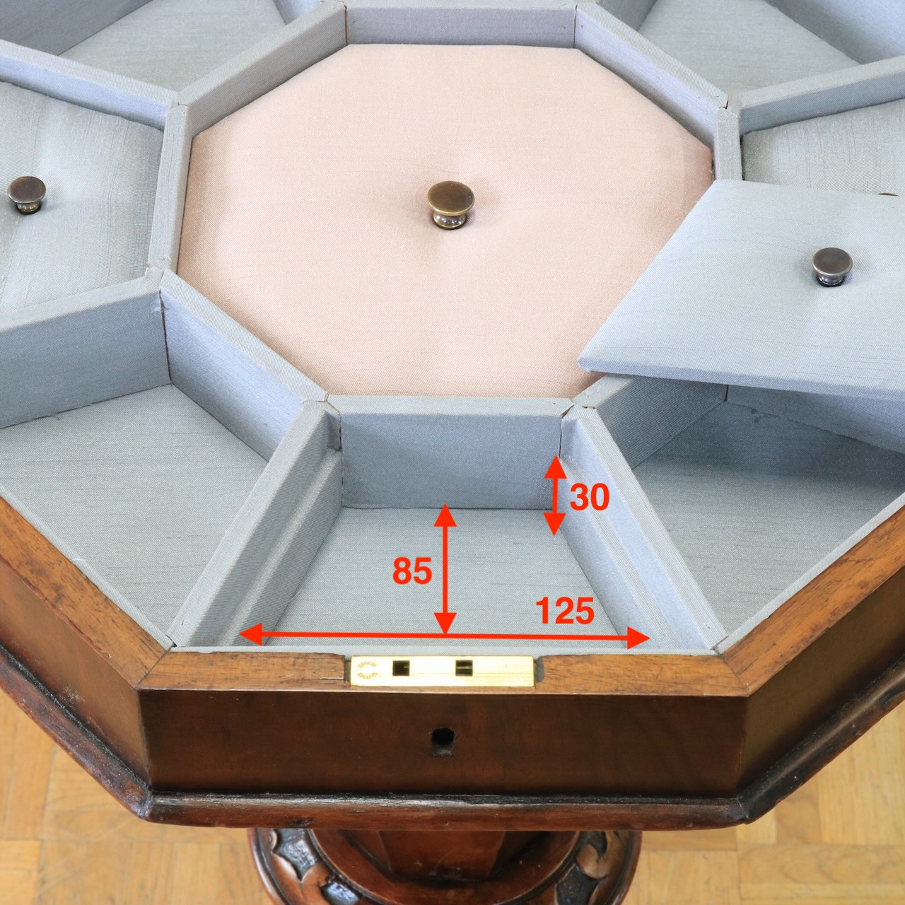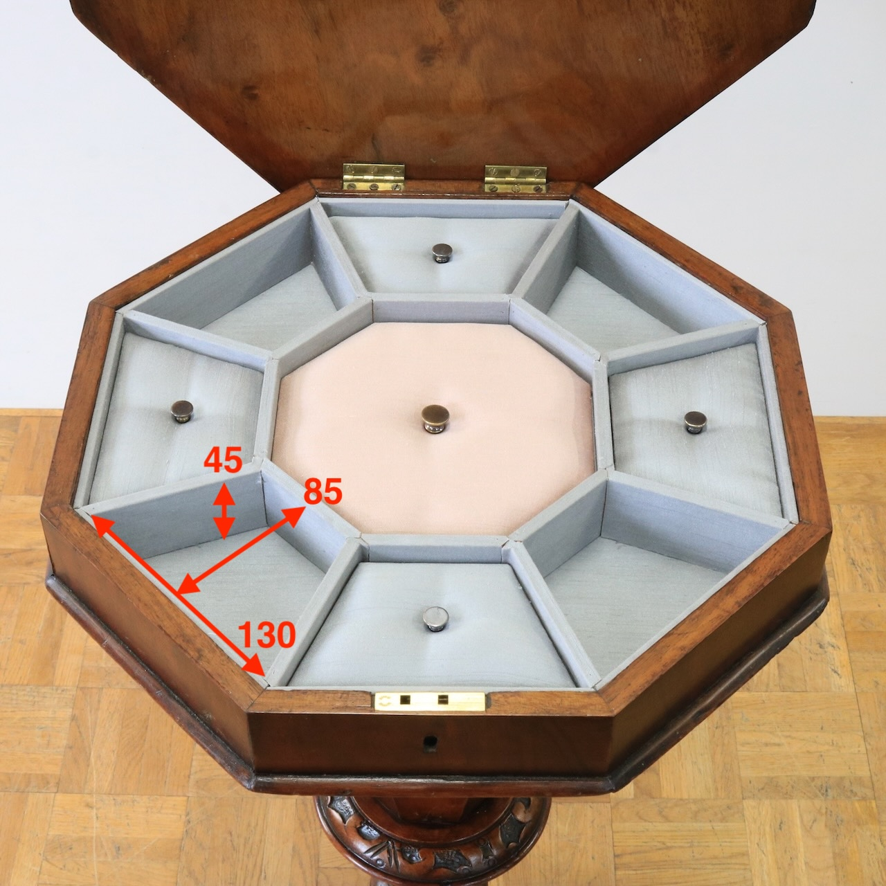 配送料の目安 ▶︎ヴィクトリアンのソーイングボックス。天板にマーケットリーが施された八角形のテーブルですが、天板を開けるとソーイングボックスになっている珍しいアイテムです。
