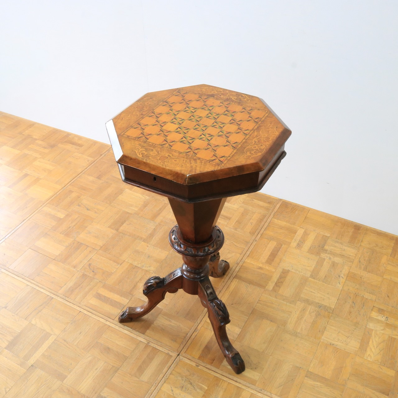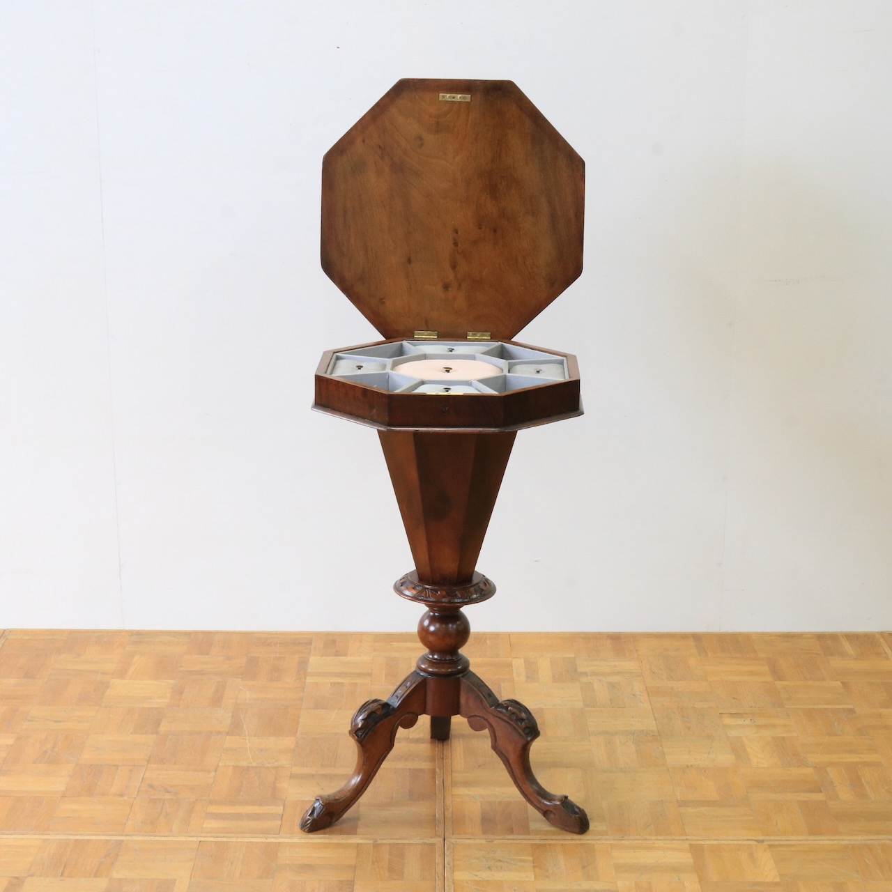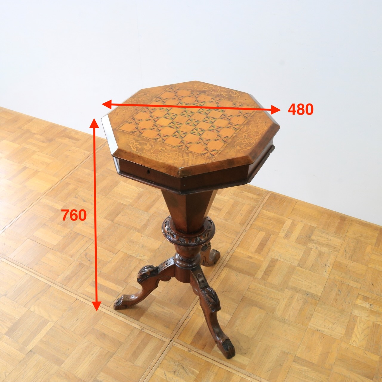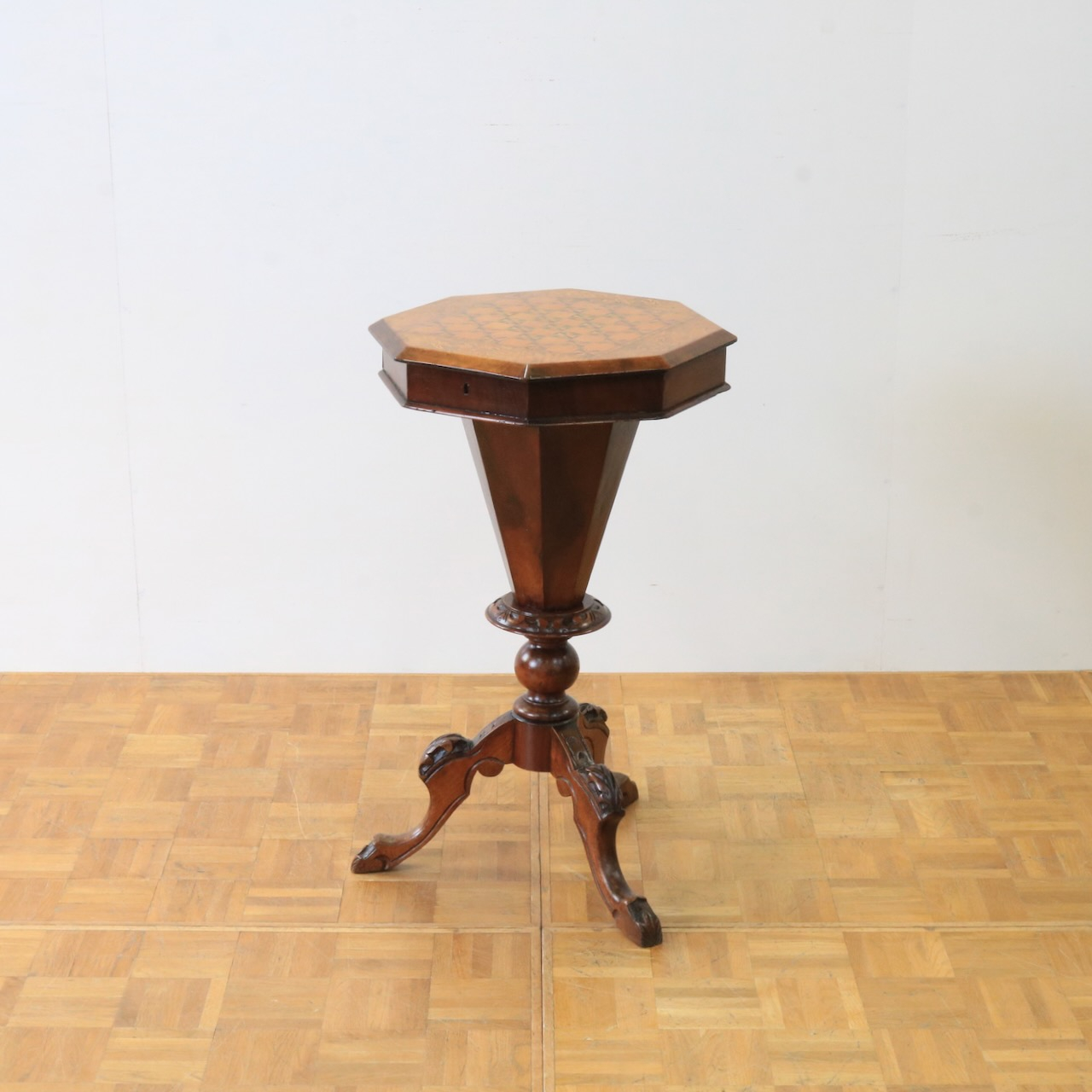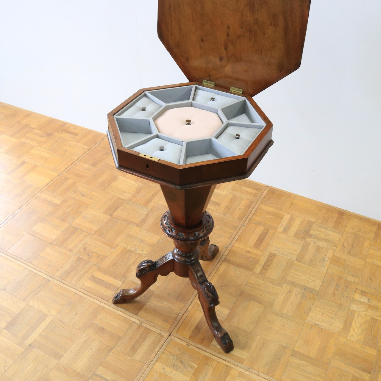配送料の目安 ▶︎ヴィクトリアンのソーイングボックス。天板にマーケットリーが施された八角形のテーブルですが、天板を開けるとソーイングボックスになっている珍しいアイテムです。