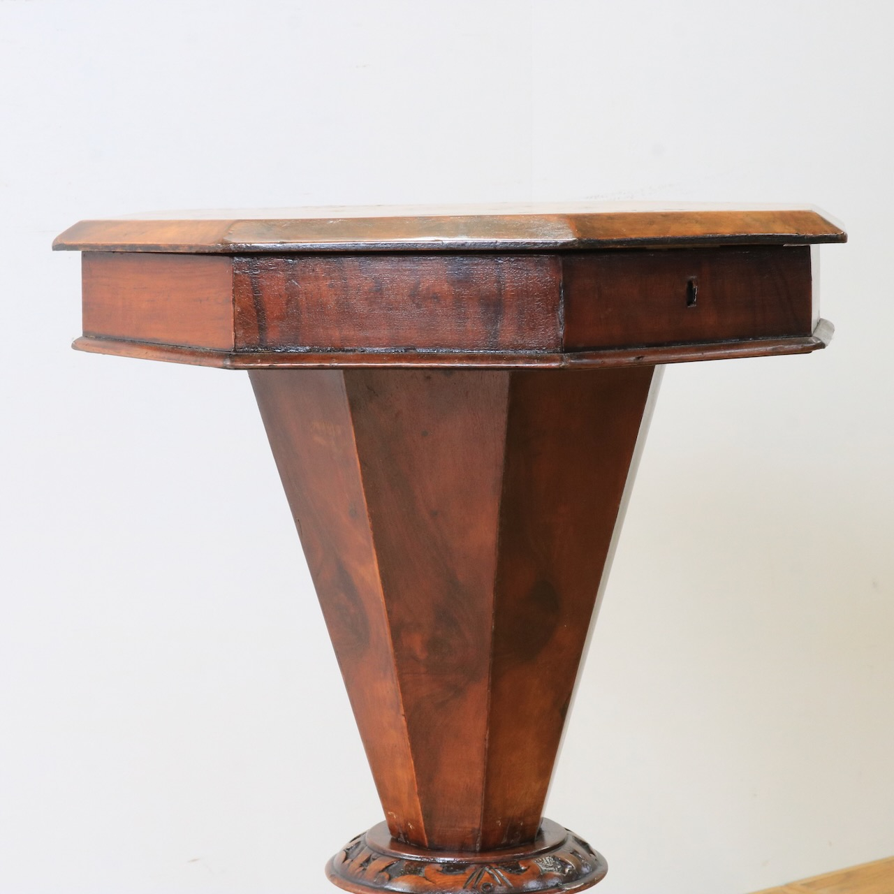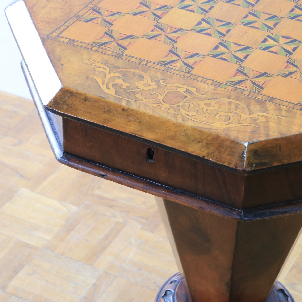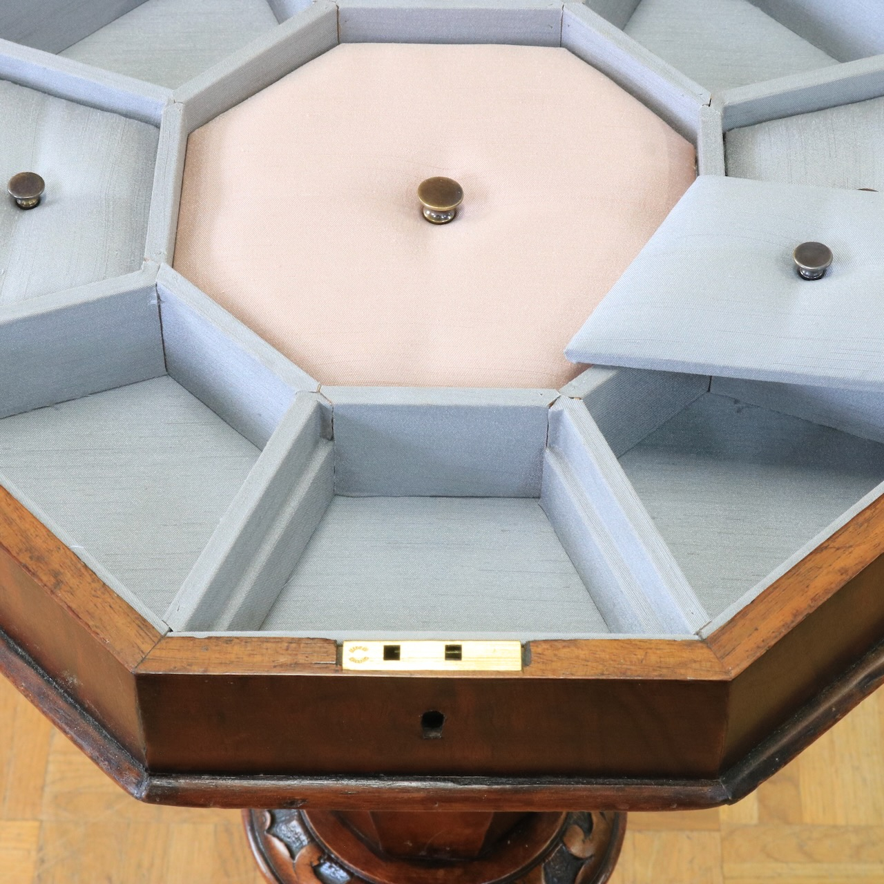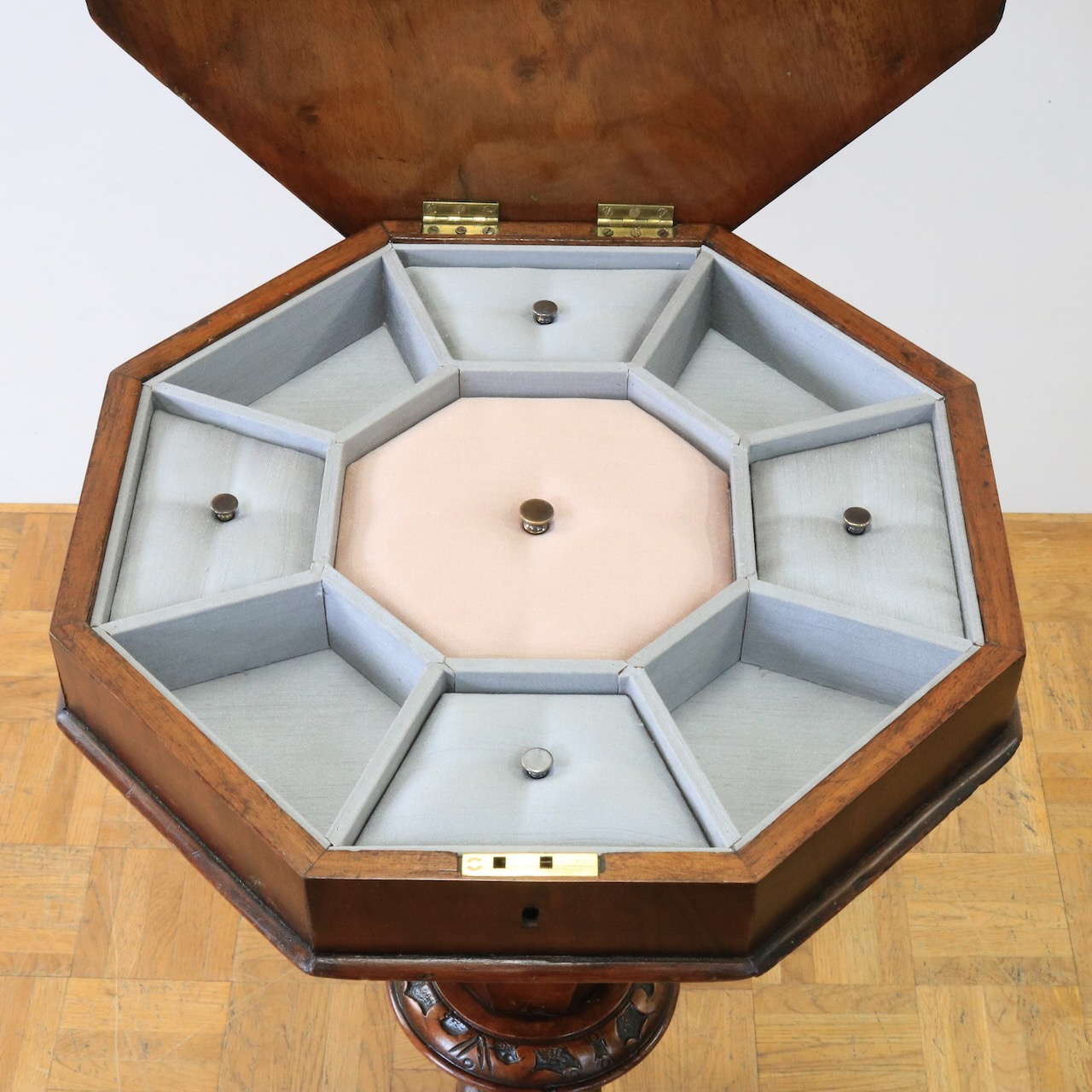 配送料の目安 ▶︎ヴィクトリアンのソーイングボックス。天板にマーケットリーが施された八角形のテーブルですが、天板を開けるとソーイングボックスになっている珍しいアイテムです。