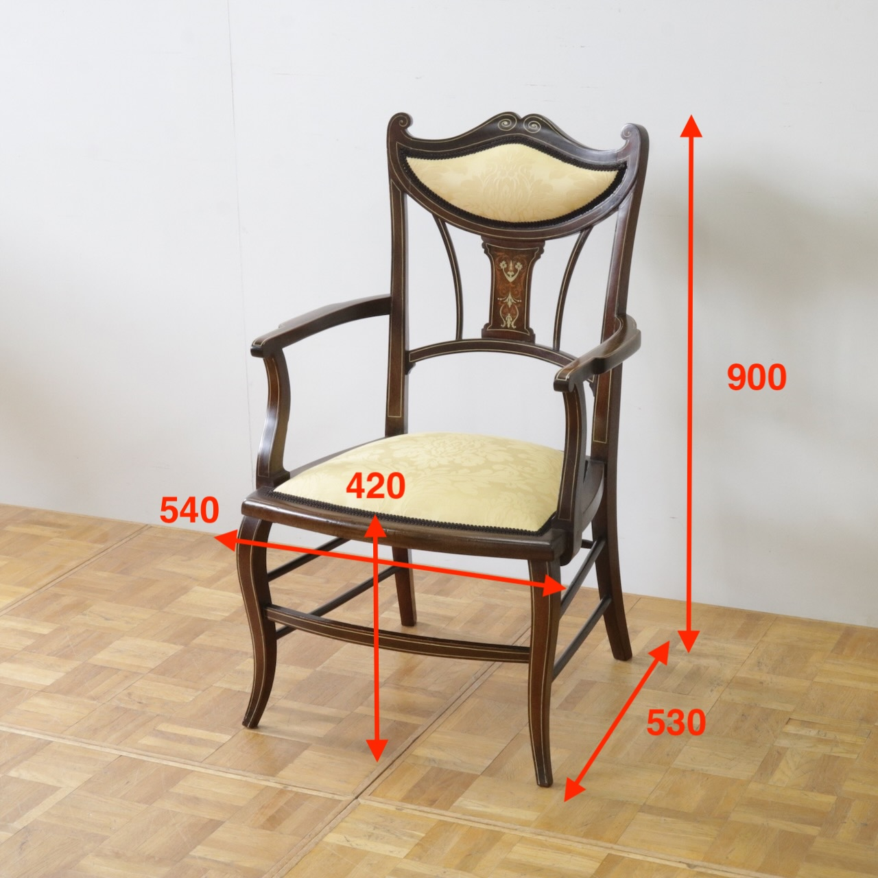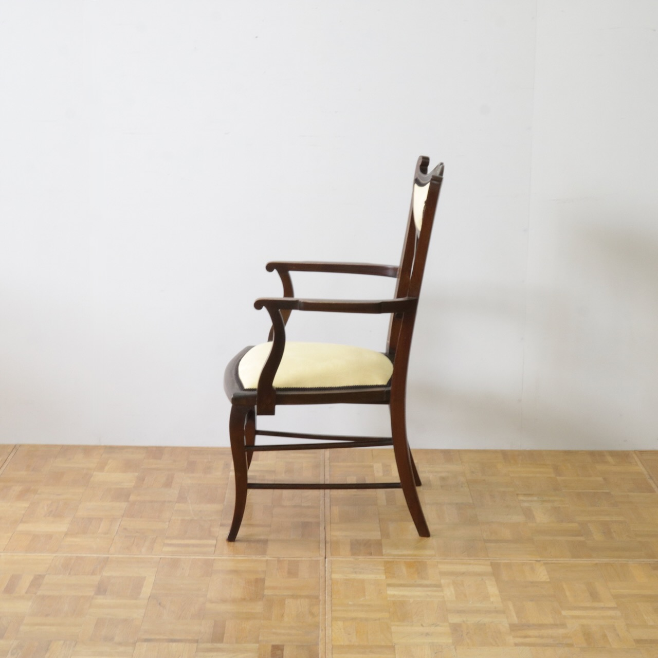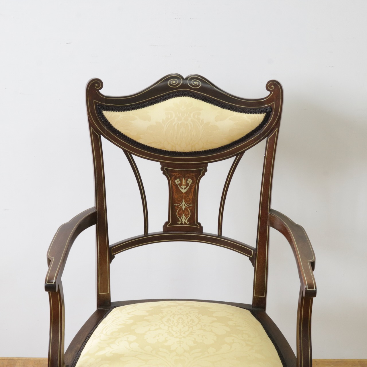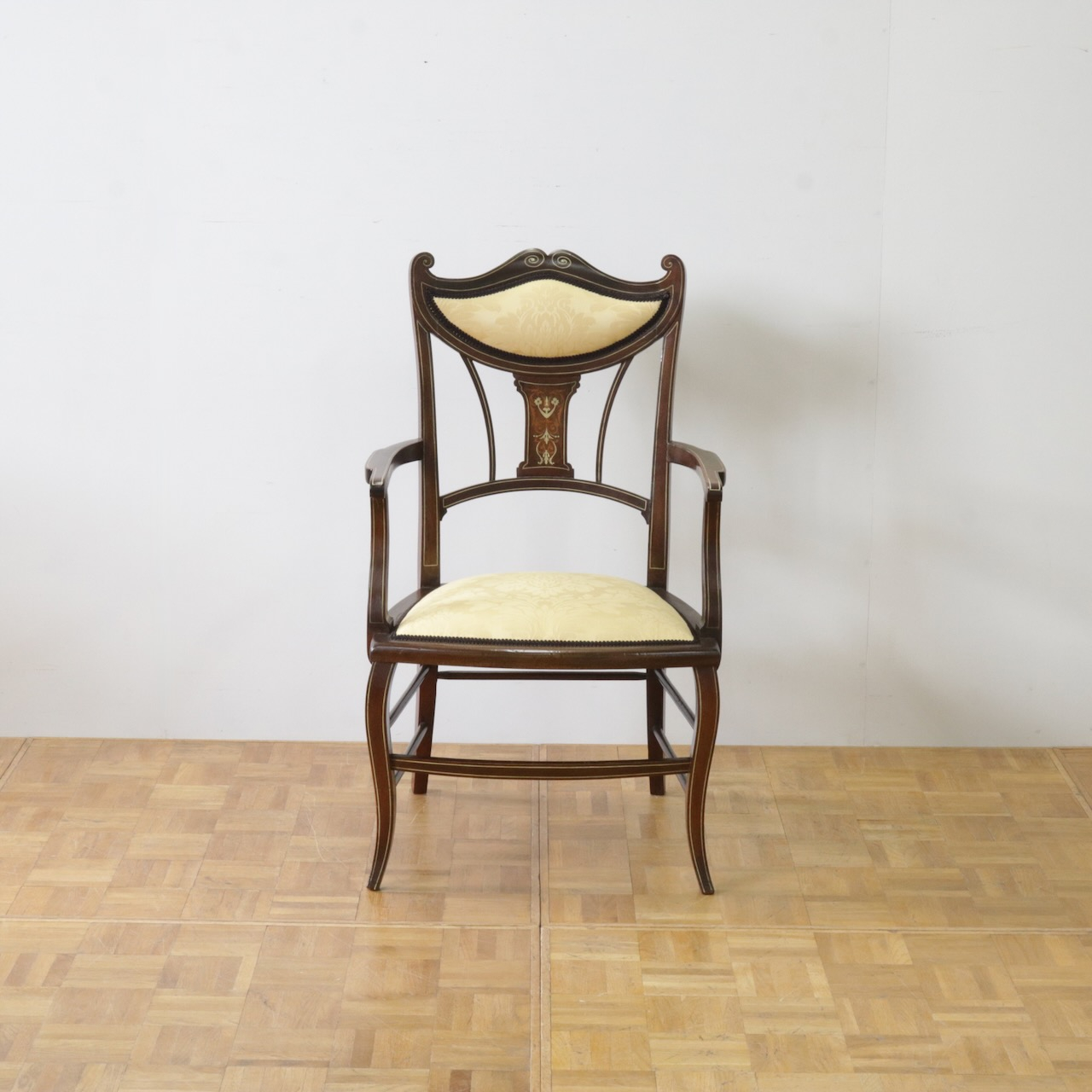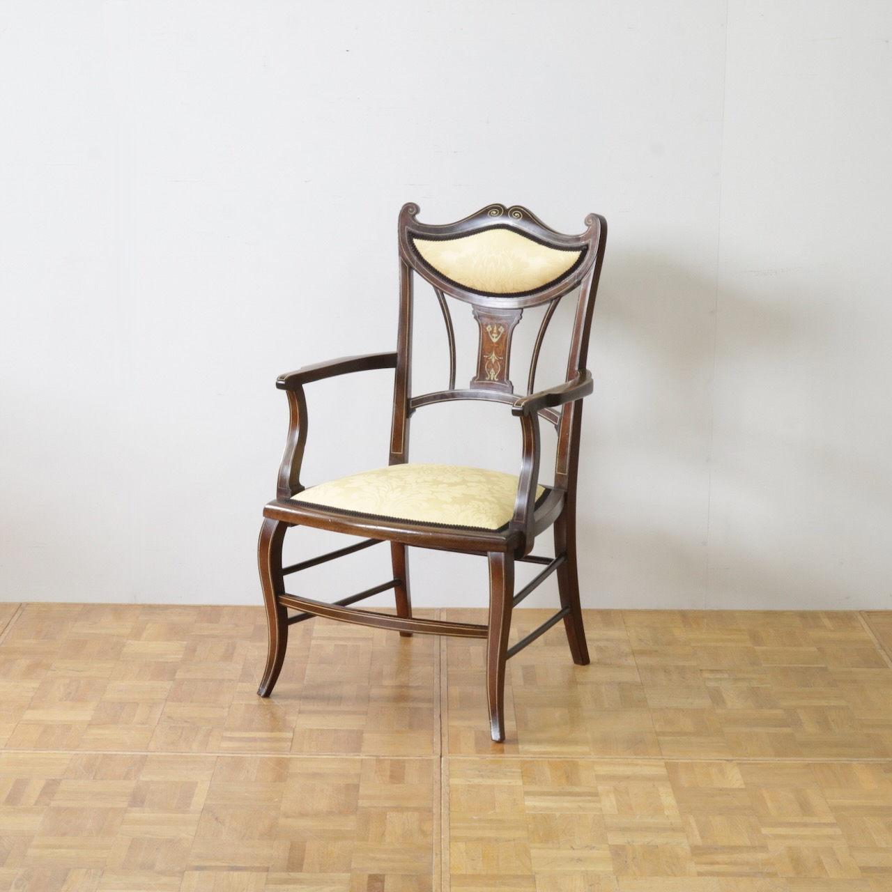 1910年代、マホガニー材のアームチェアー。繊細なフォルムと背に入ったインレイ(象嵌細工)が美しいデザインのアームチェアーです。