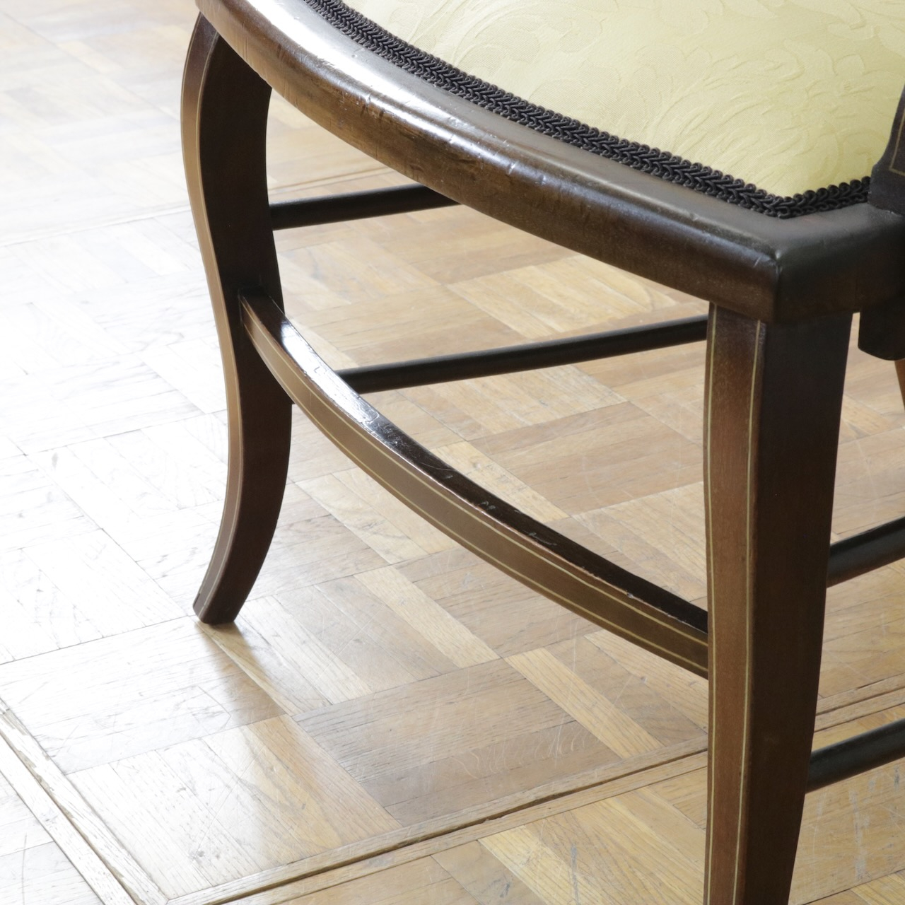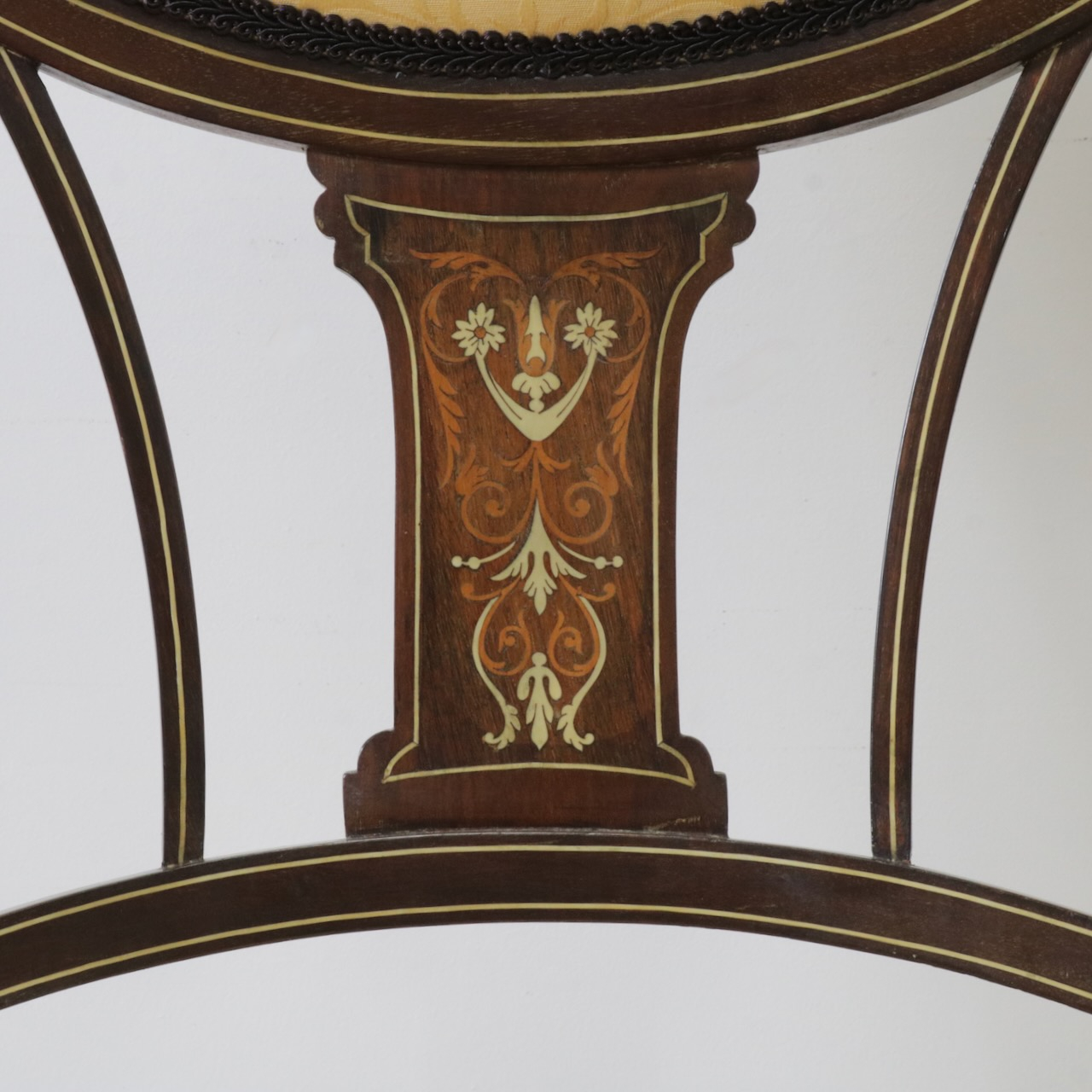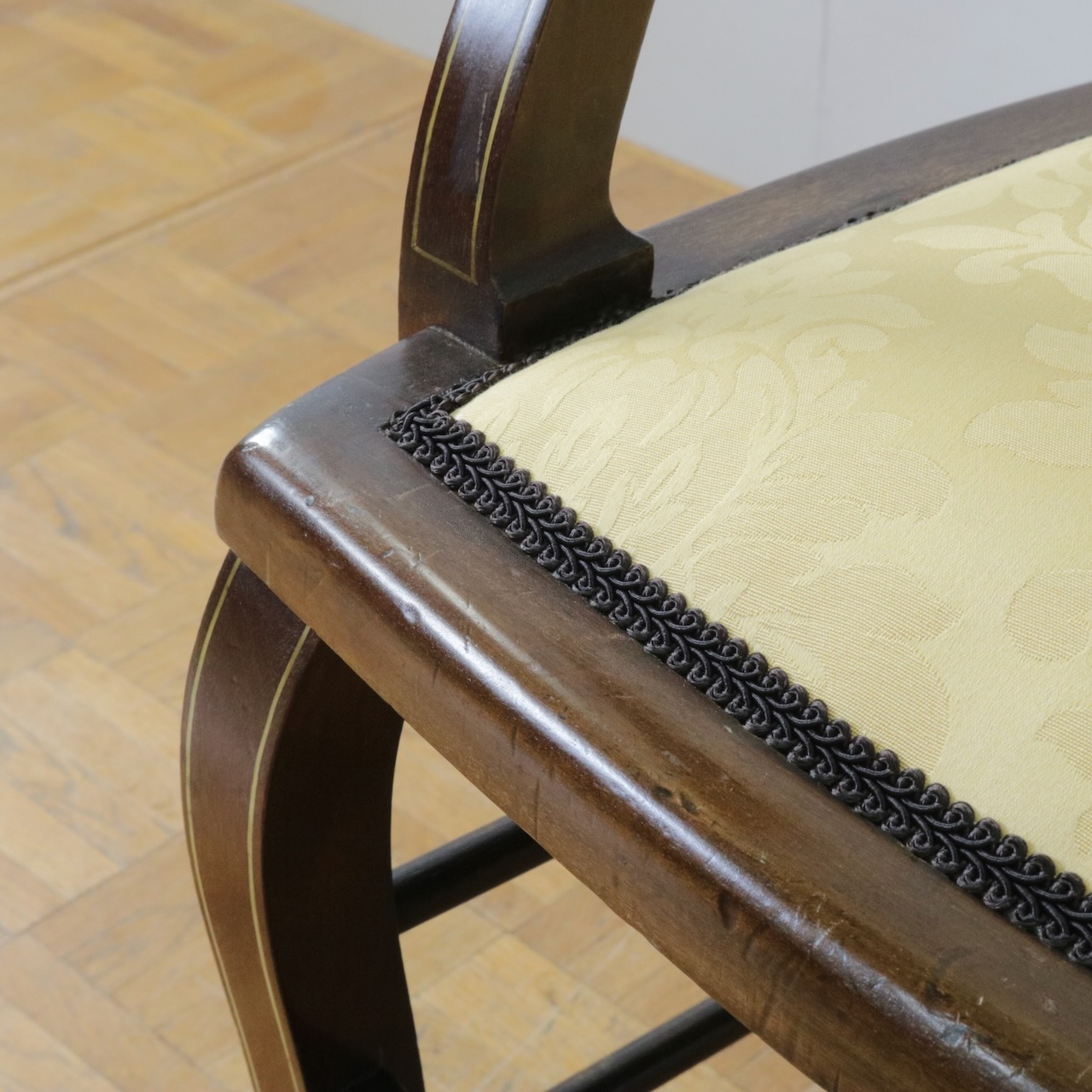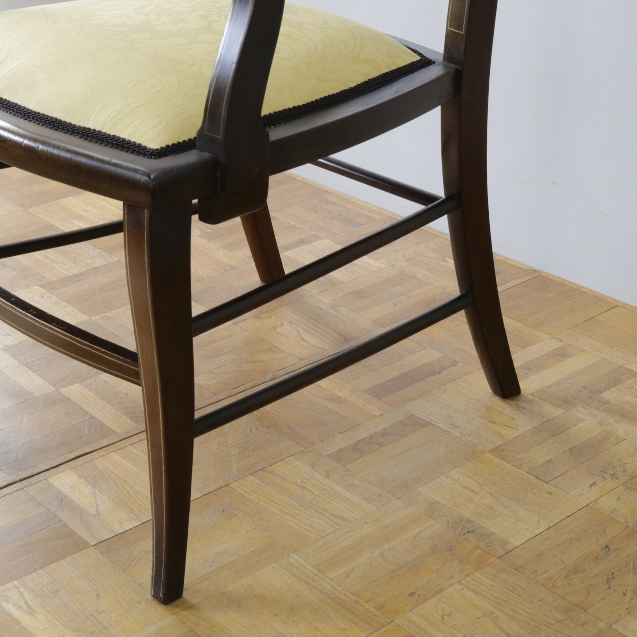 見事なインレイ細工が施されたアームチェアー。背板は勿論、アームの先端や脚先に至るまで綺麗に施されています。黄色い生地と相まって、お部屋を華やかに彩ってくれる一脚です。