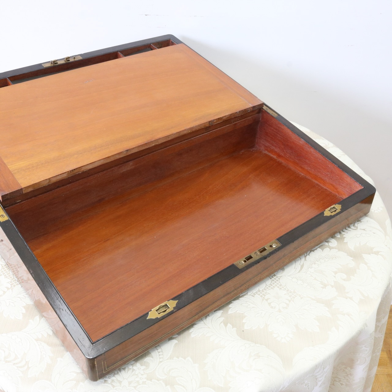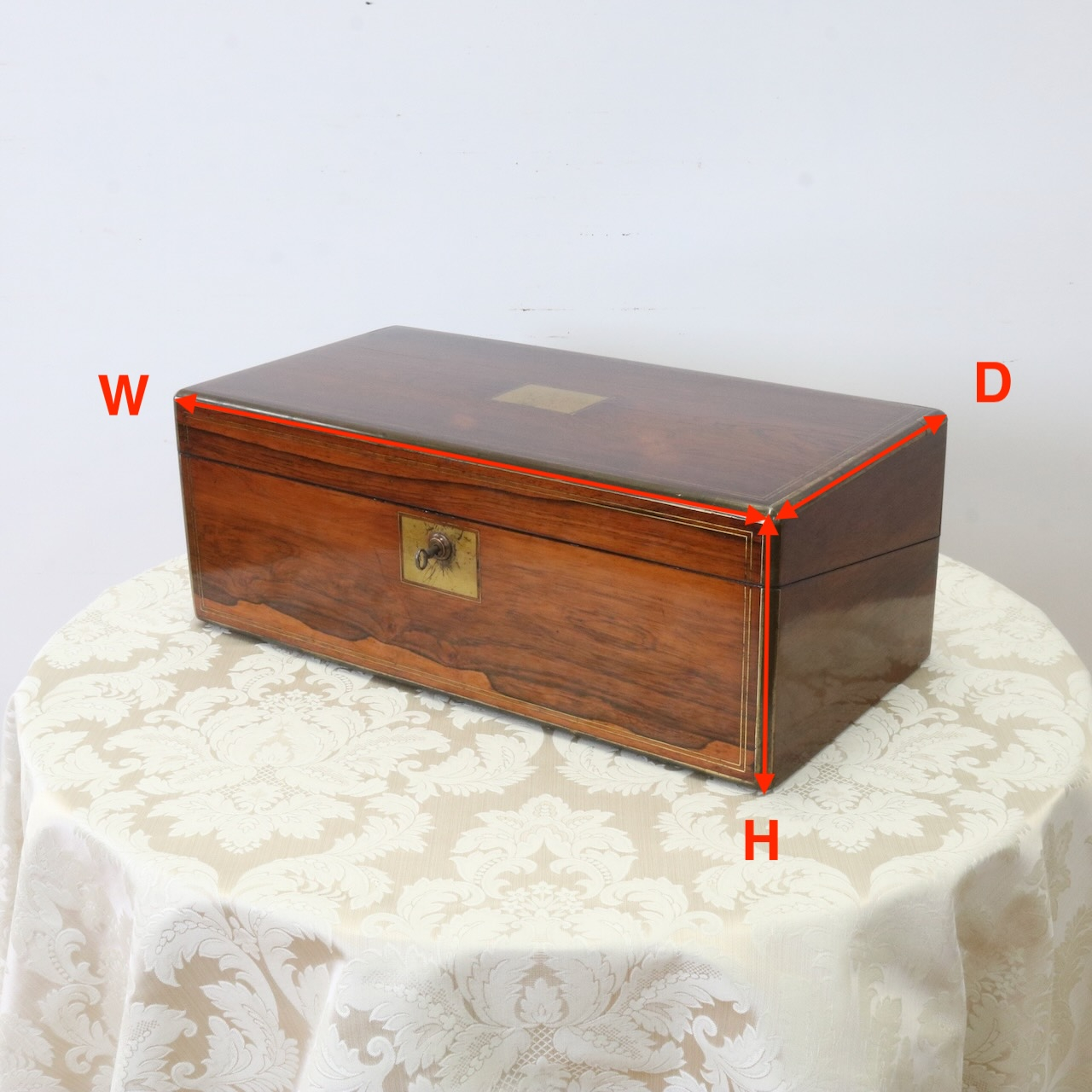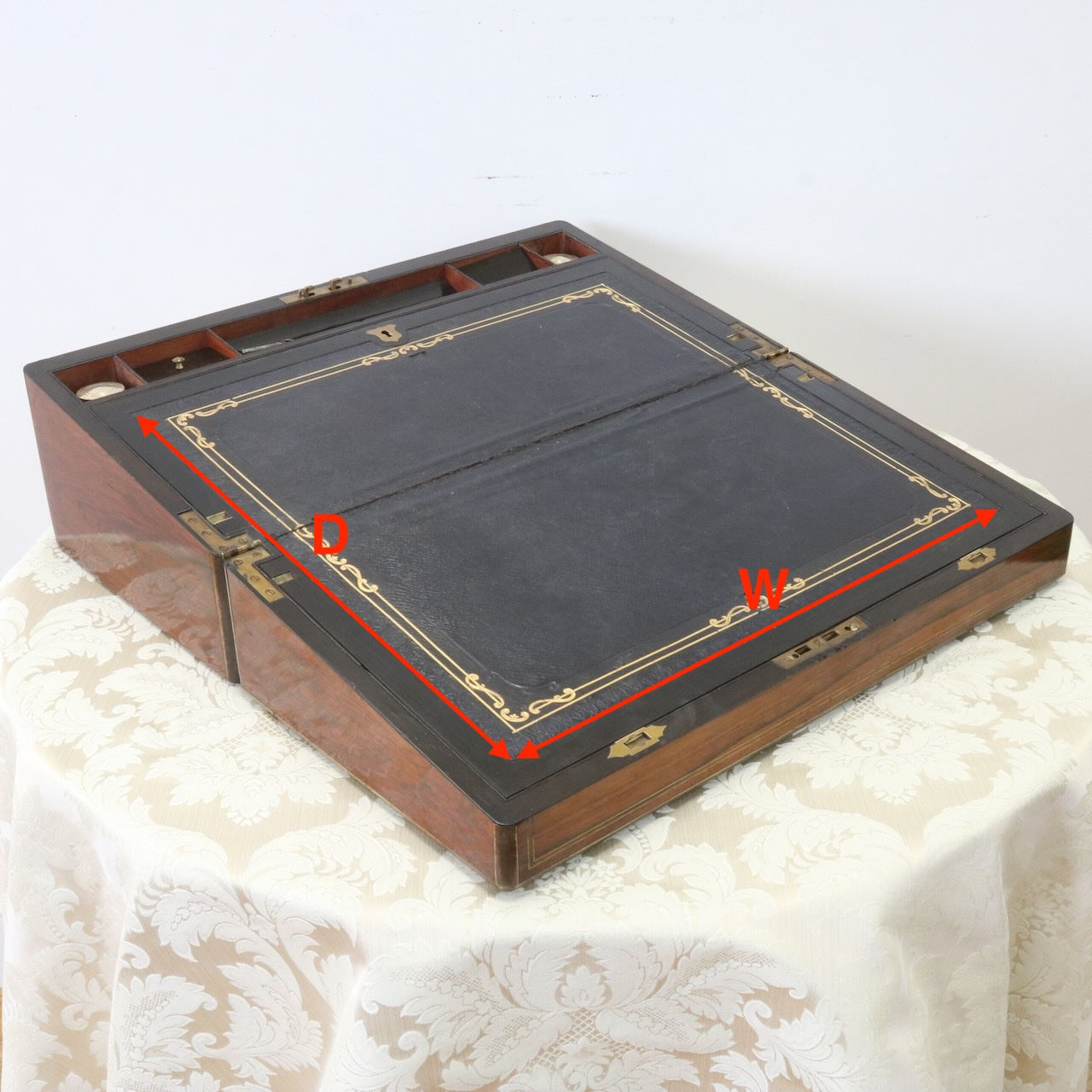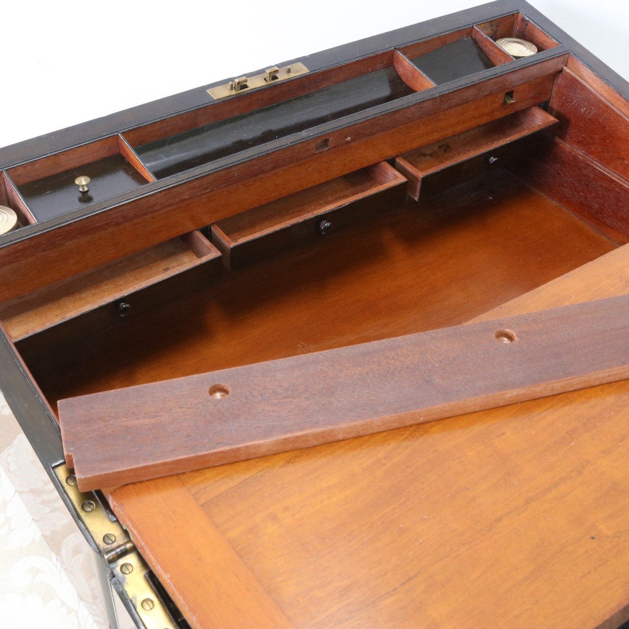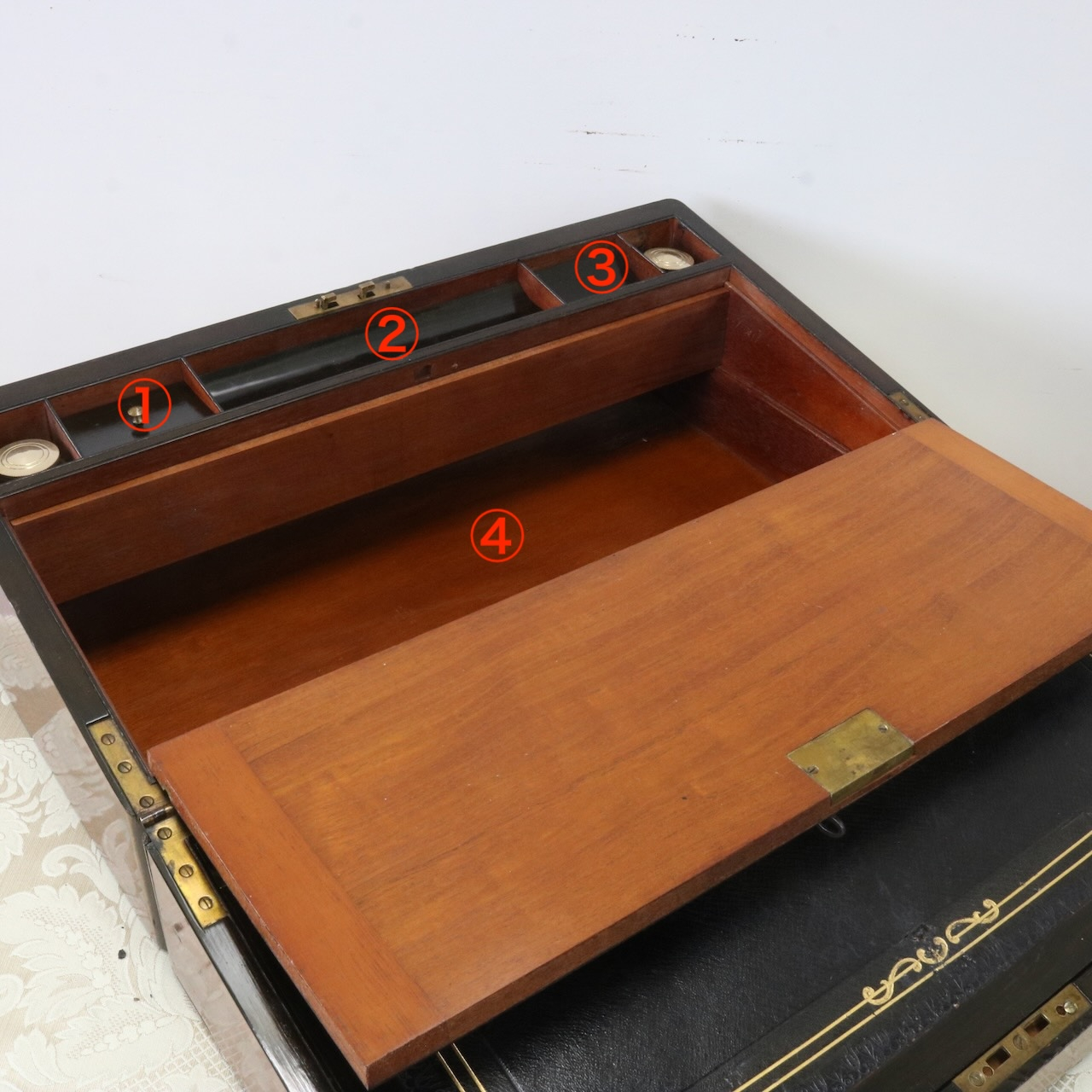 ガラスのインクボトルが2個、ペントレイと小さな収納スペース付き。