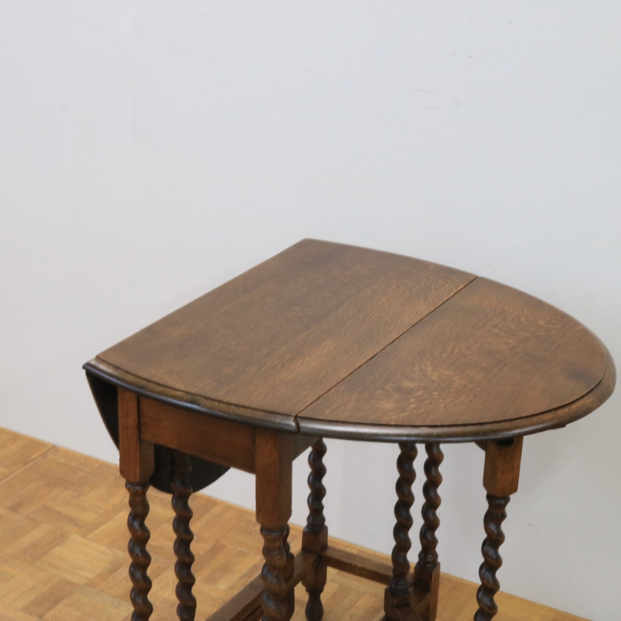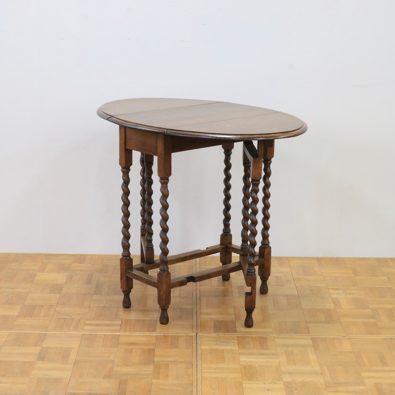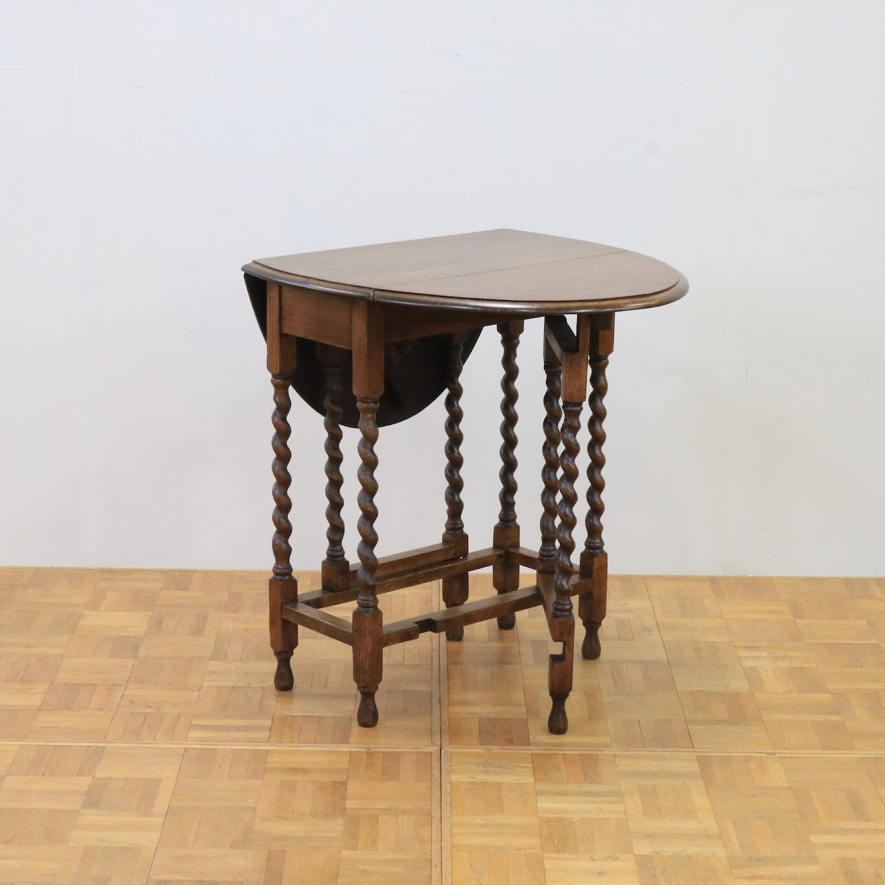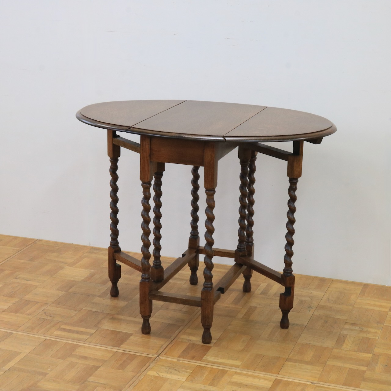ゲートレッグテーブルの由来にもなったゲートのように開閉する脚。八本の脚を用いて天板の可変を可能にしています。バーリーシュガーツイストは習得難易度の高い技法の一つ。それを全ての脚に施している当時の職人の技術の高さが窺えるアンティークテーブルです。