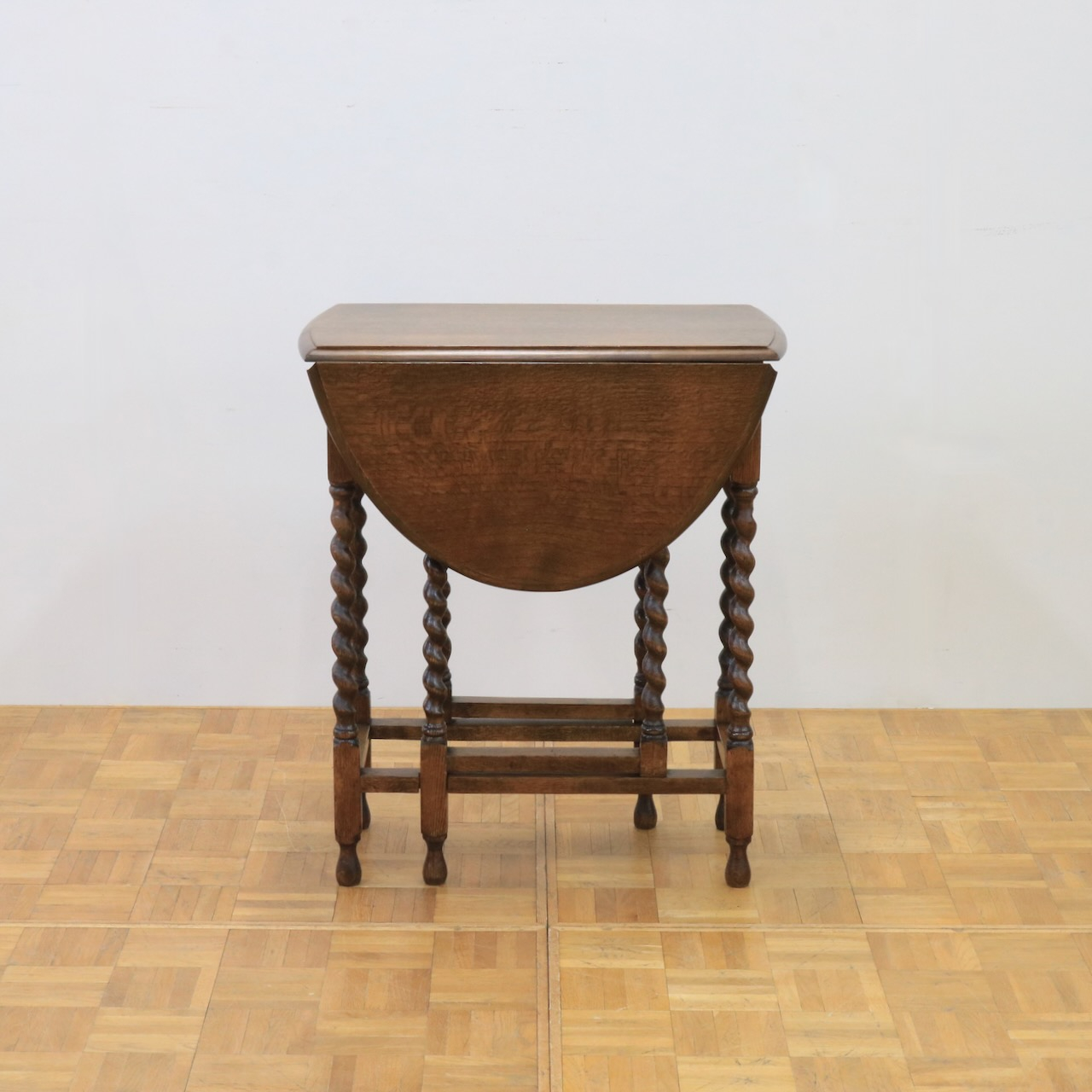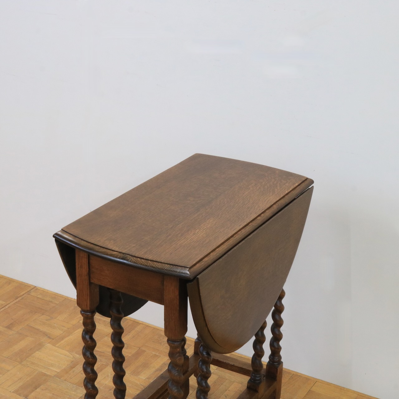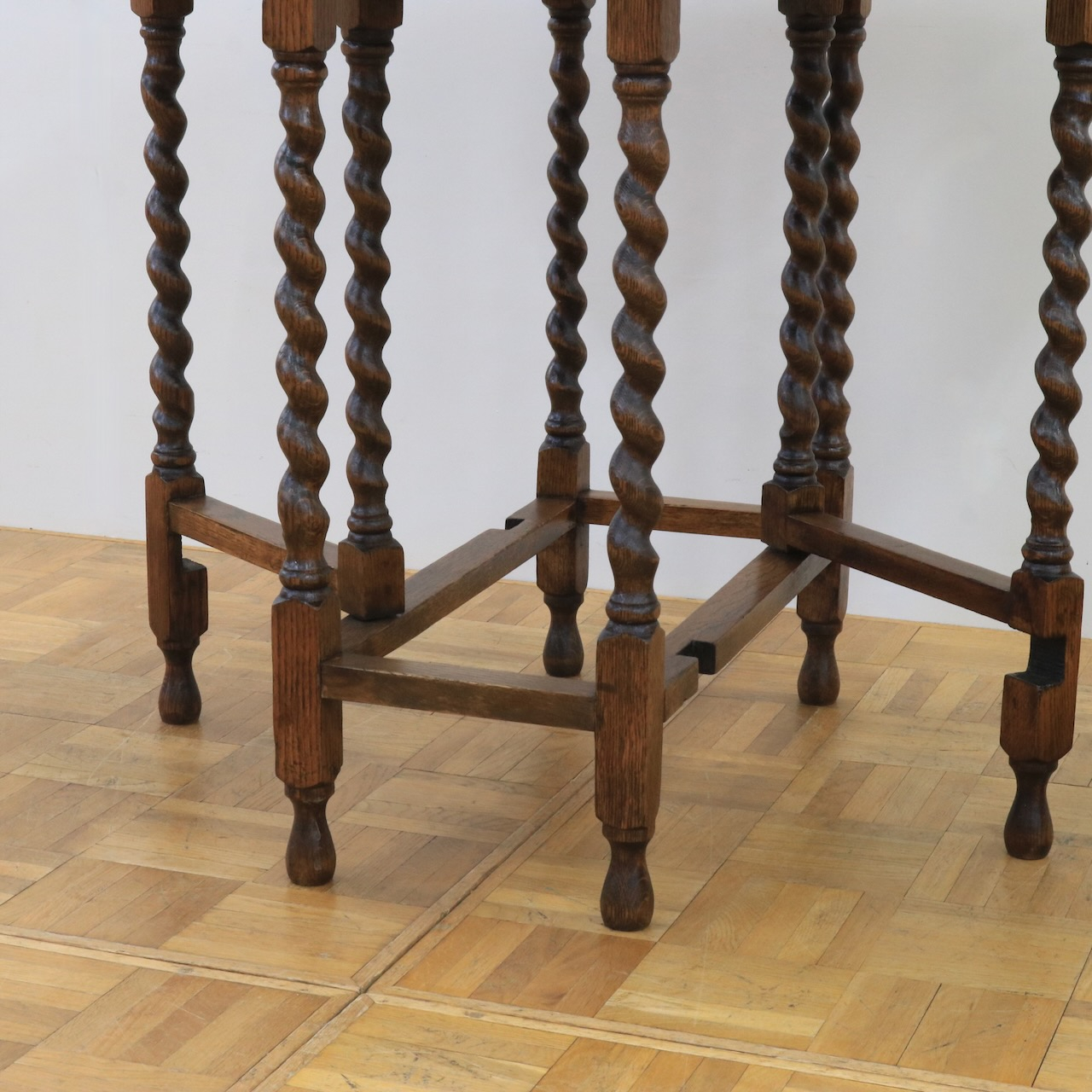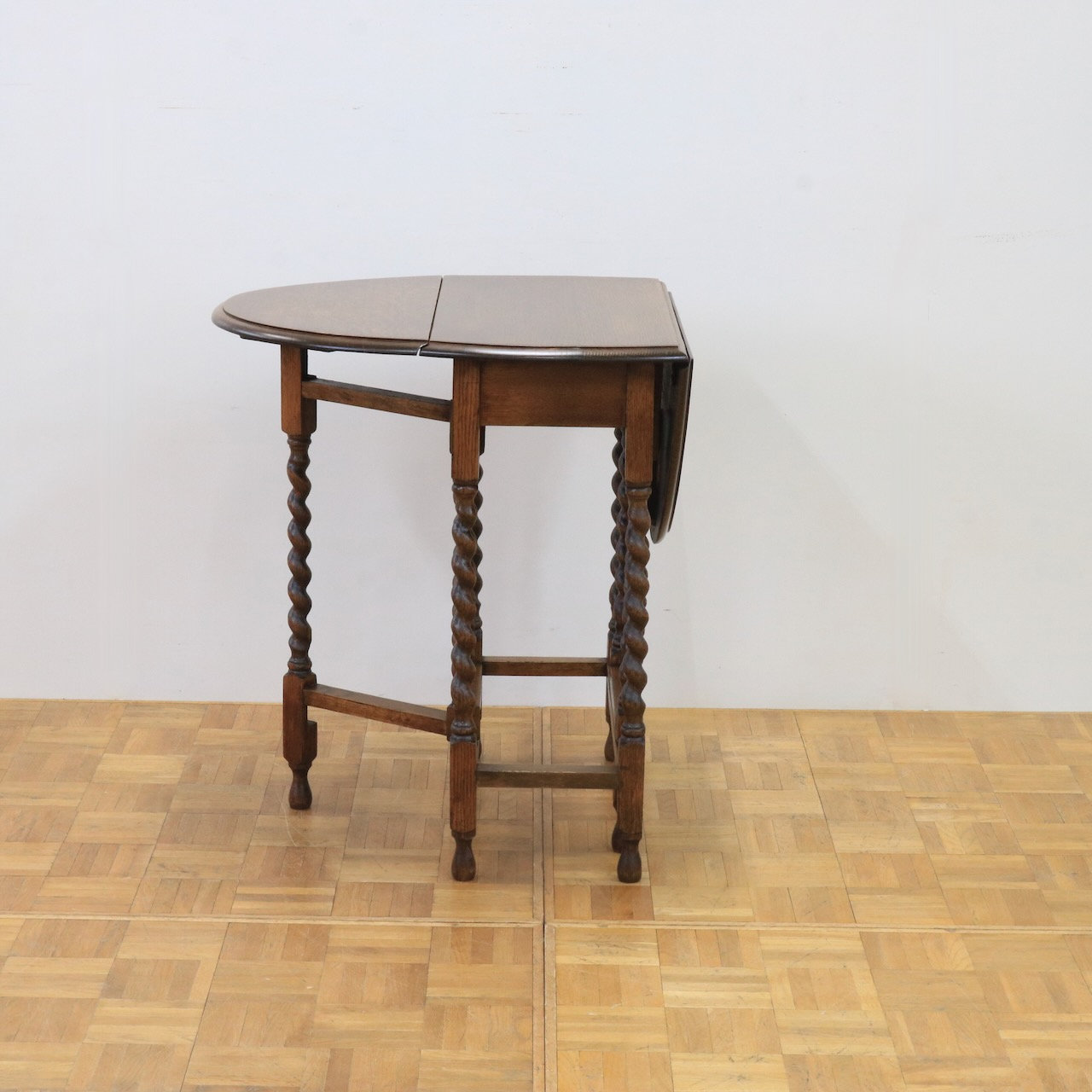 ゲートレッグテーブルの由来にもなったゲートのように開閉する脚。八本の脚を用いて天板の可変を可能にしています。バーリーシュガーツイストは習得難易度の高い技法の一つ。それを全ての脚に施している当時の職人の技術の高さが窺えるアンティークテーブルです。