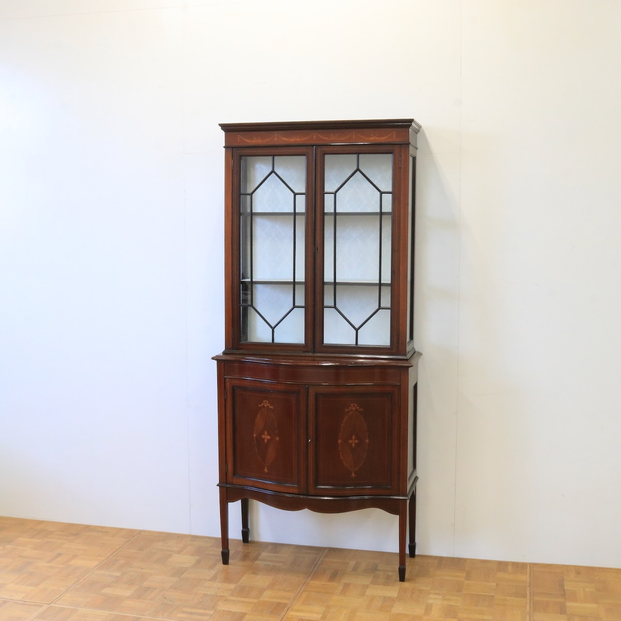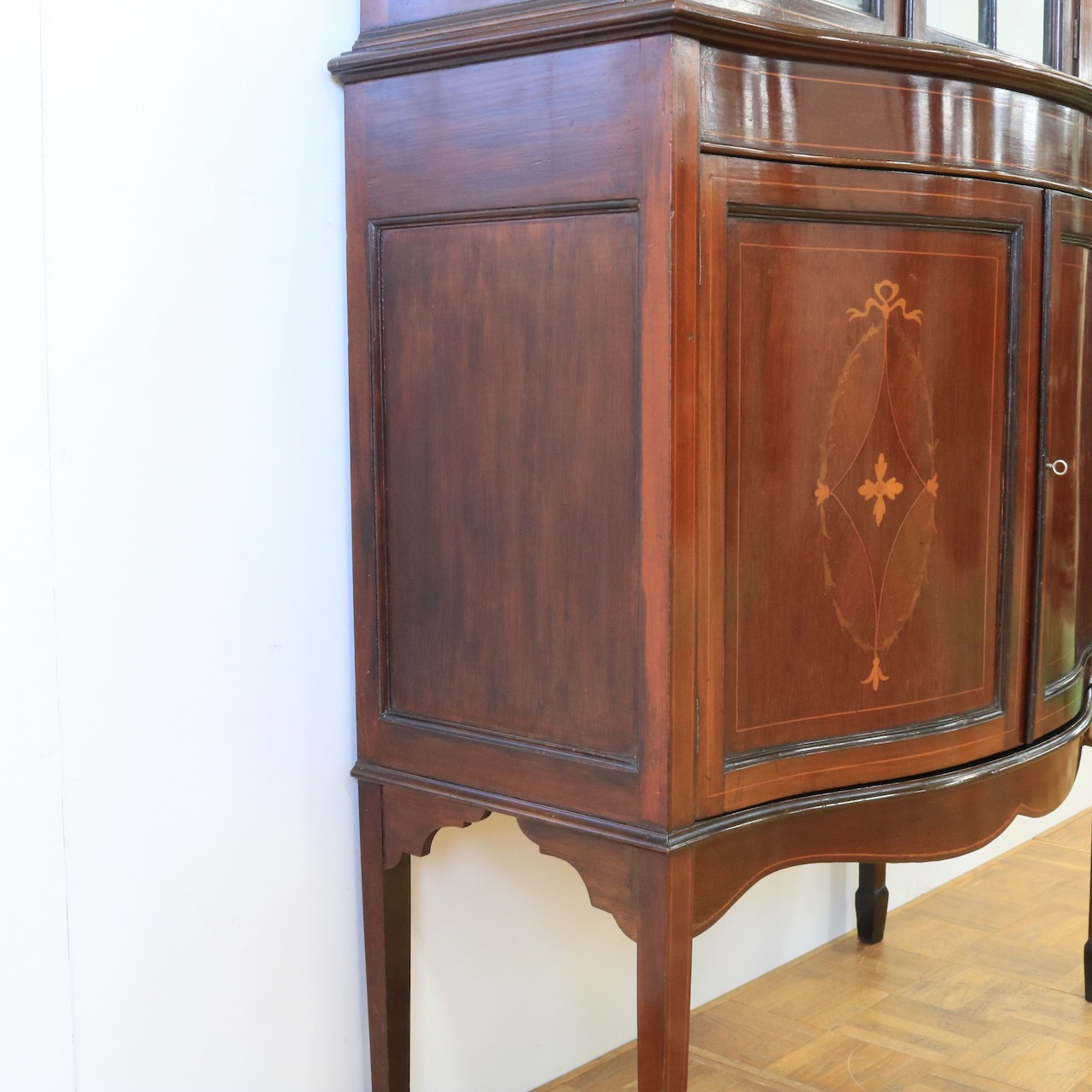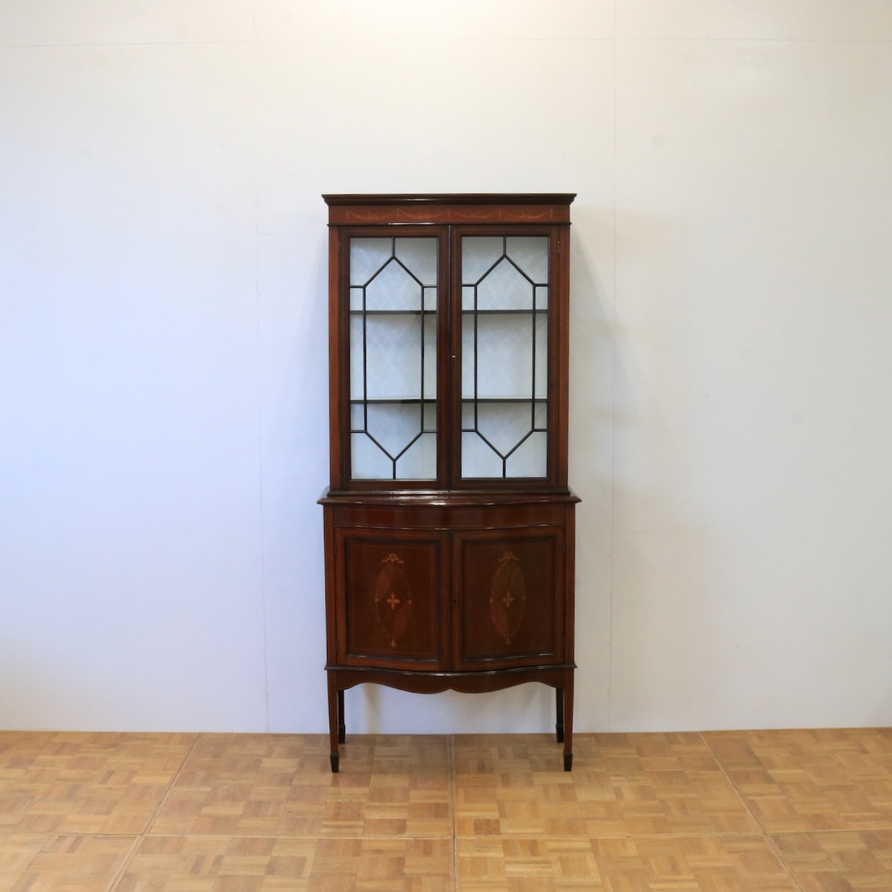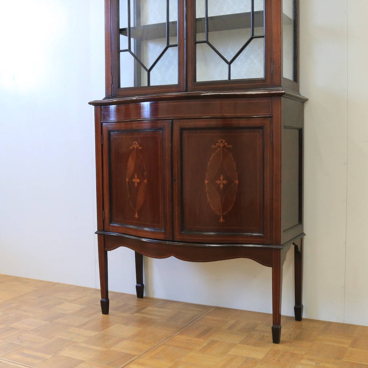 1910年代、マホガニー材のグラスキャビネット。マホガニーらしい赤みがかった上品な木の色合いに、明るい色の材を用いたインレイが美しく映えるデザイン。下段が弓形にカーブしたデザインな点もエレガントな趣を感じさせます。