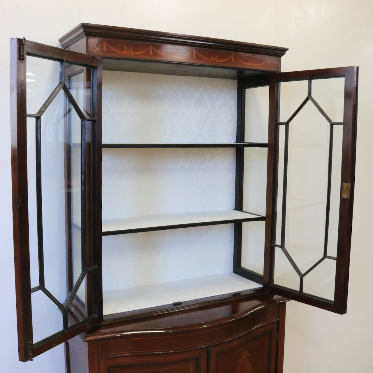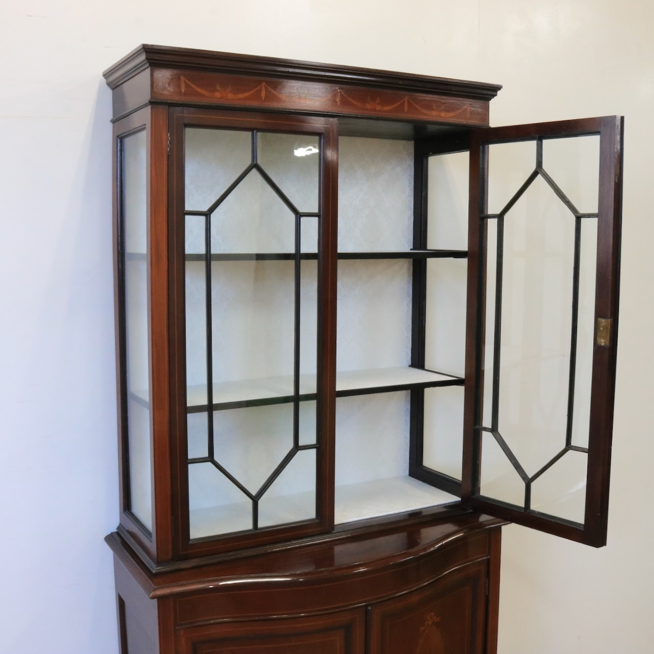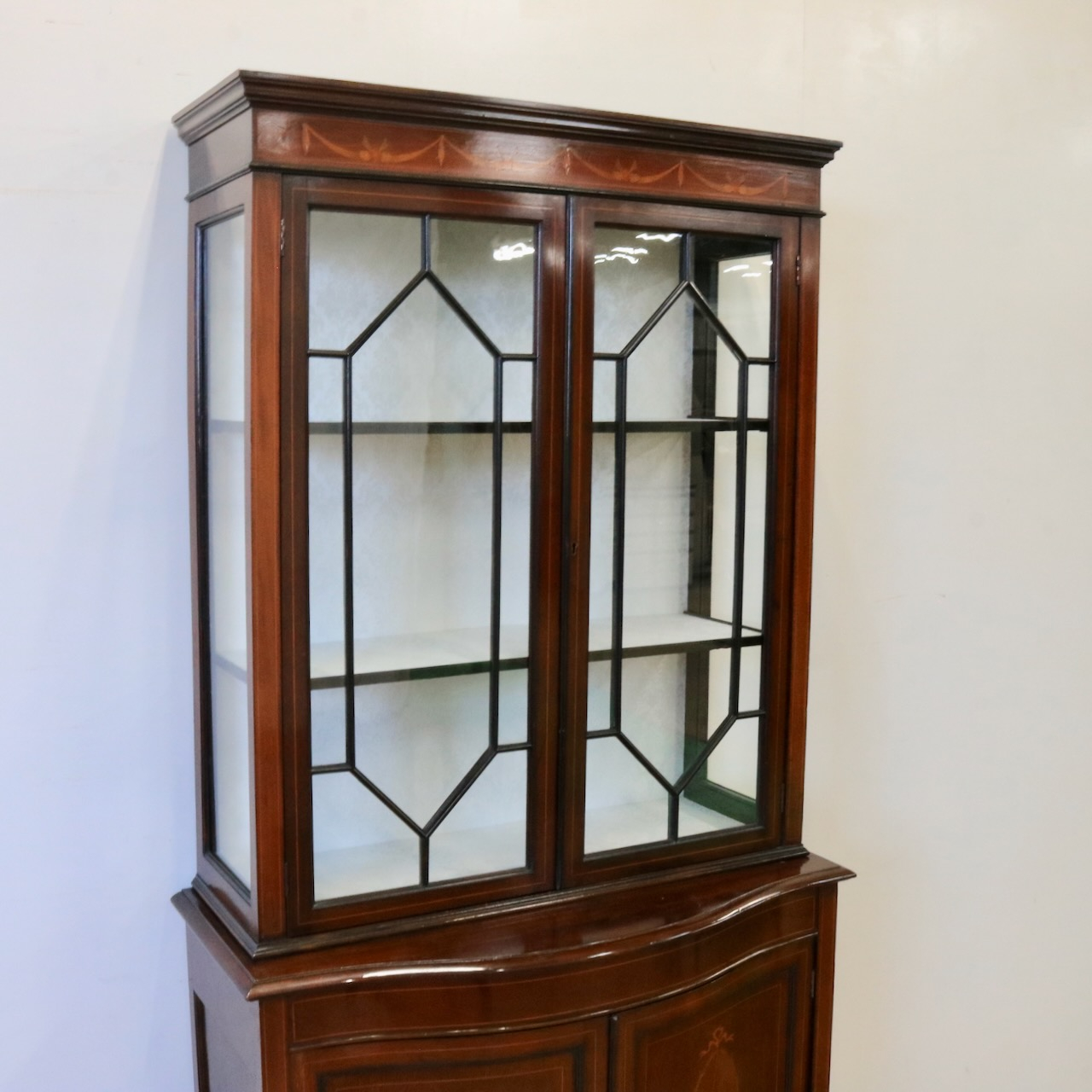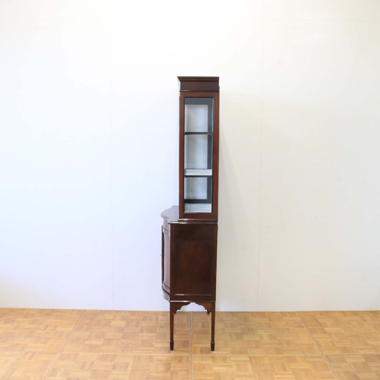 1910年代、マホガニー材のグラスキャビネット。マホガニーらしい赤みがかった上品な木の色合いに、明るい色の材を用いたインレイが美しく映えるデザイン。下段が弓形にカーブしたデザインな点もエレガントな趣を感じさせます。