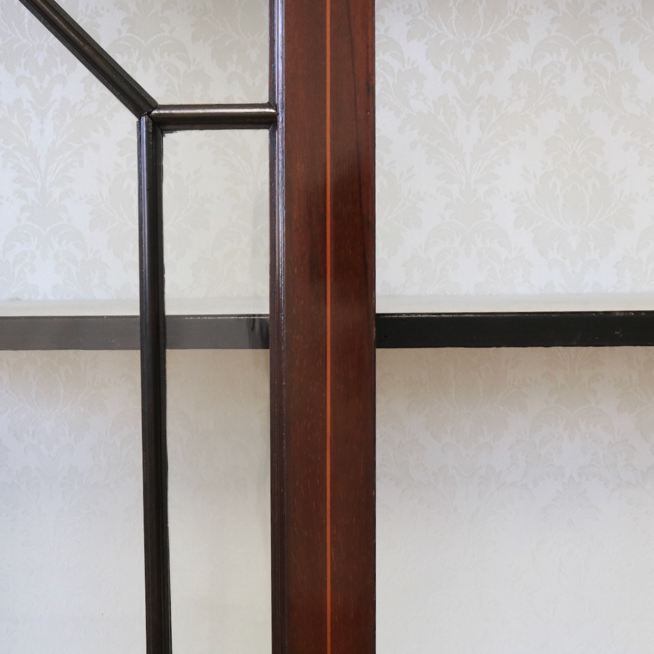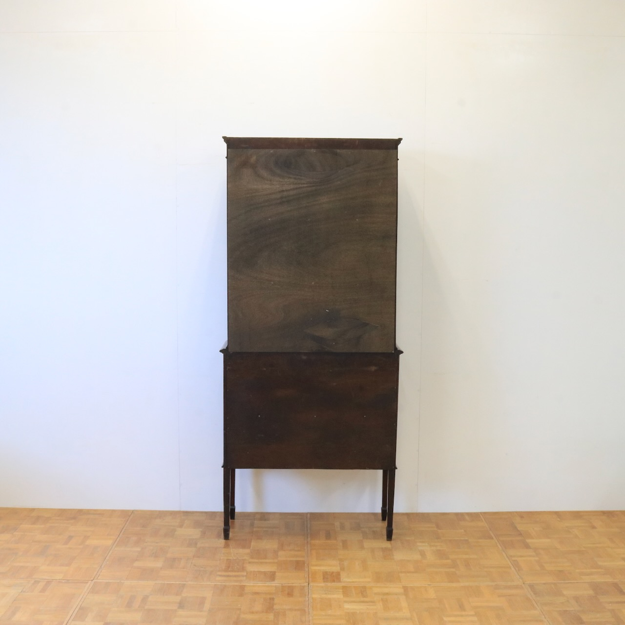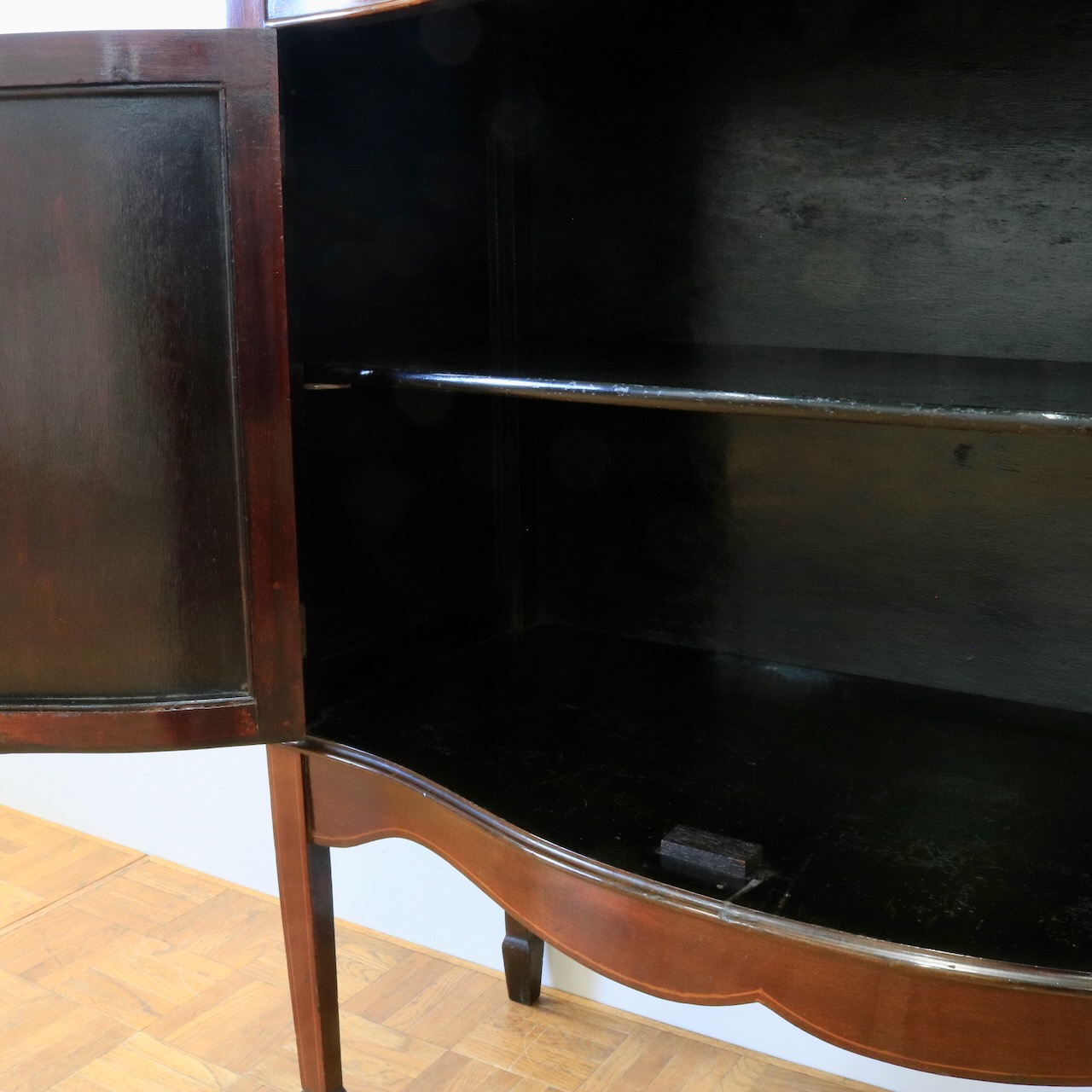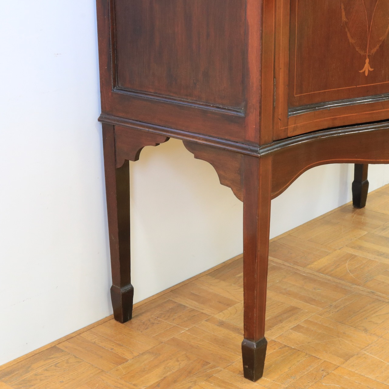 1910年代、マホガニー材のグラスキャビネット。マホガニーらしい赤みがかった上品な木の色合いに、明るい色の材を用いたインレイが美しく映えるデザイン。下段が弓形にカーブしたデザインな点もエレガントな趣を感じさせます。
