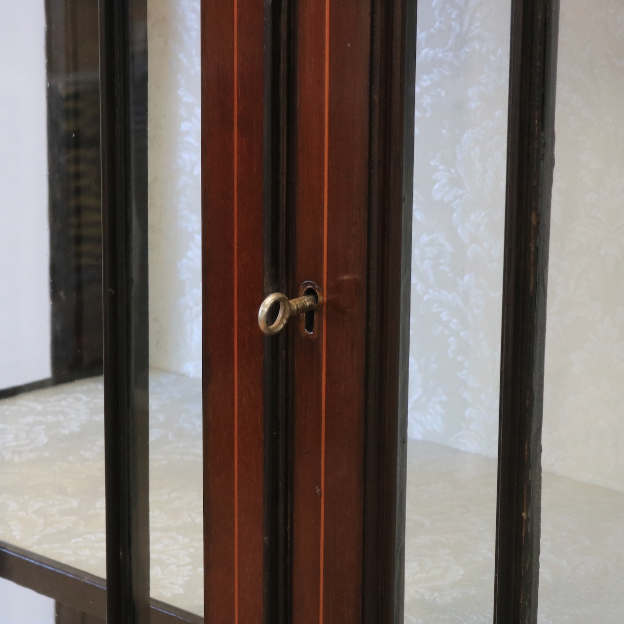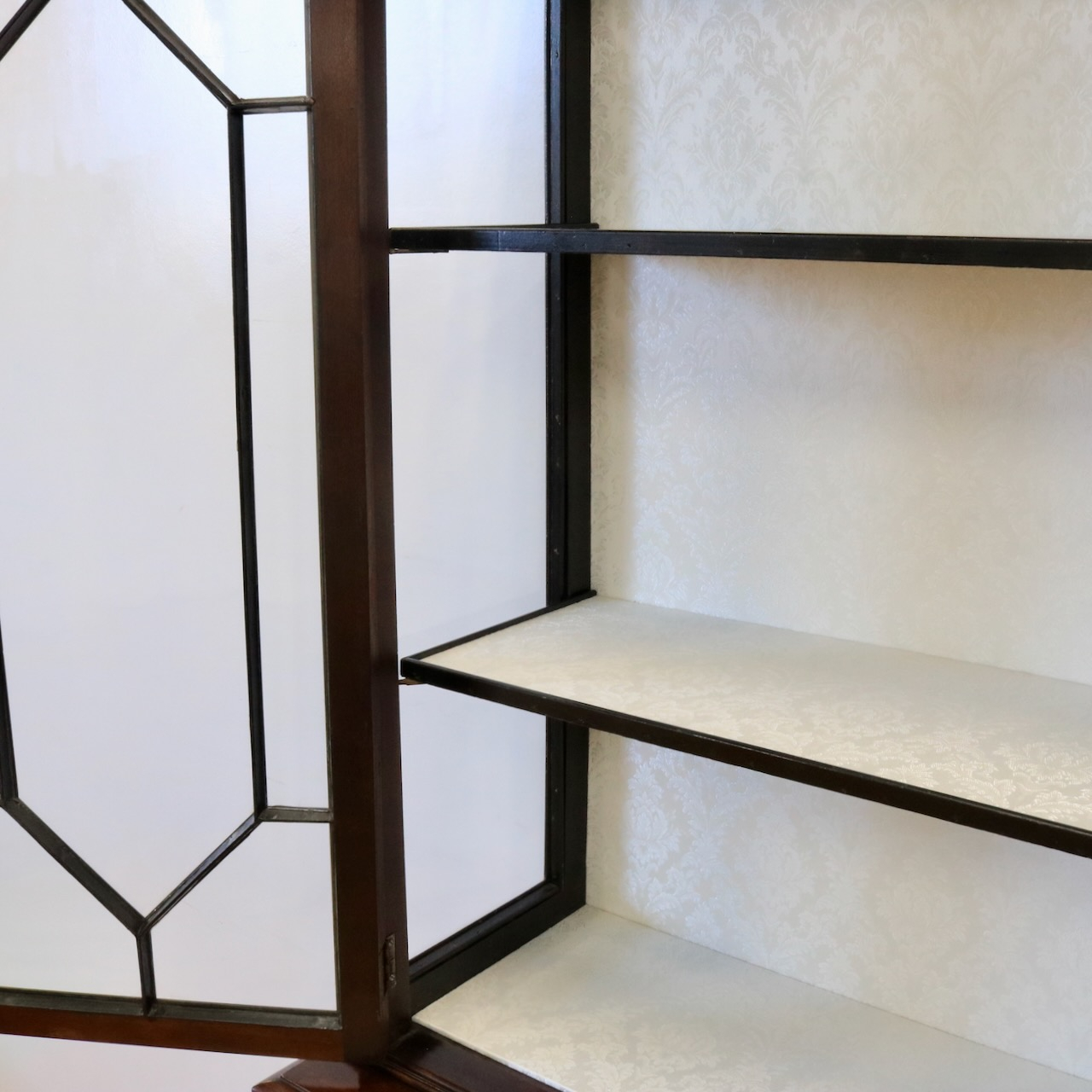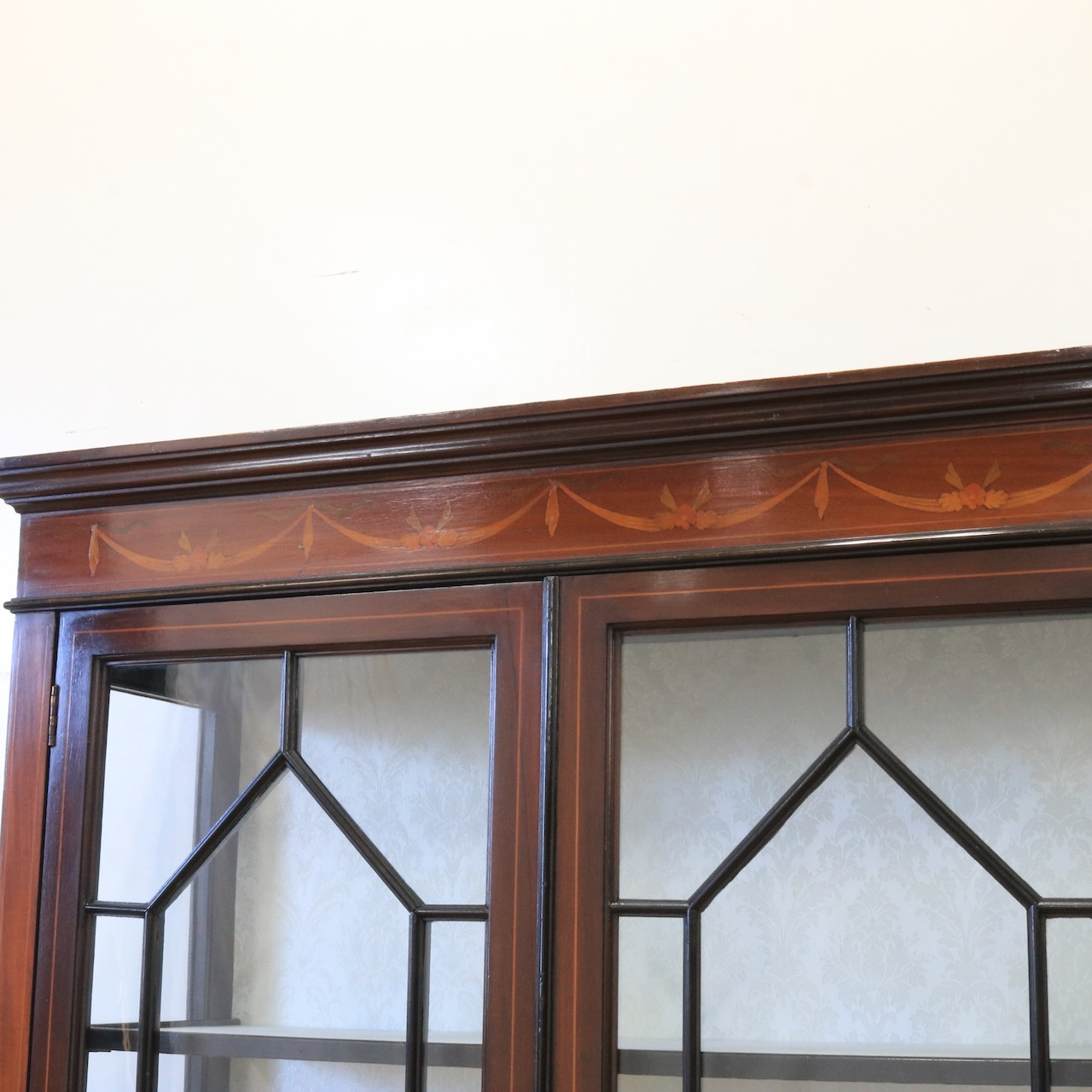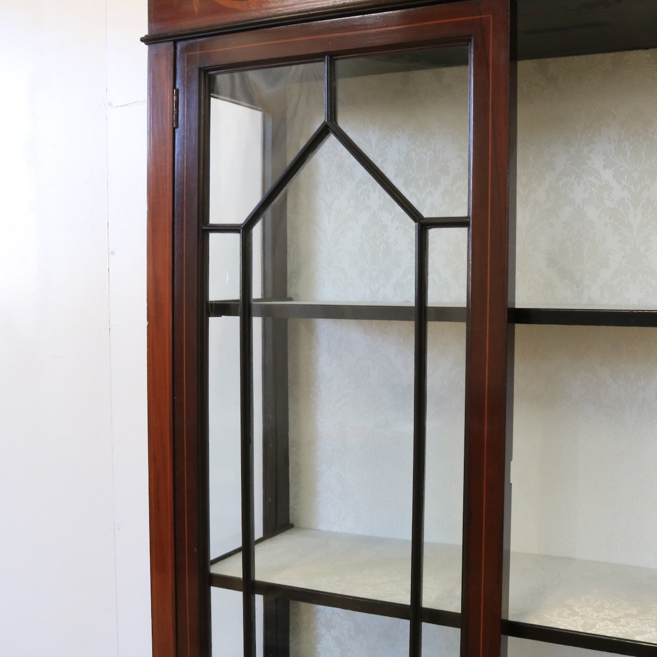 1910年代、マホガニー材のグラスキャビネット。マホガニーらしい赤みがかった上品な木の色合いに、明るい色の材を用いたインレイが美しく映えるデザイン。下段が弓形にカーブしたデザインな点もエレガントな趣を感じさせます。
