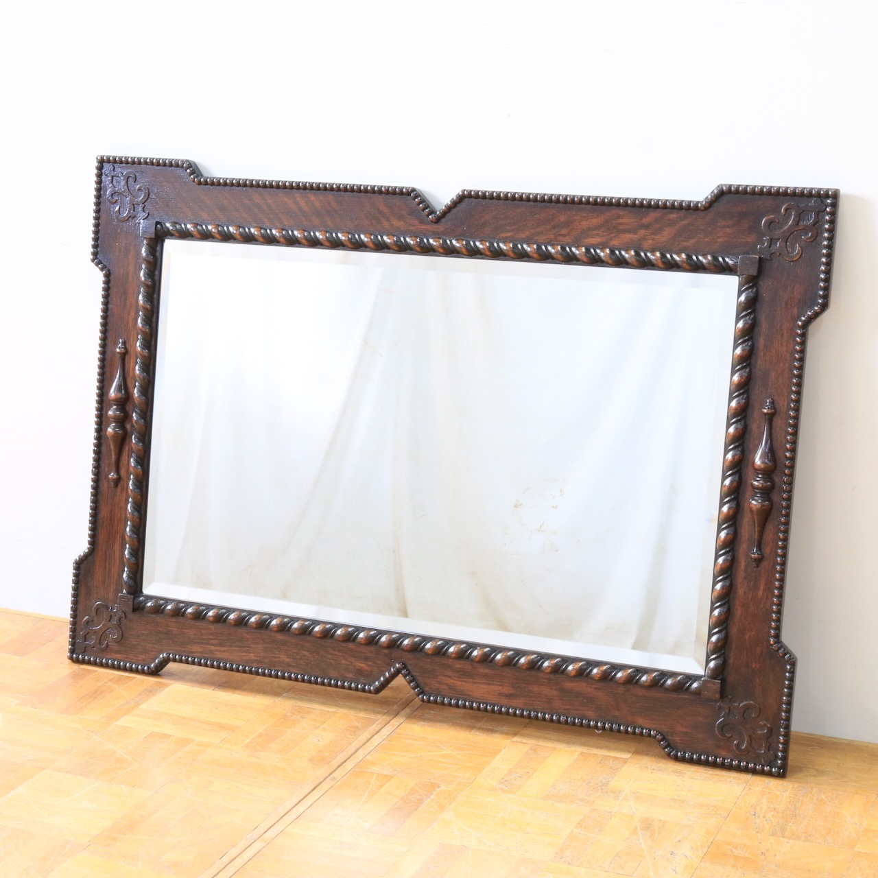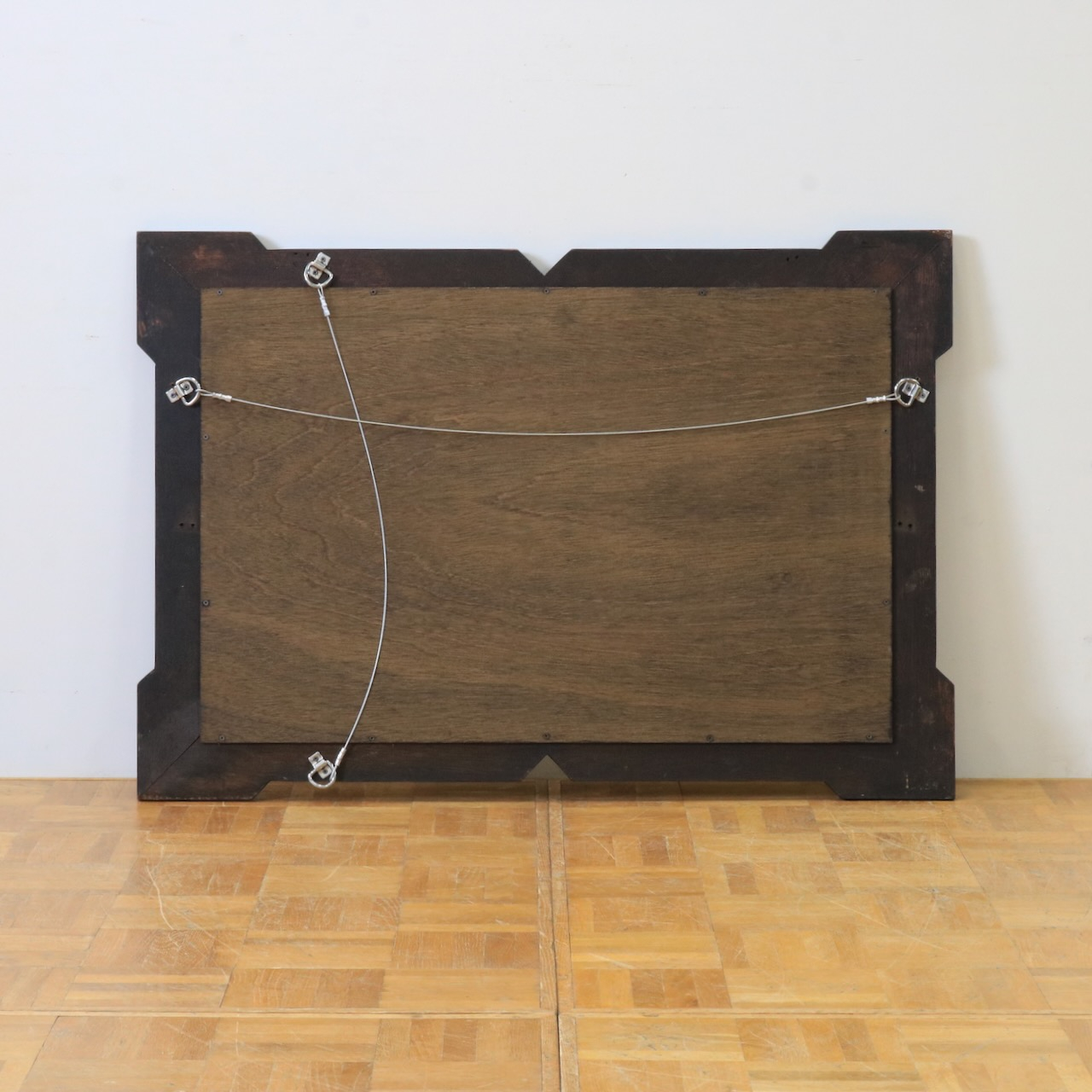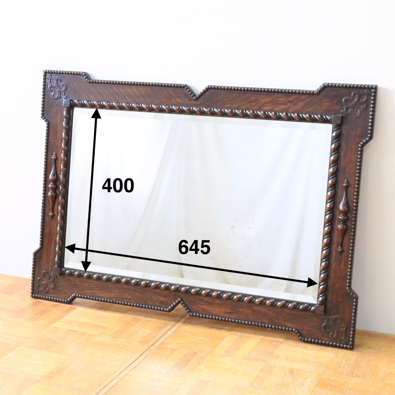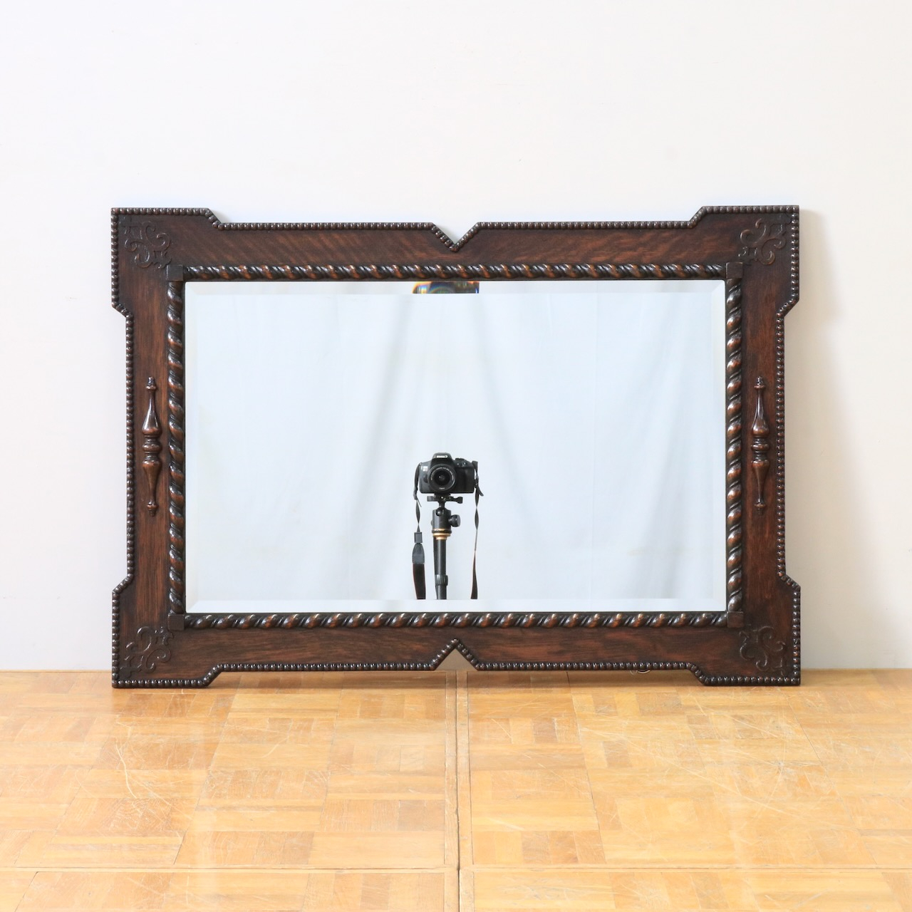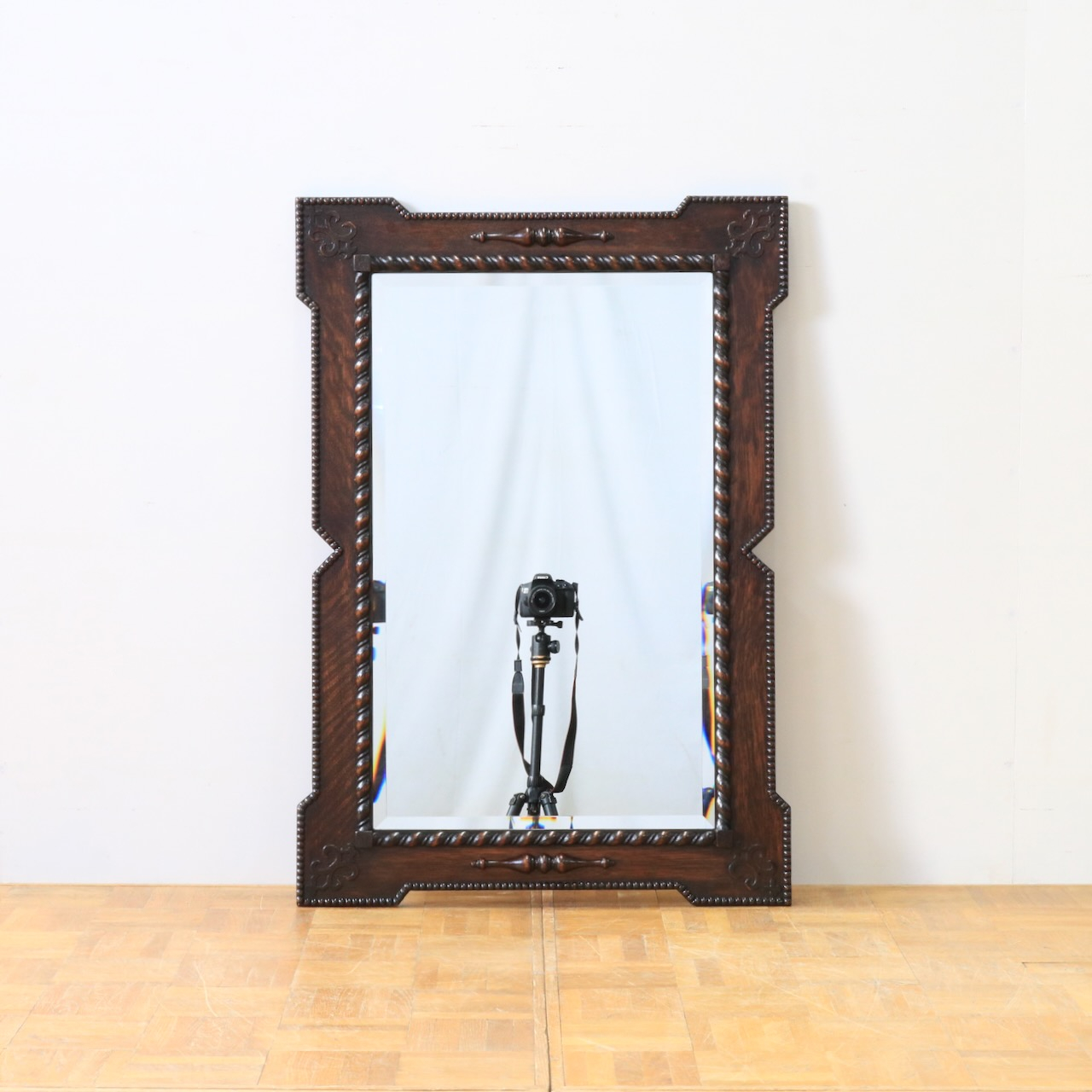 アクセントを付けてある長方形の枠に、縁飾りや彫刻装飾が付いたゴージャスで存在感のあるミラーです。